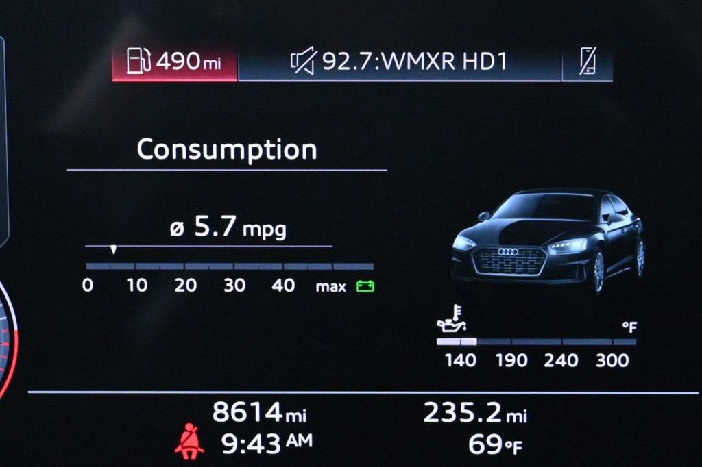 EXTREMELY LOW MILES! Get the best value from your vehicle purchase. This 2023 boasts an extremely low 8604 miles! KEY FEATURES AND OPTIONS Comes equipped with: Air Conditioning, Rear Air Conditioning, Sunroof, Front Heated Seats. This Audi A5 Sportback also includes Power Driver's Seat, Clock, Climate Control, Power Passenger Seat, Tachometer, Multi-Zone Climate Control, Memory Seat Position, Digital Info Center, Cruise Control, Homelink System, Tilt Steering Wheel, Power Steering, Telescoping Steering Wheel, Power Windows, Steering Radio Controls, Wood Trim, Power Mirrors, Moonroof, Leather Steering Wheel, Leather Shifter, Driver Airbag, ABS Brakes, Fog Lights, Passenger Airbag, Traction Control, Intermittent Wipers, Side Airbags, Dynamic Stability, Keyless Entry, Rear Defogger, Security System, AM/FM, Anti-Theft, Sliding Rear Window, Sport Seats, Center Arm Rest, Remote Trunk Lid, Vanity Mirrors, Heated Mirrors, Child Proof Door Locks, Daytime Running Lights, Side Curtain Airbags, Roll Stability Control, Power Lift Gate, Tire Pressure Monitor, Carpeted Floor Mats, Overhead Console, Heated Steering Wheel, Voice Control. Air Conditioning, Climate Control, Dual Zone Climate Control, Cruise Control, Power Steering, Power Windows, Power Mirrors, Leather Steering Wheel, Leather Shifter, Power Drivers Seat, Power Passenger Seat, Memory Seat Position, Rear Air Conditioning, Phone, Wood Trim, Clock, Tachometer, Digital Info Center, Homelink System, Tilt Steering Wheel, Telescoping Steering Wheel, Steering Wheel Radio Controls, Sunroof, Moonroof, Driver Airbag, Passenger Airbag, Side Airbags, Keyless Entry, Security System, ABS Brakes, Traction Control, Dynamic Stability, Rear Defogger, Fog Lights, Intermittent Wipers, AM/FM, Anti-Theft, Alloy Wheels, Sport Package, Leather Interior Surface, Black Optic Plus Package, Convenience Package, Premium Plus, 10 Speakers, Bang & Olufsen Sound System with 3D Sound, Radio data system, Radio: Audi Sound System, SiriusXM with 360L, Automatic temperature control, Audi Advanced Key, Power driver seat, Four wheel independent suspension, 4-Wheel Disc Brakes, Anti-whiplash front head restraints, Dual front impact airbags, Dual front side impact airbags, Emergency communication system: Audi connect CARE, Front anti-roll bar, Knee airbag, Low tire pressure warning, Occupant sensing airbag, Overhead airbag, Power adjustable front head restraints, Rear anti-roll bar, Red Brake Calipers, Power Liftgate, Brake assist, Exterior Parking Camera Rear, Auto High-beam Headlights, Delay-off headlights, Hands-On Detection Steering Wheel, Traffic Jam Assist, Audi Beam-Rings, Black Exterior Mirror Housings, Black Exterior Trim, Black Fender Badges, Black Rear Lip Spoiler, Bumpers: body-color, Dark Chrome Exhaust Tips, Heated door mirrors, Power door mirrors, Power Folding Exterior Mirrors, Turn signal indicator mirrors, 2 Rear USB Charge Ports, All-Weather Floor Mats, Aluminum Ellipse Dark Inlays, Audi Active Lane Assist, Audi Side Assist with Pre Sense Rear, Audi Virtual Cockpit Plus, Auto-dimming Rear-View mirror, Cargo Mat, Compass, Driver door bin, Driver vanity mirror, Front reading lights, Genuine wood console insert, Genuine wood dashboard insert, Genuine wood door panel insert, Heated Steering Wheel, Illuminated entry, Integrated Toll Module Delete (DISC), Leatherette Covered Center Console & Door Armrests, Outside temperature display, Overhead console, Parking System Plus (Front/Rear Acoustic Sensors), Passenger vanity mirror, Rear reading lights, Rear seat center armrest, Telescoping steering wheel, Top View Camera System, Front Center Armrest, Heated front seats, Heated Front Sport Seats, Leather Seating Surfaces, Split folding rear seat, Sport Plus Seats, Ventilated Front Seats, Passenger door bin, Wheels: 18 5-Double-Spoke Design, Wheels: 19 5-Arm-Cutter Design Bi-Color Finish, Rain sensing wipers Carpeted Floor Mats, Center Arm Rest, Child Proof Door Locks, Daytime Running Lights, Front Heated Seats, Heated Mirrors, Heated Steering Wheel, Overhead Console, Power Lift Gate, Remote Trunk Lid, Roll Stability Control, Side Curtain Airbags, Sliding Rear Window, Sport Seats, Tire Pressure Monitor, Vanity Mirrors - Contact Alvaro Uribe at 786-628-7606 or auribe@ferrariofmiami.com for more information. -
