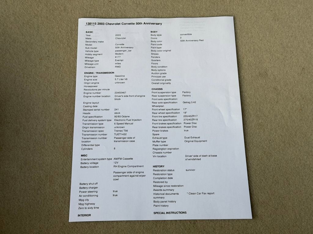 Extremely low mileage, 2 owner 50th Anniversary Corvette!! Manual transmission fully serviced with brand new set tires front and back! Memory Package, 4-Wheel Disc Brakes, 50th Anniversary Edition, 6 Speakers, ABS brakes, Adjustable Sport Bucket Seats, Air Conditioning, Alloy wheels, AM/FM radio, Automatic temperature control, Bumpers: body-color, CD player, Convertible roof lining, Delay-off headlights, Driver vanity mirror, Dual front impact airbags, Electrochromic Driver's Outside Rear-View Mirror, Electrochromic Inside Rear-View Mirror, Electronic Stability Control, ETR AM/FM Stereo w/CD Player/Seek & Scan, Four wheel independent suspension, Front 17" x 8.5" / Rear 18"x9.5" 50th Anniversary Wheels, Front 17" x 8.5"/Rear 18" x 9.5" Aluminum Wheels, Front anti-roll bar, Front Bucket Seats, Front Center Armrest, Front dual zone A/C, Front License Plate Bracket, Front reading lights, Glass rear window, Head-Up Display, Heated door mirrors, Highwear Nuance Leather Seat Trim, Highwear Nuance Leather Seat Trim w/50 Anniversary, Illuminated entry, Leather Shift Knob, Leather steering wheel, Low tire pressure warning, Magnetic Selective Ride Control, Outside temperature display, Panic alarm, Passenger cancellable airbag, Passenger vanity mirror, Power door mirrors, Power driver seat, Power passenger seat, Power steering, Power Telescopic Steering Column, Power windows, Radio data system, Rear anti-roll bar, Rear window defroster, Remote keyless entry, Security system, Speed control, Speed-sensing steering, Sport steering wheel, Tachometer, Tilt steering wheel, Traction control, Trip computer, Twilight Sentinel Headlamp Control System, Variably intermittent wipers, Voltmeter, and Weather band radio. 2003 Chevrolet Corvette PLEASE CALL (704)535-7100 TO VERIFY AVAILABILITY SAVE YOUR CASH & ASK ABOUT OUR LOW RATE FINANCING EXTENDED TERMS AVAILABLE TO QUALIFIED CLIENTELE. Odometer is 47209 miles below market average! Awards: