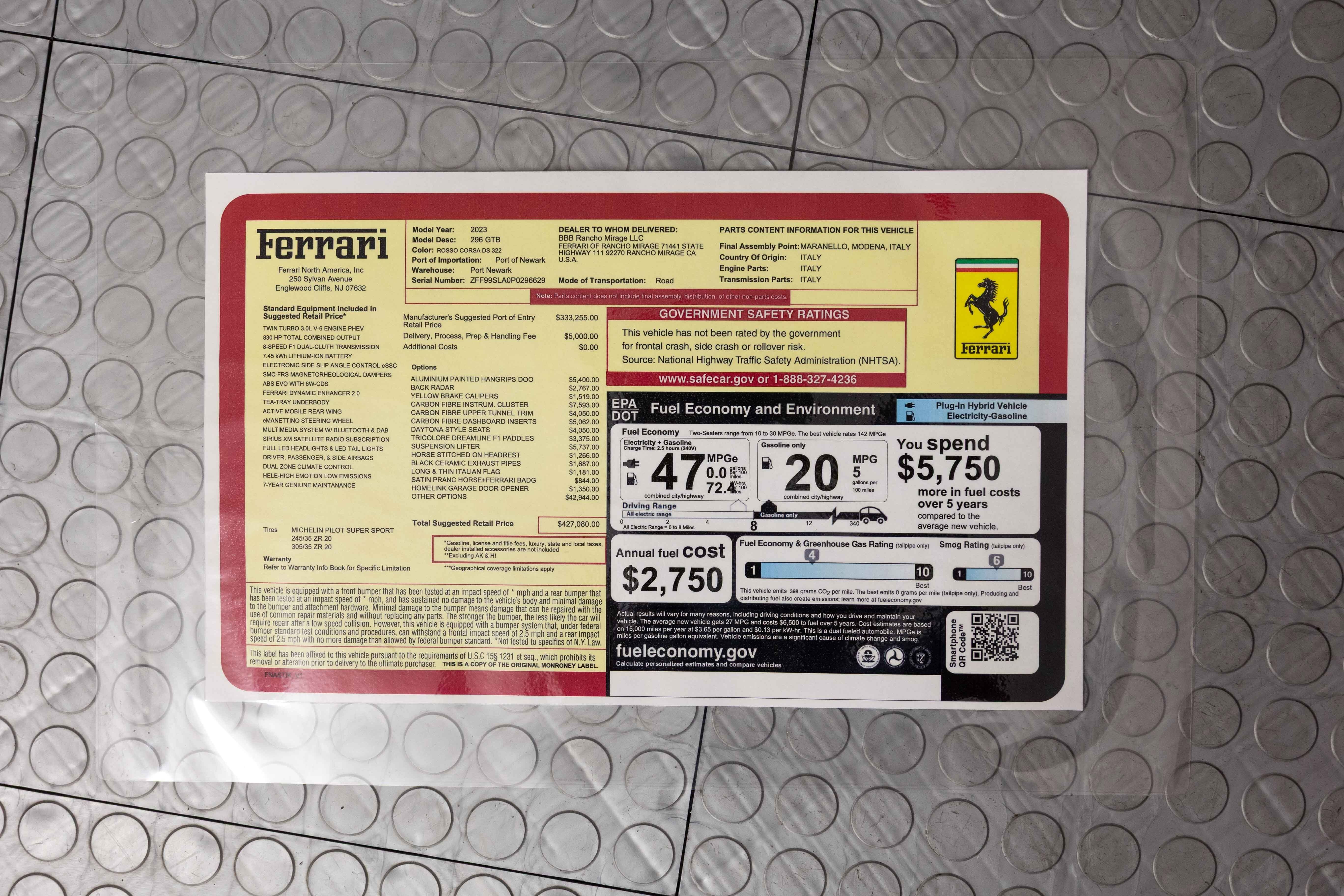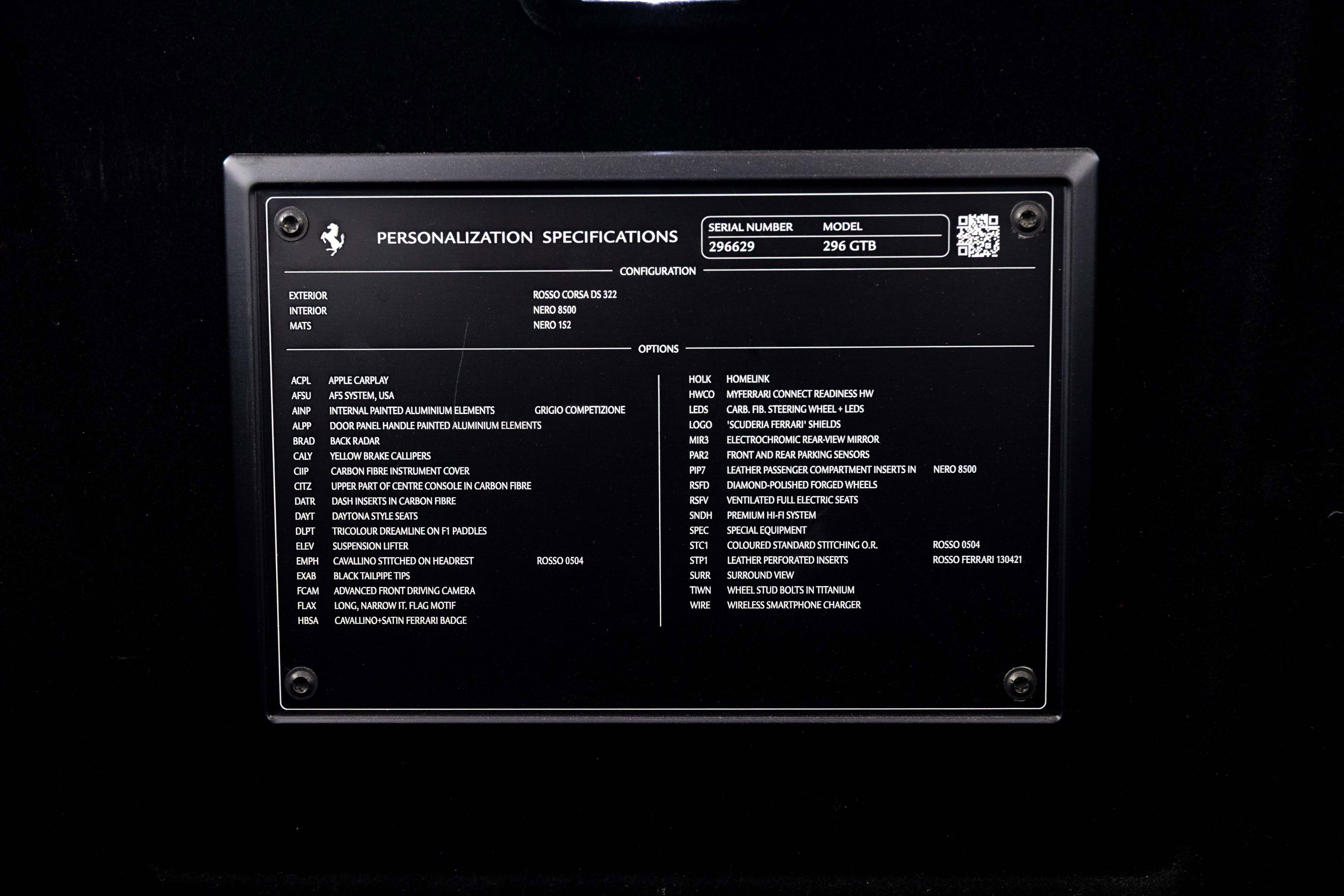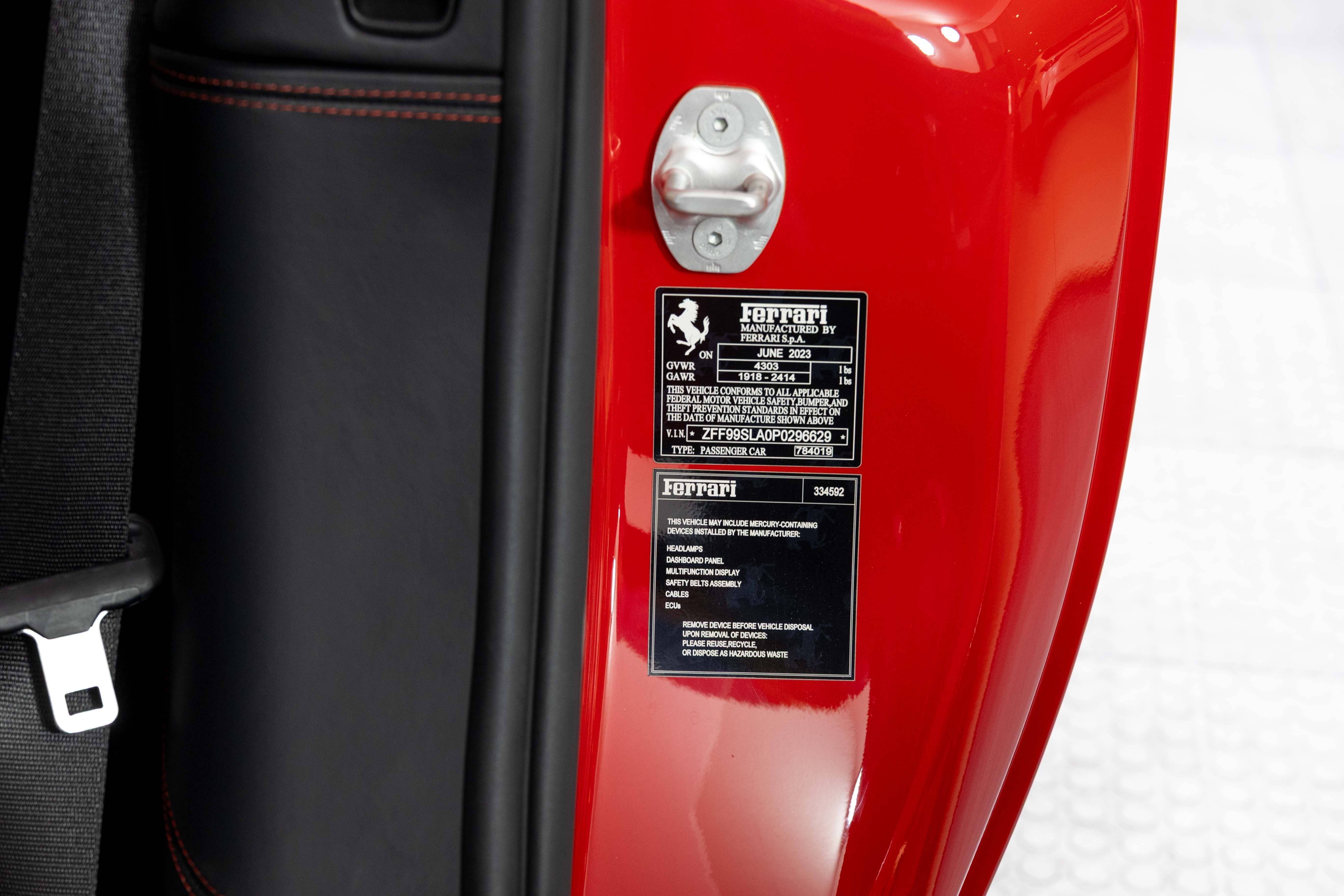 Ferrari South Bay is thrilled to bring this gorgeous, well-optioned 296 GTB to market, finished in Historic Rosso Corsa with Nero Leather Interior accented with Red Stitching. Featuring many bespoke elements, this is a unique 296 GTB that's sure to attract a crowd! The Ferrari 296 GTB is a technological marvel, blending a soul-stirring 3.0-liter Hot Vee V6 engine with an electric motor, culminating in a symphony of power totaling 816 horsepower. With its meticulous design, the car not only promises heart-pounding acceleration but also embraces advanced plug-in hybrid technology, allowing for up to ten miles of silent, electric travel. Crafted with a deep affection for performance, the Ferrari 296 GTB harmoniously marries cutting-edge engineering, aerodynamic finesse, and a devotion to the pure joy of driving. The exterior of this 296 is finished in Rosso Corsa, with Scuderia Ferrari Shields on the fenders. 20 Diamond-Polished Forged Wheels surround Carbon Ceramic Brakes with Yellow Calipers. A Long, Thin Italian Flag adorns the rear deck. The entire nose of the car has been covered in Paint Protective Film since new, so your 296 will look terrific for years to come. Inside, you'll find Nero Leather throughout the cabin, accented with Rosso Stitching (including the Cavallinos embroidered on the headrests of the Fully Electric and Ventilated Daytona Style seats). The cockpit features many pieces of Carbon Fiber, which covers the upper part of the Center Console, the Dash Inserts, Instrument Cover and the Steering Wheel (which also features Ferrari's LED Shift Lights). The Carbon Fiber F1 Shift Paddles feature Tricolore Dreamlines. A nice custom feature is the interior fittings which are normally finished in Satin Aluminum have been finished in glossy Grigio Competizione. Front and Rear Parking Sensors, Back Radar, and Surround View Camera simplify tight maneuvers, while the Vehicle Lifter helps with steep driveways. JBL Premium Sound, Apple CarPlay and a Wireless Charging Pad are welcome conveniences and simplify interacting with your Smartphone. This Certified Pre-Owned 296 GTB is offered with two keys, books, original cover, hybrid charging cable and tools. The Ferrari Factory warranty in effective through September 15, 2026 (and can easily be extended by up to two years at time of purchase). Ferrari’s Genuine Vehicle Maintenance Program covers annual services through September 15, 2030, making this 296 GTB as easy to own as it is thrilling to drive. Please contact our knowledgeable sales staff if you’d like further information or to set up a viewing. Ferrari South Bay is proudly part of Holand Automotive Group, one of North America’s leading luxury automotive retailers. We offer nationwide shipping, trade-in opportunities, financing, client consignments, and world-class delivery service. Contact us today to explore ownership of this remarkable. Please visit us at 23305 Hawthorne Blvd, Torrance, CA 90505, or call us at (888) 578-8767.