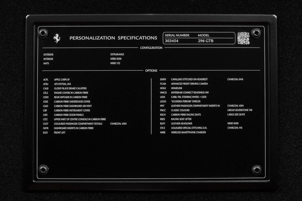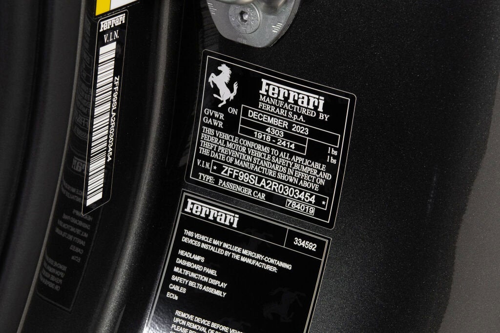 Ferrari Los Angeles is proud to offer this well optioned, low-mileage, one-owner 2024 Ferrari 296 GTB, presented in the Grigio Silverstone, paired with an interior to match. First delivered to Ferrari Westlake, this 296 GTB features a sleek configuration, flush with carbon fiber appointments which meld effortlessly into the colorway of the exterior and interior colors. The Charcoal stitching and embroidery contrasts with the Nero Leather in a subtle yet powerful way, while the functional options like the front suspension lifter and advanced front driving camera offer practical applications, taking this build to the next level. At the heart of the 296 GTB is Ferrari’s revolutionary 120 V6 plug-in hybrid powertrain, delivering an astonishing 830 cv. This groundbreaking configuration nicknamed the piccolo V12, combines cutting-edge technology with the emotional resonance of a naturally aspirated engine achieving a spine-tingling 8,500 rpm redline. With four distinct driving modes eDrive, Hybrid, Performance, and Qualify the 296 GTB offers a tailored driving experience for every journey, whether you're carving through mountain roads or cruising the coast. Exterior Options - Grigio Silverstone Paintwork Carbon Fiber Under-Door Trim Carbon Fiber Rear Diffuser Carbon Fiber Engine Compartment Black Brake Calipers Scuderia Ferrari Shields Suspension Lifter, AFS System Advanced Front Driving Camera W/ Lane Departure Warning Interior Features - Nero Leather Interior Carbon Fiber Racing Seats (L) Carbon Fiber Dashboard Air Vent Carbon Fiber Instrument Area Carbon Fiber Door Panels Carbon Fiber Center Tunnel Carbon Fiber Dashboard Accents Carbon Fiber Steering Wheel + LEDs Leather Passenger Compartment Details in Charcoal Nero Carpets Embroidered Cavallino on Headrest in Charcoal Manual Ratchet Seat Adjustment Mechanism Leather Headliner in Nero Special Stitching in Charcoal Apple Carplay Wireless Smartphone Charger Homeline Garage Access Control The original Ferrari Factory Warranty is in effect until 03/27/2027. Ferrari’s 4 Year Warranty Extension for the HV System is in effect until 03/27/2031. Ferrari Genuine Maintenance 7 Year Program is in effect until 03/27/2031. Please contact the Ferrari Los Angeles Sales Team for further details or to schedule your private consultation.