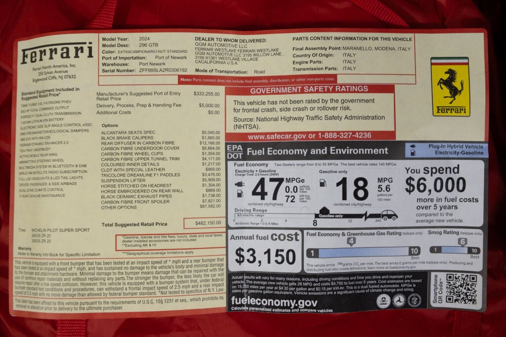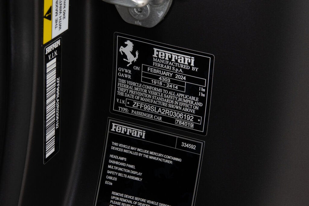 Ferrari Westlake is proud to offer this impeccably optioned, low-mileage 2024 Ferrari 296 GTB, presented in the breathtaking Canna Di Fucile Opaco a matte finish that perfectly complements the vehicle’s sculpted silhouette. Accentuated with glossy carbon fiber elements throughout, the exterior makes a commanding statement of sophistication and performance. Inside, the cabin is a harmonious blend of form and function. Nero Alcantara racing seats, tastefully trimmed in Bianco accents, evoke a sense of tailored elegance. Every stitch and surface showcases Ferrari’s unmatched craftsmanship and attention to detail, setting a new standard for mid-engine luxury sports cars. It is a stunning expression of innovation and Italian artistry, this 2024 Ferrari 296 GTB is more than a car it’s an experience. At the heart of the 296 GTB is Ferrari’s revolutionary 120 V6 plug-in hybrid powertrain, delivering an astonishing 830 cv. This groundbreaking configuration nicknamed the piccolo V12, combines cutting-edge technology with the emotional resonance of a naturally aspirated engine achieving a spine-tingling 8500 rpm redline. With four distinct driving modes eDrive, Hybrid, Performance, and Qualify the 296 GTB offers a tailored driving experience for every journey, whether you're carving through mountain roads or cruising the coast. Exterior Options: Canna Di Fucile Opaco (Matte Finish) Carbon Fiber Front Spoiler & Under-Door Trims Forged Diamond Wheels with Titanium Wheel Studs Carbon Fiber Center Caps Black Brake Calipers Sports Tailpipe Tips Satin Prancing Horse Badging Long Thin Italian Flag on Rear Spoiler Interior Features: Nero Leather & Alcantara Upholstery Bianco Contrast Stitching & Interior Accents Carbon Fiber Racing Seats with Manual Height Adjustment Embroidered Cavallino Emblems in Bianco on Headrests Long Thin Italian Flag Stitched on Headrest Leather Headliner in Nero Carbon Fiber Steering Wheel with Integrated LEDs & Tricolor Dreamline F1 Paddles Carbon Fiber Center Tunnel Upper Trim Apple CarPlay & Wireless Smartphone Charger Front and Rear Suspension Lifter AFS Lighting System Lane Departure Warning HomeLink Integration Electrochromic Rearview Mirrors Warning, Home-Link, Electrochromic rearview mirrors Wireless Smartphone Charger AFSU System (Adaptive Front Headlights) The original Ferrari Factory Warranty is in effect until 06/17/2027. Ferrari’s 4 Year Warranty Extension for the HV System is in effect until 06/17/2031. Ferrari Genuine Maintenance 7 Year Program is in effect until 06/17/2031. Please contact the Ferrari Westlake Sales Team for further details or to schedule your private consultation.