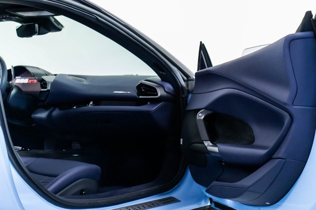 316090 Exterior: Azzurro La Plata Interior: Blu Sterling Mats: Blu 2025 Ferrari 296 GTB Options: Dual Color Leather Int. Trim in Blu Sterling Cavallino Stitched on Headrest Thread in Giallo Leather Passenger Compartment Inserts in Blu Sterling Special 2-Layer Colors in Azzurro La Plata Colored Steering Wheel in Blu Sterling This 2025 Ferrari 296 GTB is strikingly finished in the rare and elegant Azzurro La Plata two-layer paint, beautifully complemented by a refined Blu Sterling interior with matching Blu mats for a cohesive, upscale presentation. The dual-color leather interior trim and leather passenger compartment inserts in Blu Sterling create a sophisticated cockpit atmosphere, while the Blu Sterling steering wheel adds a bespoke, driver-focused touch. Contrasting Giallo Cavallino stitching on the headrests provides a subtle motorsport-inspired accent, perfectly balancing luxury and performance. With its tailored color palette and modern mid-engine design, this 296 GTB delivers an exclusive and visually captivating interpretation of Ferraris next-generation supercar.