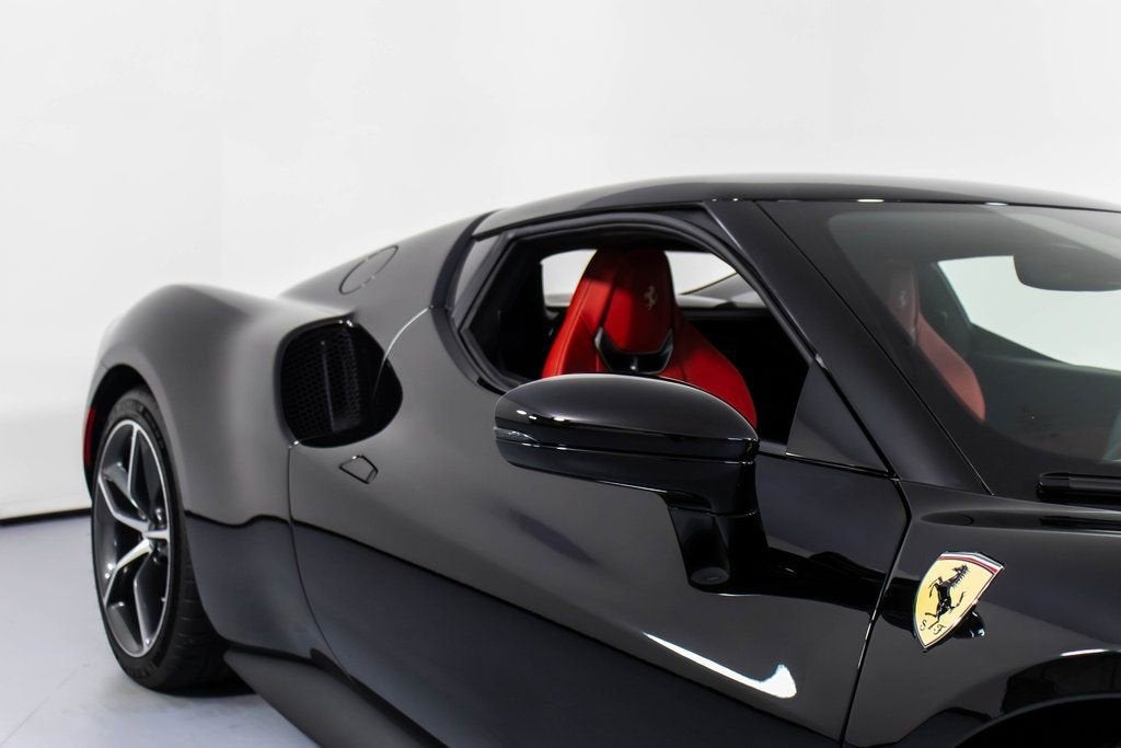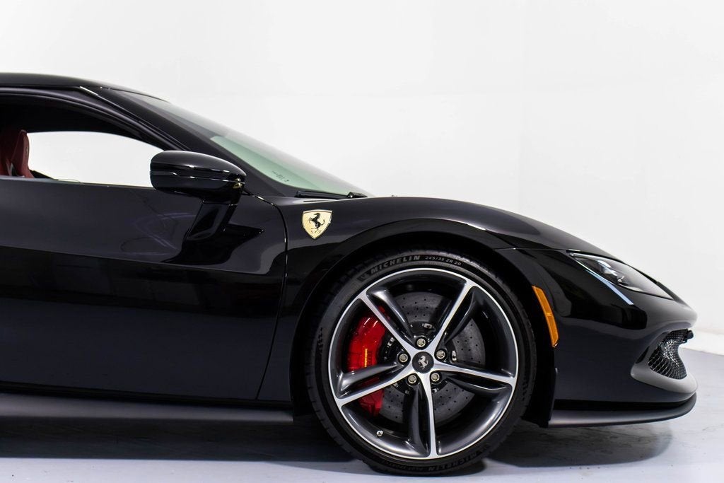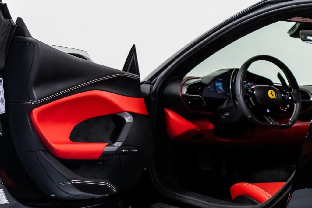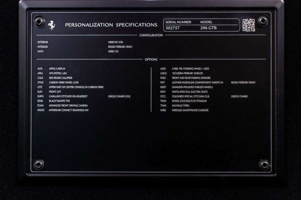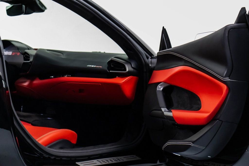 302757 Exterior: Nero Interior: Rosso Ferrari Mats: Nero 2024 Ferrari 296 GTB Options: Apple CarPlay AFS System Red Brake Calipers Carbon Fiber Wheel Cups Upper Part of Center Console in Carbon Fiber Front Lift Cavallino Stitched on Headrest in Grigio Chiaro Black Tailpipe Tips Advanced Front Driving Camera MyFerrari Connect Readiness HW Carb. Fib. Steering Wheel + LEDS 'Scuderia Ferrari' Shields Front and Rear Parking Sensors Leather Passenger Compartment Inserts in Rosso Ferrari Diamond-Polished Forged Wheels Ventilated Full Electric Seats Colored Special Stitching O.R. Grigio Chiaro Wheel Stud Bolts in Titanium Wireless Smartphone Charger This striking 2024 Ferrari 296 GTB embodies power and elegance, presented in a bold Nero exterior paired with a vivid Rosso Ferrari interior and Nero mats for a dramatic contrast. Combining performance and sophistication, this 296 GTB is equipped with red brake calipers, diamond-polished forged wheels, and carbon fiber wheel cups, emphasizing its racing DNA. The interior exudes Ferrari craftsmanship with ventilated full electric seats, Rosso Ferrari leather inserts, and Grigio Chiaro stitching, complemented by the Cavallino stitched on the headrests. Enhanced with premium features like the carbon fiber steering wheel with LEDs, upper carbon fiber center console, and front lift system, this Ferrari is designed for both comfort and control. Technology meets performance with Apple CarPlay, advanced front driving camera, and MyFerrari Connect Readiness HW, while Scuderia Ferrari shields, titanium wheel studs, and black tailpipe tips complete the look of this refined, high-performance masterpiece.