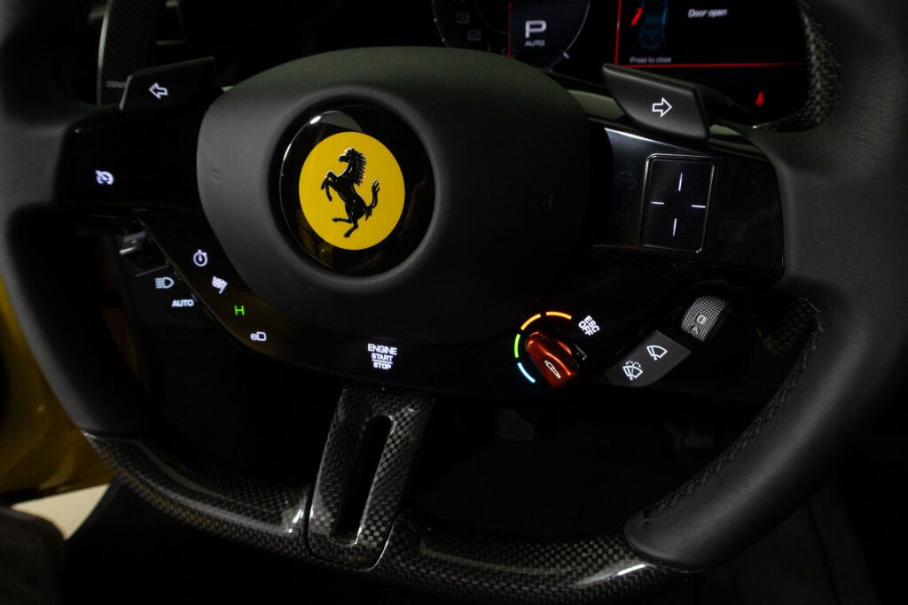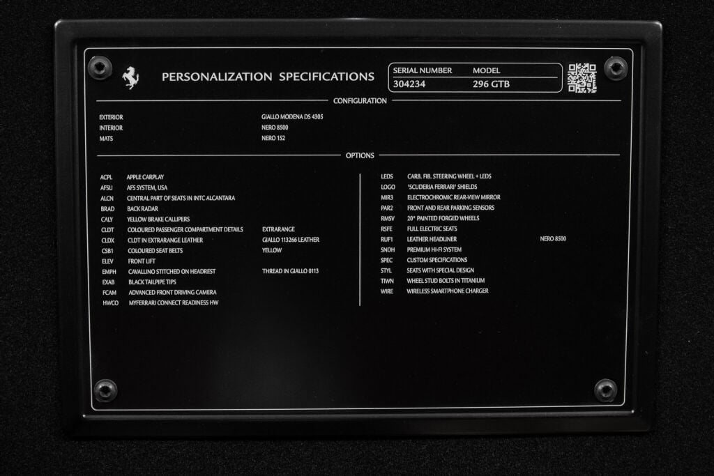 Ferrari Beverly Hills is excited to present this one-owner 2024 Ferrari 296 GTB. Ordered in striking Giallo Modena with Nero interior, this 296 has covered just 79 miles on the road and as expected, is in as-new condition. The 296 boasts a powerful 3.0L V6 twin-turbo engine + electric with a total power output of 830cv (818 hp). Propelled from 0-60 mph in just 2.9 seconds, it ultimately tops out at 205 mph thanks to its advanced plug-in hybrid technology. Further enhancing the 296 experience is a driver-focused cockpit with ergonomic controls featuring an advanced infotainment system with Apple CarPlay. This Ferrari 296 GTB is more than just a car; it's a statement of speed, luxury, and advanced engineering. Whether you're cruising on open roads or pushing the limits on a track, the 296 GTB is designed to make every drive unforgettable. The original Ferrari Factory warranty is active until 4/6/2027. Ferrari's 7-year Maintenance Program includes scheduled maintenance free of charge until 4/6/2031. This 296 GTB is eligible for CPO certification upon request. Exterior Options: Yellow brake calipers (CALY) Black tailpipe tip (EXAB) Scuderia Ferrari shields on fenders (LOGO) Forged wheels, gloss Brilliant Silver finish (RMSV) Titanium wheel bolts (TIWN) AFS headlights (AFSU) Blind Spot Detection and rear radar (BRAD) Front suspension lift (ELEV) Interior Options: Center part of seat in color-matched Alcantara (ALCN) Leather passenger compartment details in Pelle Gialla (CLDT) Colored seat belts (Yellow) (CSB1) Embroidered Cavallino emblem on headrest (Yellow) (EMPH) Carbon fiber steering wheel with LEDs (LEDS) Full-electric seats (RSFE) Leather headliner in Nero (Black) (RUF1) Style seats (STYL) Apple CarPlay (ACPL) Advanced Front Driving Camera with Lane Departure Warning (FCAM) MyFerrari Connect (HWCO) Electrochromic exterior rear view mirror (MIR3) Front and rear parking sensors (PAR2) Premium Hi-Fi system (SNDB) Wireless smartphone charger (WIRE) Don’t miss out on the opportunity to own this iconic Ferrari. Contact us today to schedule a private viewing of this Ferrari 296 GTB for yourself.