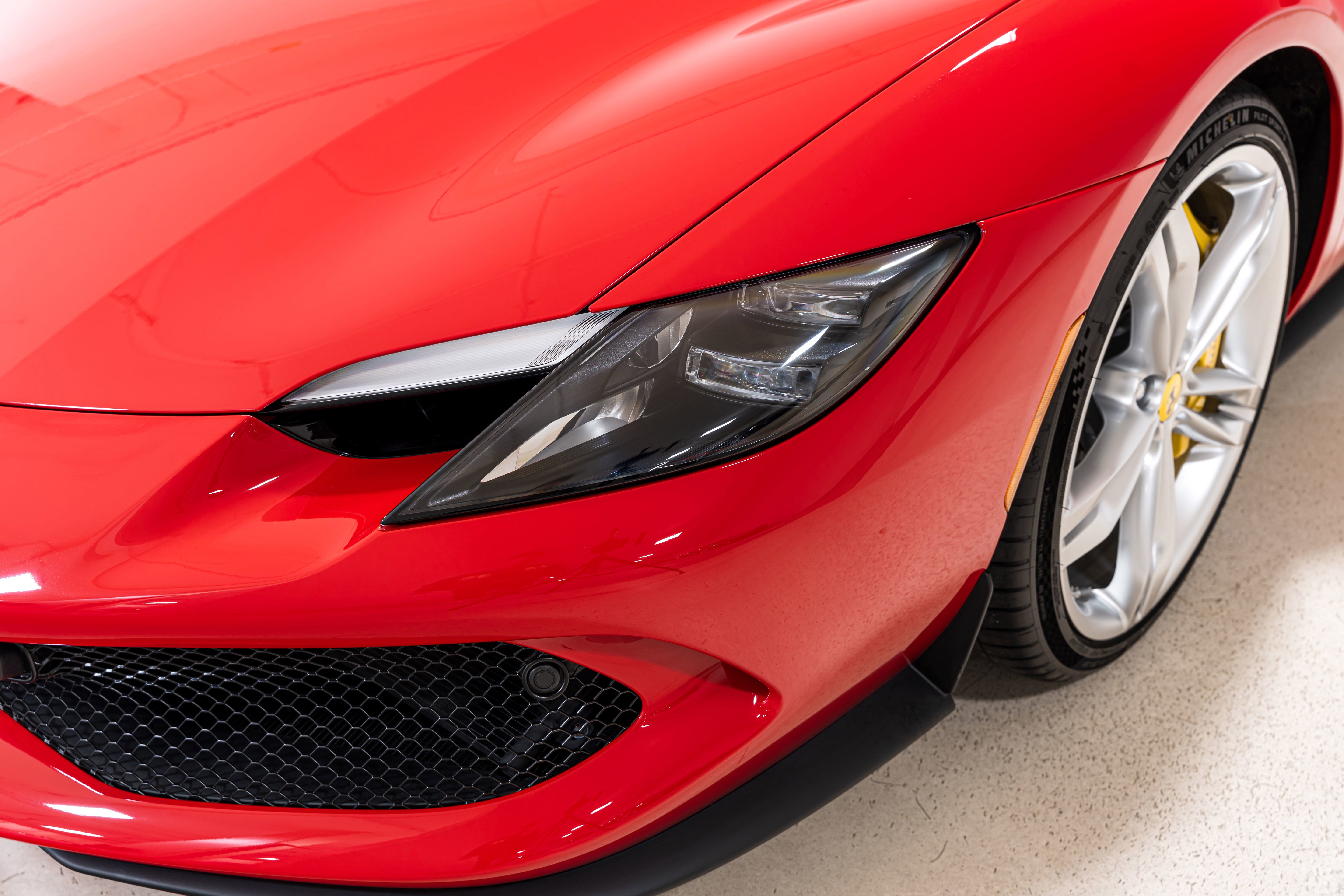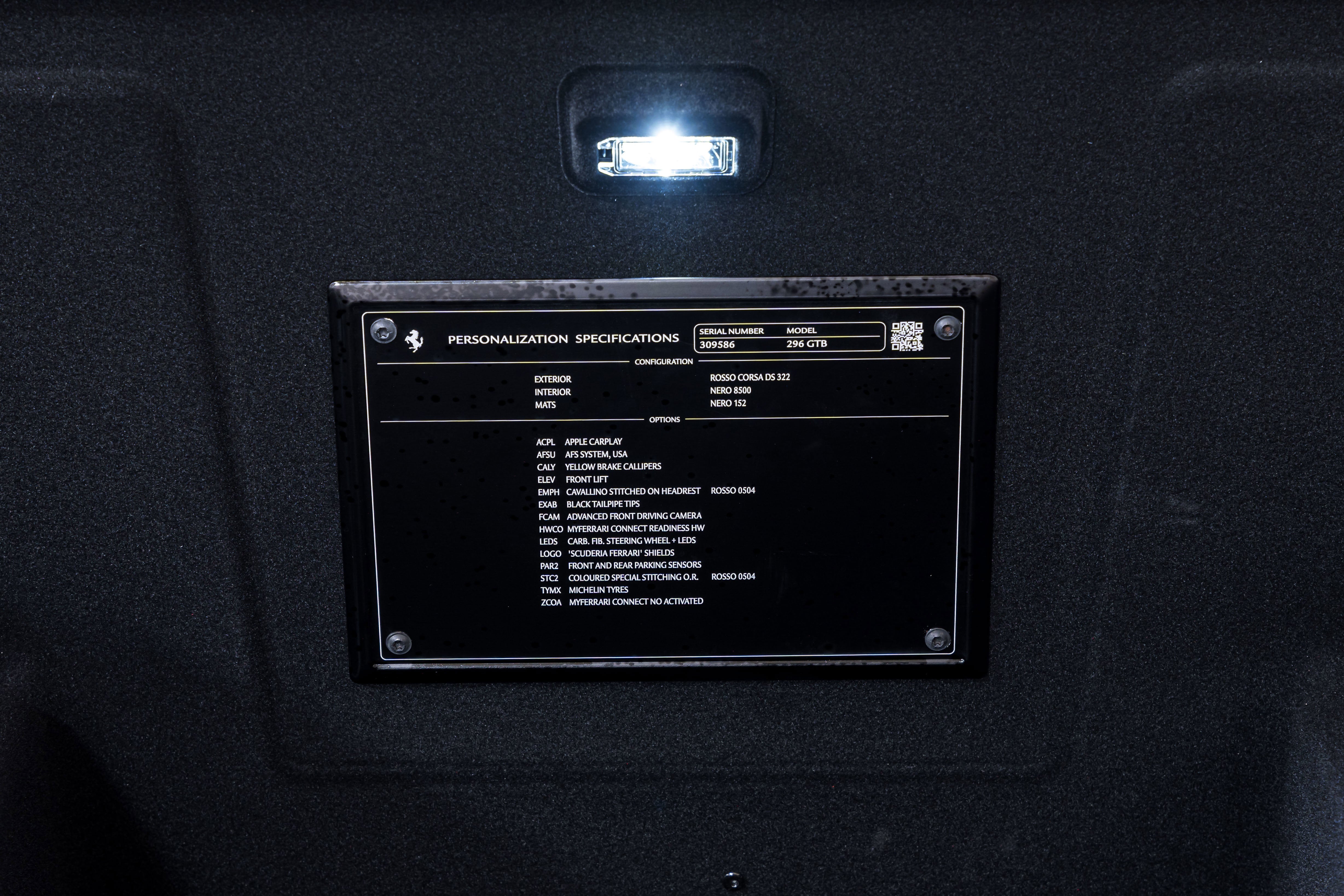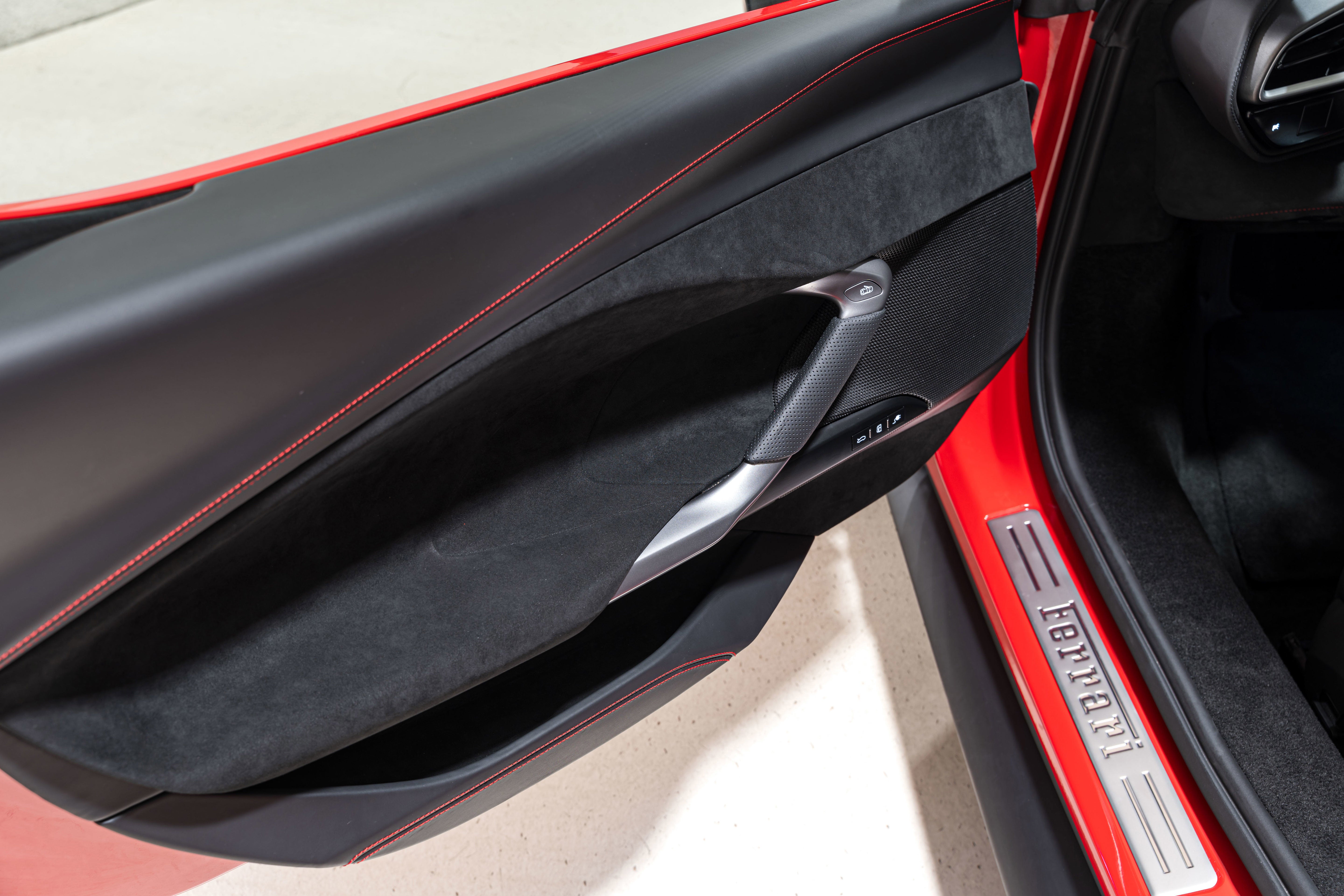 • Finished in timeless Rosso Corsa, this 296 GTB pairs Ferrari's most iconic exterior colour with striking Giallo accents, including Scuderia Ferrari shields and matching Giallo brake calipers---creating a bold, motorsport-inspired presence. The exterior has been meticulously preserved with full paint protection film, ceramic coating, and windshield film, ensuring lasting protection and a flawless appearance.