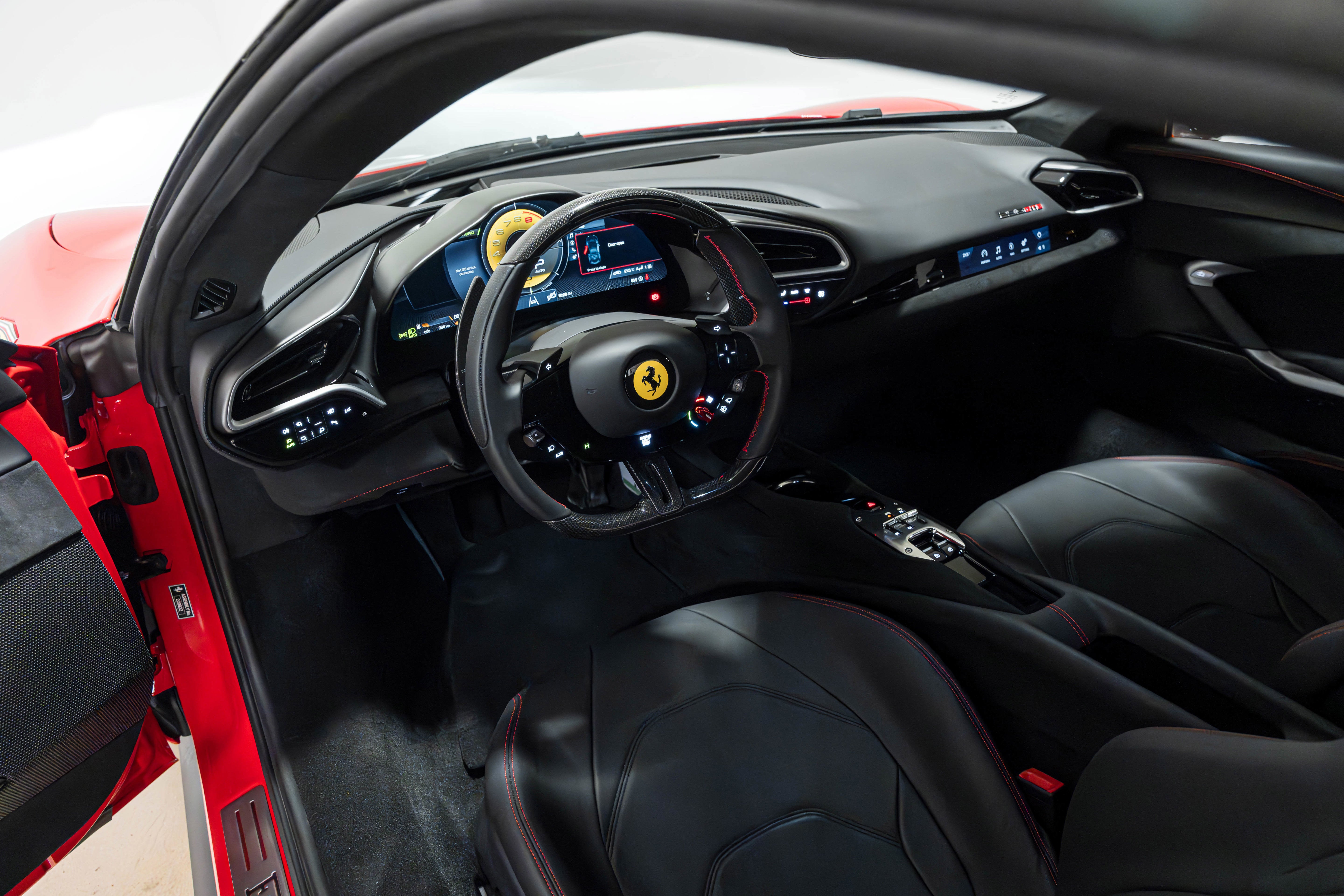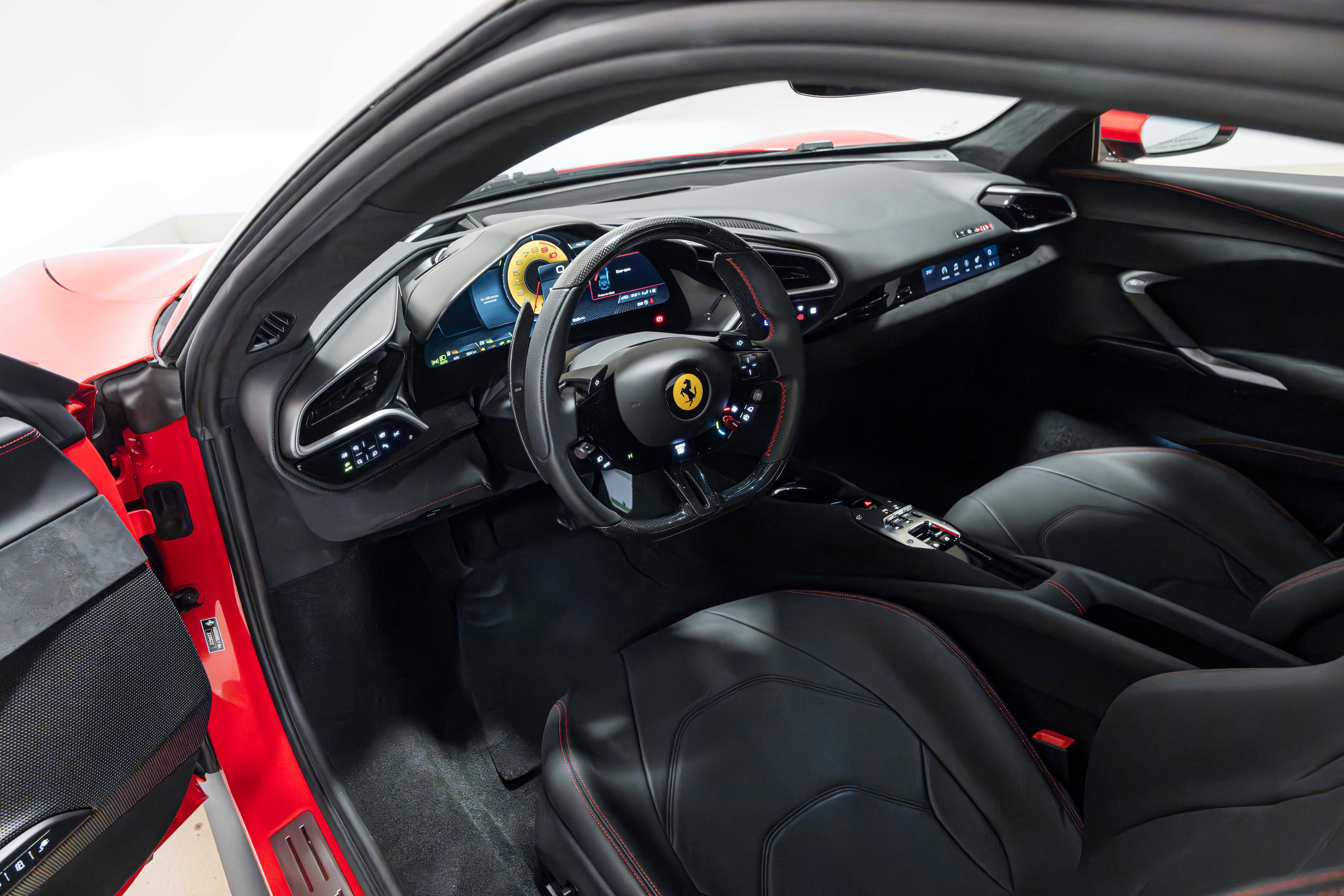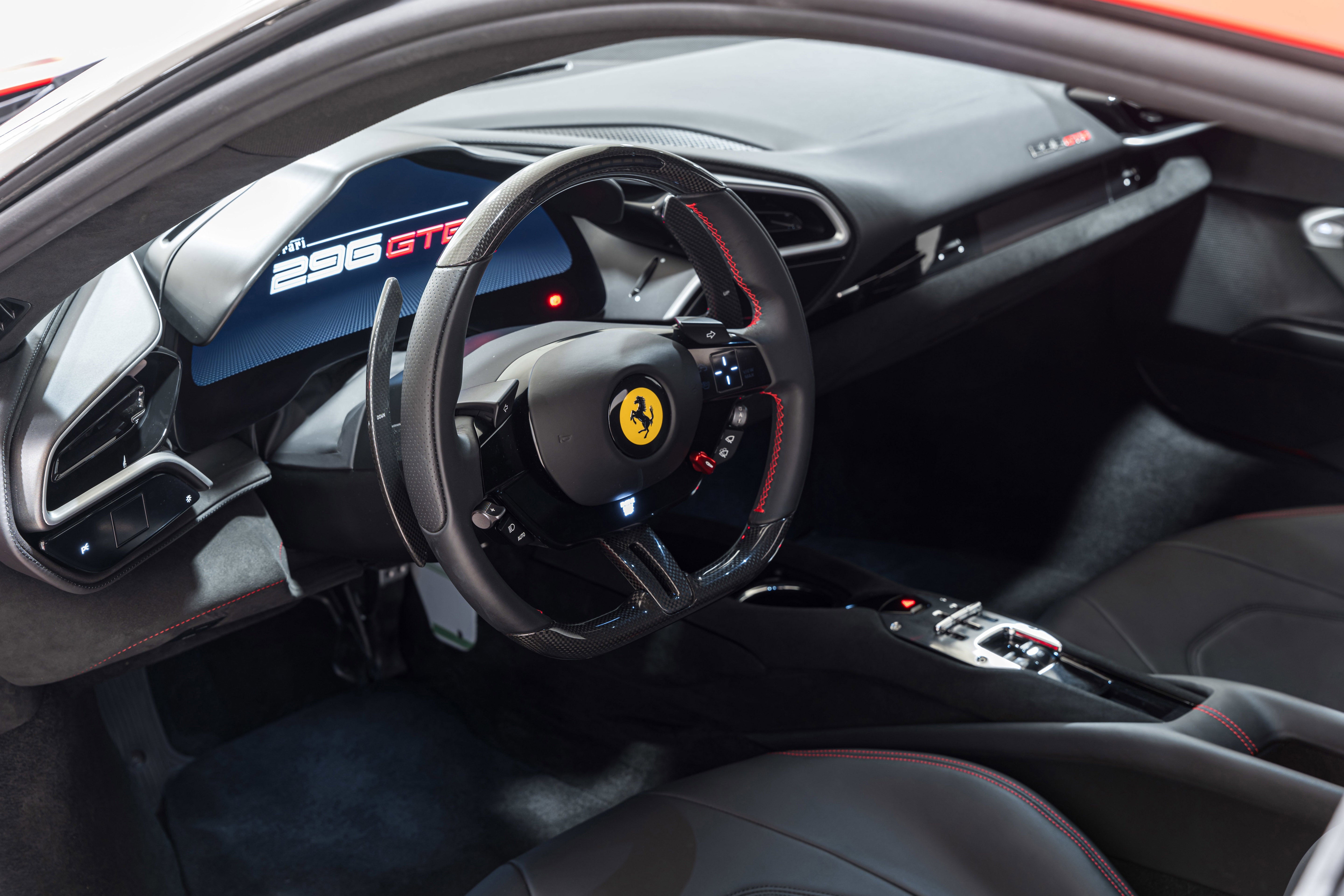 • Inside, the Nero leather interior is appointed with 18-way adjustable seats, offering exceptional comfort and customization for both road and track use. Exposed Rosso stitching throughout the cabin provides a seamless visual link to the exterior, while performance materials such as carbon fiber trim reinforce the 296 GTB's racing DNA. The cockpit is anchored by Ferrari's carbon fibre steering wheel with integrated LED shift lights, placing control and feedback directly in the driver's hands.