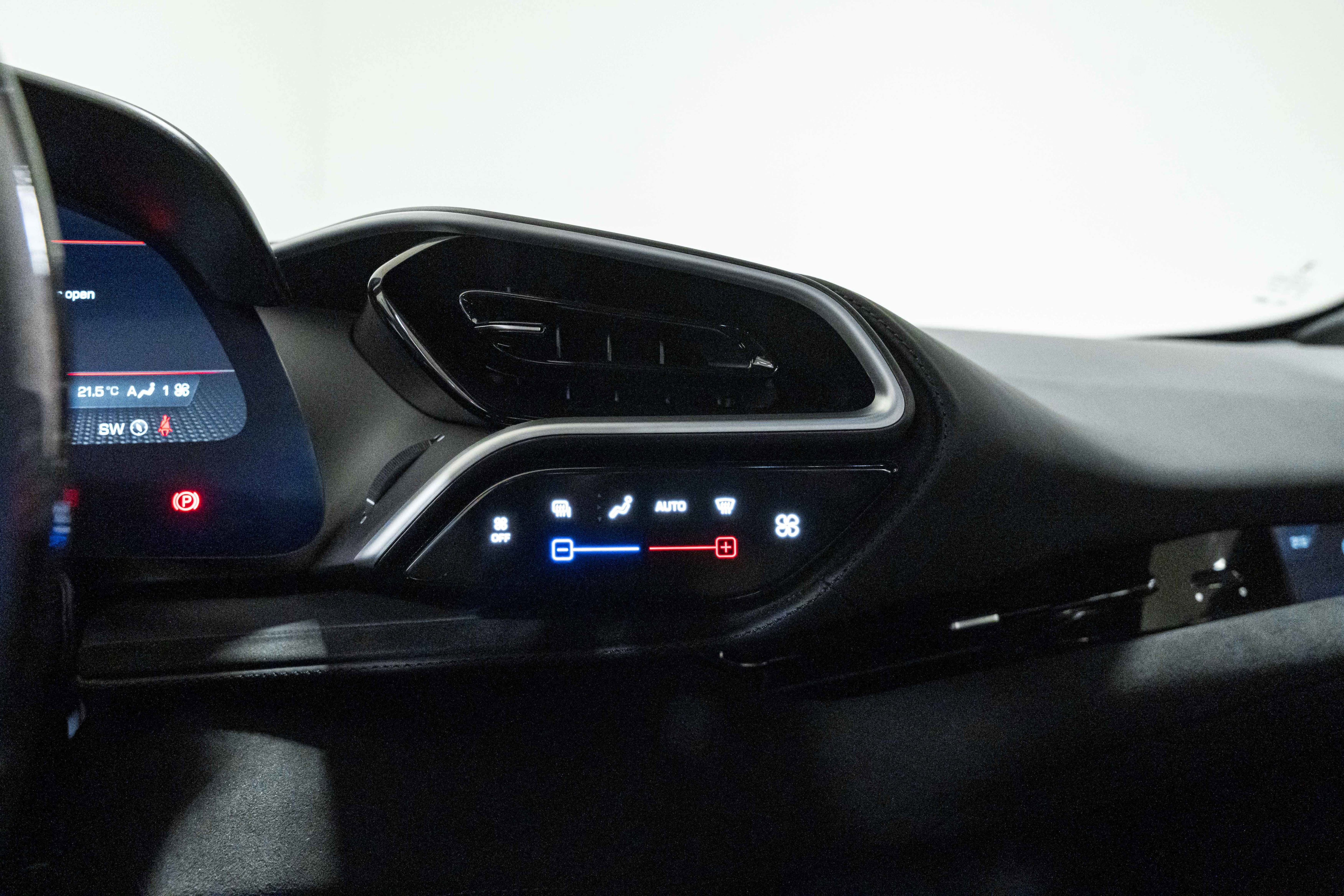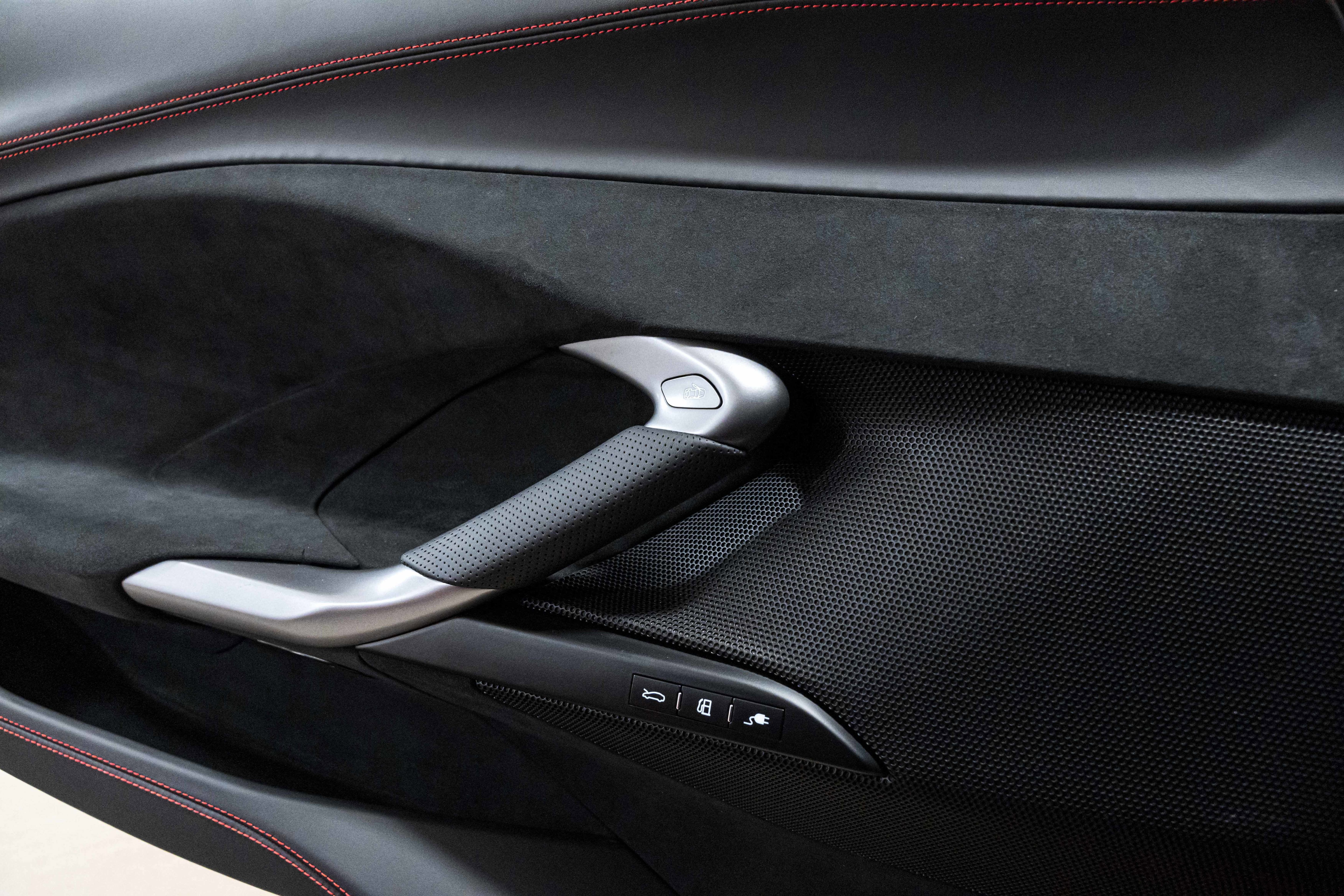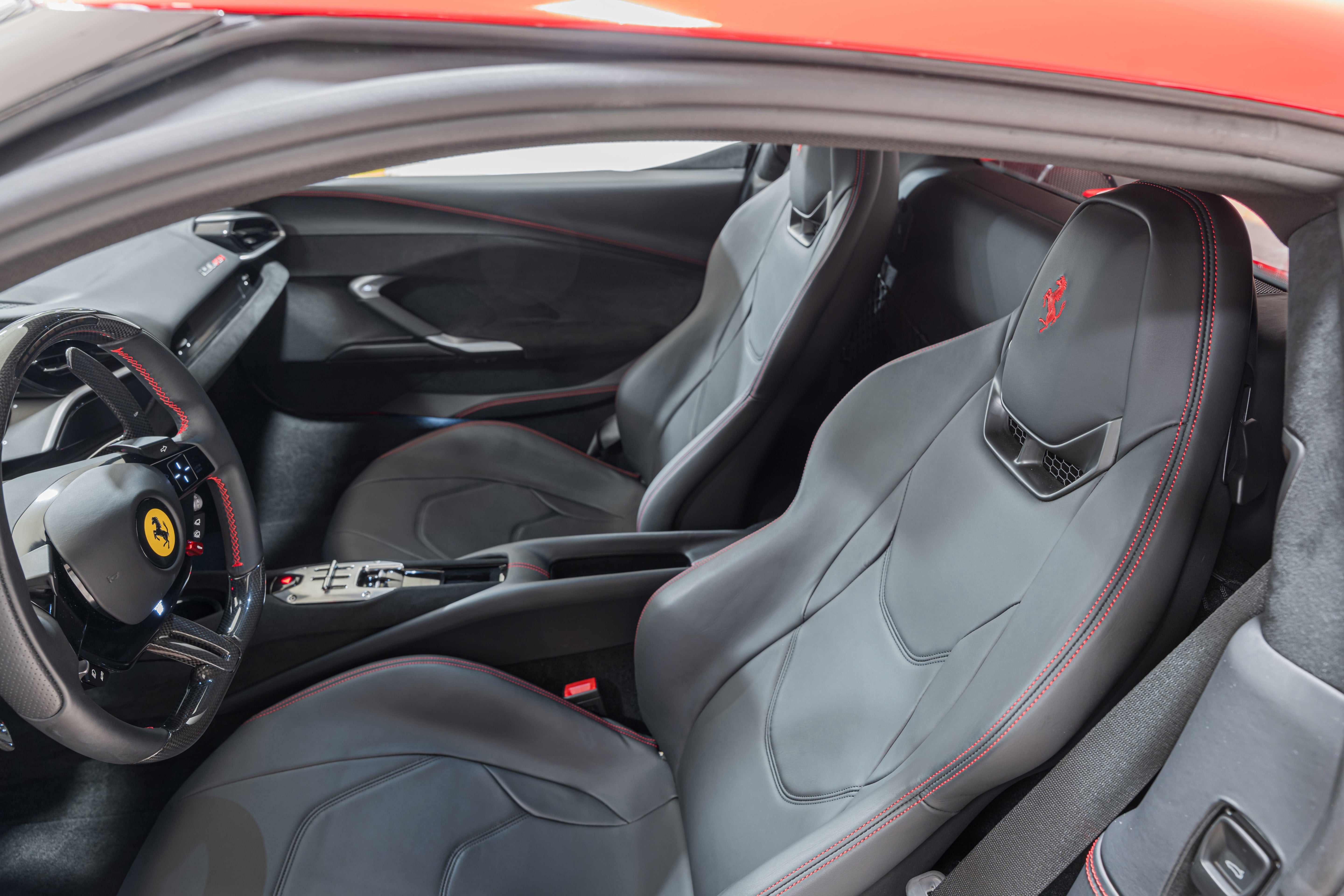 • Inside, the Nero leather interior is appointed with 18-way adjustable seats, offering exceptional comfort and customization for both road and track use. Exposed Rosso stitching throughout the cabin provides a seamless visual link to the exterior, while performance materials such as carbon fiber trim reinforce the 296 GTB's racing DNA. The cockpit is anchored by Ferrari's carbon fibre steering wheel with integrated LED shift lights, placing control and feedback directly in the driver's hands.