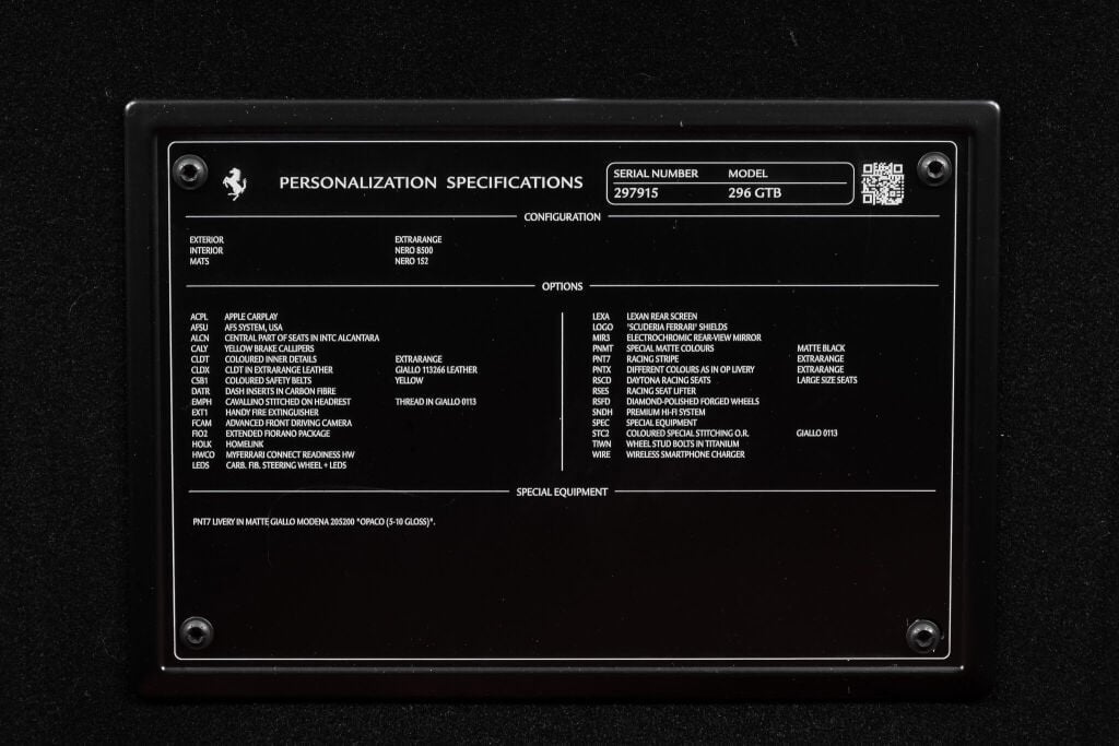 Ferrari Westlake is proud to offer this impeccably optioned, 2023 Ferrari 296 GTB, presented in Nero Opaco, a breathtaking matte finish that perfectly complements the vehicle’s sculpted silhouette. Sporting the Assetto Fiorano Package with a Matte Giallo Modena racing livery, this configuration exudes the capability of Ferrari's design prowess on their latest mid-rear-engine model. Inside, the cabin is a harmonious blend of form and function. Nero Alcantara Daytona racing seats, tastefully trimmed in Giallo accents, evoke a sense of tailored elegance. Every stitch and surface showcases Ferrari’s unmatched craftsmanship and attention to detail, setting a new standard for mid-engine luxury sports cars. It is a stunning expression of innovation and Italian artistry, this 2023 Ferrari 296 GTB is more than a car it’s an experience. The Ferrari 296 GTB marks a revolutionary chapter in Maranello’s history as the first V6-powered Ferrari road car with plug-in hybrid technology. Its 2.9-liter twin-turbo V6 and electric motor combine to produce a staggering 819 horsepower, enabling 0 to 60 mph in just 2.9 seconds. Compact, agile, and emotionally engaging, the 296 GTB draws inspiration from Ferrari’s innovative 1960s V6 race cars while embracing the future of performance. This Ferrari is protected by a full vehicle paint protection film. Exterior Options: Nero Opaco (Matte Finish) Forged Diamond Wheels (RSFD) Titanium Wheel Studs (TIWN) Lexan Rear Screen (LEXA) Giallo Brake Calipers (CALY) Scuderia Ferrari Shield (LOGO) Racing livery in Matte Giallo Modena (PNT7) Fiorano Package Extended (FIO2) Interior Features: Nero Alcantara Upholstery (ALCN) Nero Carpets (CRPT) Daytona Carbon Fiber Racing Seats (RSCD) Manual Height Adjustment (RSES) Embroidered Cavallino on Headrest in Giallo (EMPH) Giallo Inner Color Seat Insert (CLDX) Giallo Contrast Stitching (STC2) Giallo Seat Belts (CSB1) Carbon Fiber Steering Wheel with Integrated LEDS (LEDS) Leather Passegner Compartment (CLDT) Hand-Held Fire Extinguisher (EXT1) Apple CarPlay & Wireless Smartphone Charger (ACPL) Lane Departure Warning (FCAM) Home-Link (HOLK) Electrochromic rearview mirrors (MIR3) Wireless Smartphone Charger (WIRE) Adaptive Front Headlights (AFSU) HIFI Sound System (SNDH) The original Ferrari Factory Warranty is in effect until 09/27/2026. Ferrari’s 4 Year Warranty Extension for the HV System is in effect until 09/27/2030. Ferrari Genuine Maintenance 7 Year Program is in effect until 09/27/2030. Please contact our Ferrari Westlake Sales Team for further information or to schedule a viewing appointment.