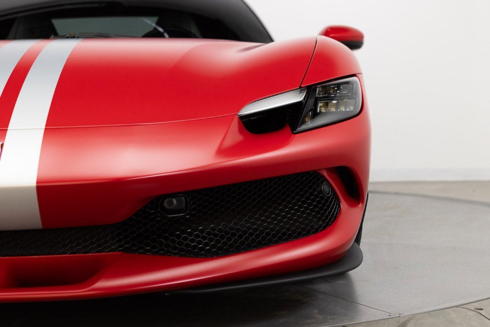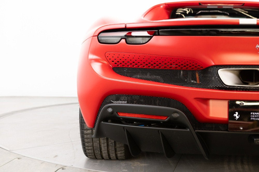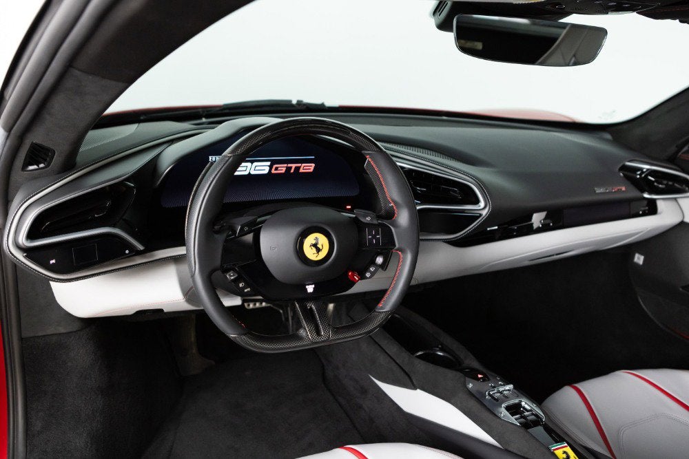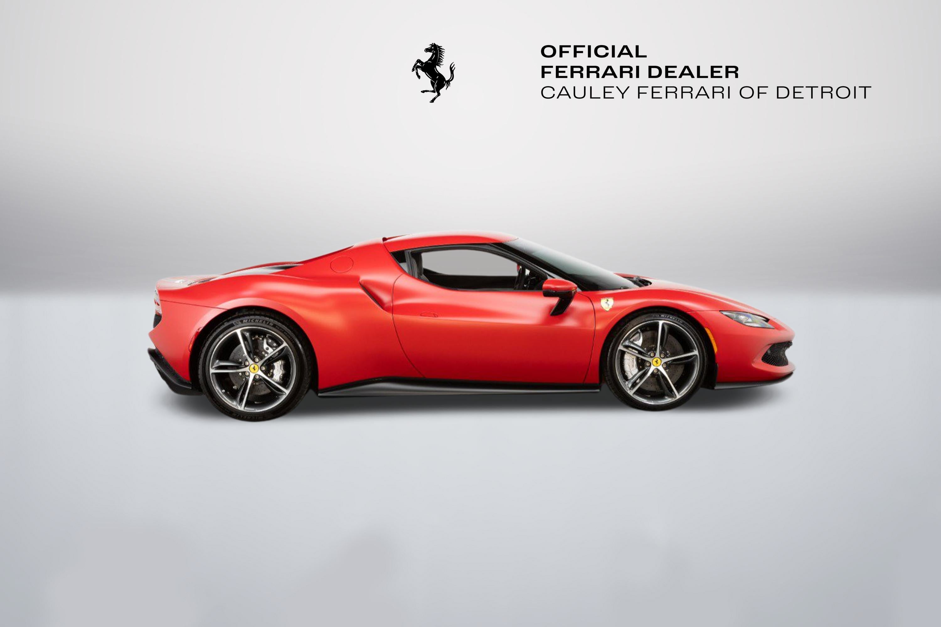 Cauley Ferrari of Detroit is excited to offer you this 2024 296 GTB finished in Rosso Ferrari F1-75 Opaco with Argento Nurburgring Opaco Stripes over a Grigio Corvara interior with Rosso Giudecca accents. This is a very well spec'd model that was designed through the New York Atelier studio. Optioned with Apple CarPlay, Front Lift, Carbon Fiber Steering Wheel + LEDs, Front and Rear Parking Sensors, and much more. The full options list can be seen below. We are selling this as a Ferrari Certified Pre-Owned vehicle. The remaining factory warranty runs through 9/6/2027and will be followed by an additional year of factory Bumper-to-Bumper Coverage through 9/6/2028. The free scheduled maintenance plan is in effect until 9/6/2031. Give us a call at 248-538-9600 to set up an appointment for a closer look or stop by our showroom in West Bloomfield, MI. Please ask us about our financing and leasing options available through Ferrari Financial Services (FFS). We can offer you monthly financing as far out as 84 months, Balloon financing up to 60 months, as well as Open-End Leasing scenarios. FFS is available on all new and pre-owned Ferrari models. These flexible payment options really make getting into a Ferrari easier than ever before. Let us show you how. Give us a call at 248-538-9600 to set up an appointment for a closer look or stop by our showroom in West Bloomfield, MI. Factory Options: - Apple CarPlay - AFS System, USA - Atelier Car - Atelier New York - Back Radar - Brake Callipers in Aluminium - Coloured Passenger Compartment Details Extrarrange - CLDT in Extrarrange Leather Rosso Giudecca - Dedication Plaque in Silver - Front Lift - Cavallino Stitched on Headrest Extrarrange - Emph in Special Thread Rosso Giudecca 105 - Advanced Front Driving Camera - Long, Narrow Italian Flag Motif - MyFerrari Connect Readiness HW - Extrarrange Leather Grigio Corvara - Carb. Fib. Steering Wheel + LEDs - Scuderia Ferrari Shields - Electrochromic Rear-View Mirror - Front and Rear Parking Sensors - Special Matte Colours Matte Rosso Ferrari F1-75 - Diamond-Polished Forged Wheels - Premium Hi-Fi System - Custom Specifications - STC2 in Special Thread Rosso Giudecca 105 - Coloured Special Stitching O.R. - Seats with Special Design - Wheel Stud Bolts in Titanium - Michelin Tyres - Wireless Smartphone Charger - MyFerrari Connect Not Activated Special Equipment: Livery with longitudinal stripe in matte Argento Nurburgring 205600 Opaco (510 gloss) starting on front bumper and separating into two stripes on front badge with central line in same colour as bodyshell up to rear spoiler. The 296 GTB, an evolution of Ferrari's mid-rear-engined two-seater sports Berlinetta concept, represents a revolution for the Maranello-based company as it introduces the new 120 V6 engine coupled with a plug-in (PHEV) electric motor capable of delivering up to 830 HP The car thus redefines the idea of driving fun to provide pure excitement not only when pursuing maximum performance but also during everyday driving. The engine structure means that the turbochargers can fit within the V. This increases its compactness, lowers its center of gravity, reduces its mass, and helps it achieve extraordinarily high-power levels (663 HP). The new Ferrari V6 sets a record of 221 hp/l for specific torque output for a production car. The design of the 296 GTB redefines the identity of Ferrari's mid-rear-engined Berlinetta, giving the car a compact, modern, and original line. Its short wheelbase and monolithic appearance make it the most compact Berlinetta from Maranello of the last decade. Having abandoned the typical fastback Berlinetta layout, the Ferrari Style Centre focused on creating a cabin set within a powerful volume. This was the result of the short wheelbase and aspects such as muscular mudguards, a visor roof, flying buttresses, and a brand-new vertical rear screen. The rear is dominated by a ring-shaped flying buttress that houses the engine compartment cover, developed on an unusual three-dimensional glass surface. The central part of the car stands out with a body-colored element that represents a style theme dear to the Maranello marque. Another characteristic of the 296 GTB is the truncated tail that enhances its compactness. The tail incorporates a horizontal element that encloses lights and an integrated spoiler.