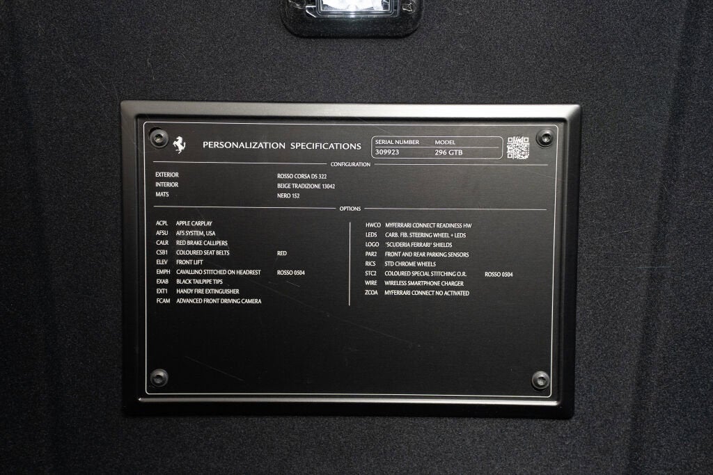 Ferrari Beverly Hills is proud to present this 2024 Ferrari 296 GTB, finished in timeless Rosso Corsa over Beige Tradizione leather upholstery. Sold new through Ferrari Beverly Hills and showing only 1,298 miles, this single-owner example captures the essence of Ferrari’s modern era blending pure Italian emotion with thrilling hybrid performance. Compact, sculpted, and instantly responsive, the 296 GTB redefines what a mid-engine Ferrari can feel like behind the wheel. The Ferrari 296 GTB marks a revolutionary chapter in Maranello’s history as the first V6-powered Ferrari road car with plug-in hybrid technology. Its 2.9-liter twin-turbo V6 and electric motor combine to produce a staggering 819 horsepower, enabling 0 to 60 mph in just 2.9 seconds. Compact, agile, and emotionally engaging, the 296 GTB draws inspiration from Ferrari’s innovative 1960s V6 race cars while embracing the future of performance. Tastefully equipped with key features such as the Front Suspension Lifter, Carbon Fiber Steering Wheel with LEDs, Apple CarPlay, Wireless Smartphone Charger, and AFS Adaptive Lighting System, it delivers everyday usability without sacrificing its sporting essence. The unmistakable Scuderia Ferrari Shields, Rosso Corsa Brake Calipers, and Black Tailpipes complete the exterior, while the elegant cabin features Red Seat Belts, Rosso Stitching, and Cavallino Headrest Embroidery over supple Beige Tradizione leather. The original 36-month Ferrari factory warranty is active through September 7th, 2027, with the 4-year emissions coverage extending through September 7th, 2031. Ferrari’s 7-Year Genuine Maintenance Program provides complimentary annual servicing through September 7th, 2031. This 296 GTB has passed Ferrari’s 101-point inspection and is Ferrari Approved Certified, making it eligible for future warranty extensions. Exterior Options Include: