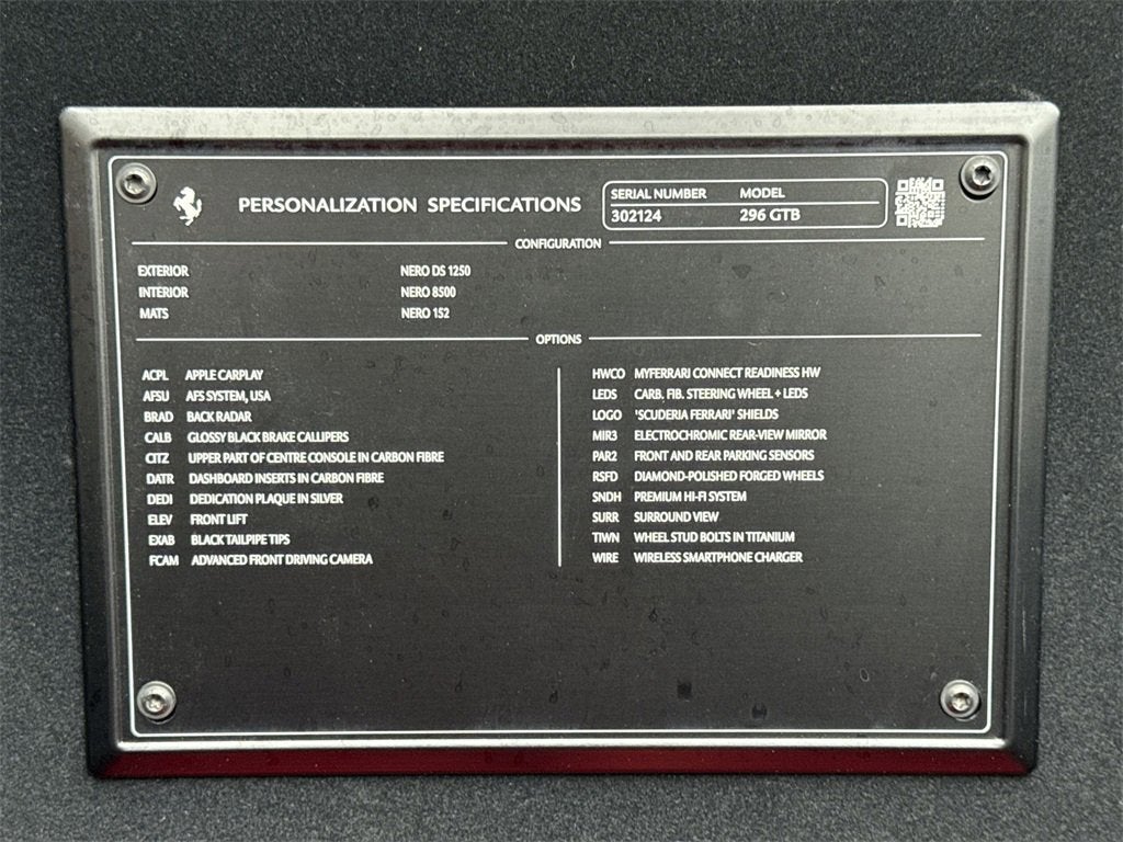 • EXTC - External colors NERO DS 1250 INTC - Internal colors NERO 8500 (BLACK) CRPT - Carpets colors NERO 152 (BLACK) ACPL - APPLE CARPLAY AFSU - AFS SYSTEM AMERICA BRAD - BACK RADAR CALB - BLACK BRAKE CALIPERS CITZ - CARBON FIBRE UPPER TUNNEL TRIM DATR - CARBON FIBRE DASHBOARD INSERTS DEDI - DEDICATION PLATE IN SILVER ELEV - SUSPENSION LIFTER EXAB - BLACK CERAMIC EXHAUST PIPES FCAM - ADVANCED FRONT DRIVING CAMERA HWCO - HW READINESS MYFERRARI CONNECT LEDS - CARB.FIB.STEERING WHEEL + LEDS LOGO - 'SCUDERIA FERRARI' SHIELDS MIR3 - ELECTROCHROMIC REARWIEW MIRROR PAR2 - FRONT AND REAR PARKING SENSORS RSFD - 20" FORGED DIAMOND RIMS SNDH - PREMIUM HIFI SYSTEM SURR - SURROUND VIEW TIWN -TITANIUM WHEEL BOLTS WIRE - WIRELESS CHARGER SMARTPHONE Genuine Maintenance Service valid thru 19/03/2031 Factory Warranty valid thru 19/03/2027
