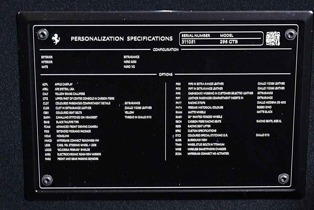 FERRARI CERTIFIED PRE-OWNED This Certified Ferrari includes a 101 point inspection, 24/7 roadside assistance, a warranty of: 12-Month Service Contract, TitleGuard Insurance against odometer fraud, title defects or unreported DMV brands VERY LOW MILES! At just 213 miles, this 2024 Ferrari provides great value. LOADED WITH VALUE! Comes equipped with: Air Conditioning, Navigation System. This Ferrari 296 GTB also includes Clock, Climate Control, Power Passenger Seat, Tachometer, Memory Seat Position, Digital Info Center, Cruise Control, Tilt Steering Wheel, Power Steering, Telescoping Steering Wheel, Power Windows, Steering Radio Controls, Power Mirrors, Leather Steering Wheel, Leather Shifter, Driver Airbag, ABS Brakes, Fog Lights, Passenger Airbag, Traction Control, Intermittent Wipers, Side Airbags, Dynamic Stability, Keyless Entry, Rear Defogger, Security System, AM/FM, Satellite Radio, Rear Spoiler, Center Arm Rest, Cup Holders, Remote Fuel Door, Remote Trunk Lid, Heated Mirrors, Rear Fog Lamps, Daytime Running Lights, Parking Sensors, Reverse Camera, Roll Stability Control, Adaptive headlights, Tire Pressure Monitor, Premium Sound, Carpeted Floor Mats, HD Radio, Onboard Hard Drive, Voice Control. Air Conditioning, Climate Control, Cruise Control, Power Steering, Power Windows, Power Mirrors, Leather Steering Wheel, Leather Shifter, Power Passenger Seat, Memory Seat Position, Clock, Tachometer, Digital Info Center, Tilt Steering Wheel, Telescoping Steering Wheel, Steering Wheel Radio Controls, Driver Airbag, Passenger Airbag, Side Airbags, Keyless Entry, Security System, ABS Brakes, Traction Control, Dynamic Stability, Rear Defogger, Fog Lights, Intermittent Wipers, AM/FM, Alloy Wheels, Leather Interior Surface, Navigation System, 6 Speakers, Radio data system, Automatic temperature control, Power driver seat, Adaptive suspension, Four wheel independent suspension, 4-Wheel Disc Brakes, Ceramic disc brakes: front and rear, Dual front impact airbags, Dual front side impact airbags, Front anti-roll bar, Low tire pressure warning, Passenger cancellable airbag, Rear anti-roll bar, Brake assist, Exterior Parking Camera Rear, Rear Parking Sensors, Delay-off headlights, Fully automatic headlights, Bumpers: body-color, Heated door mirrors, Power door mirrors, Spoiler, Apple CarPlay, Compass, Driver door bin, Front reading lights, Illuminated entry, Outside temperature display, Sport steering wheel, Standard Seats, Telescoping steering wheel, Voltmeter, Front Center Armrest, Leather Seat Trim, Sport Plus Seats, Passenger door bin, Wheels: 20 x 9 Fr & 20 x 11 Rr, Rain sensing wipers Adaptive headlights, Carpeted Floor Mats, Center Arm Rest, Cup Holders, Daytime Running Lights, Heated Mirrors, Navigation System, Parking Sensors, Premium Sound, Rear Fog Lamps, Rear Spoiler, Rear Spoiler, Remote Fuel Door, Remote Trunk Lid, Reverse Camera, Roll Stability Control, Tire Pressure Monitor - Contact THE COLLECTION GENERAL at 786-349-9658 or GENERAL@THECOLLECTION.COM for more information. -