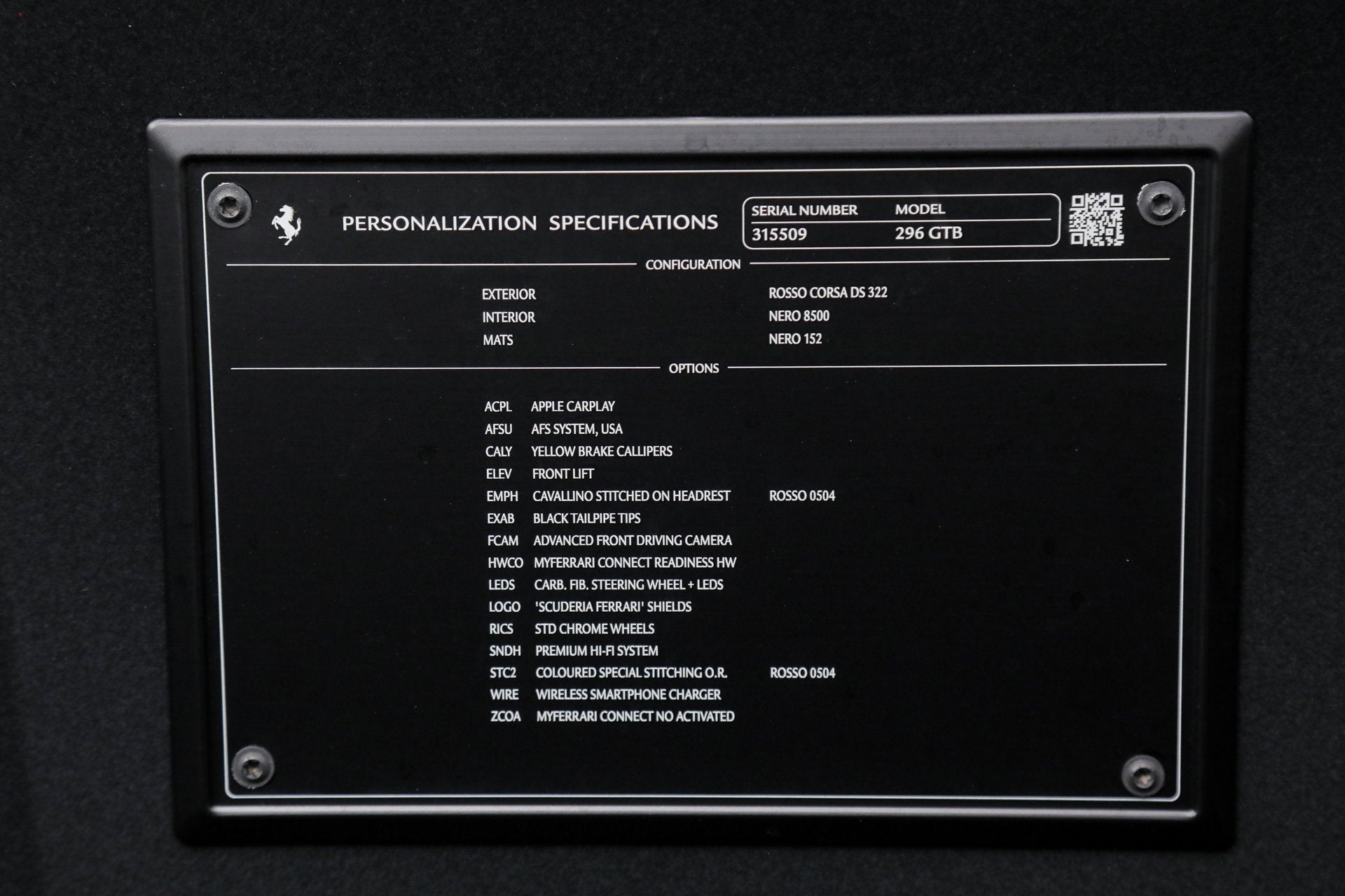 Ferrari 296 GTB - FERRARI CERTIFIED PRE-OWNED - AVAILABLE EXTENDED FERRARI WARRANTY - - Rosso Corsa over Nero - ONE OWNER - Very Low Miles - Pristine Condition - Many Fine Options - Expertly Maintained Authorized Ferrari Dealers - Ferrari Factory Warranty to 5/10/28 - Complimentary Ferrari Genuine Maintenance Service to 5/10/32 - Factory Options: - Suspension Lifter - Carbon Fiber LED Steering Wheel - Yellow Brake Calipers - Scuderia Ferrari Shields - Cavallino Stitched to Headrests in Rosso - Special Stitching in Rosso - Premium HiFi Sound System - Apple CarPlay - Wireless Smartphone Charger - Advanced Frontlight System (AFS) - Black Tailpipe Tips If you are in the market for a 296 GTB, please call or email us today. This Ferrari has passed a multi-point inspection performed by our factory trained technicians, and has been enrolled in the Ferrari Approved Certified Pre-Owned Program. The Certified program makes available up to two years of additional Ferrari Power Approved Warranty coverage. Please see dealer for more details.