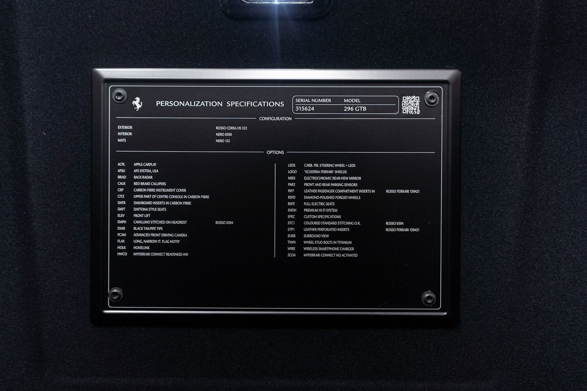 *Ferrari of Rancho Mirage* is thrilled to present this stunning *Ferrari 296 GTB*, serial number *315624*, beautifully finished in iconic *Rosso Corsa DS 322* over a refined *Nero leather interior*. This exquisitely configured example represents the perfect balance of Ferraris next-generation hybrid performance and timeless Italian design. As Ferraris revolutionary mid-engine berlinetta, the 296 GTB delivers electrifying performance from its plug-in hybrid V6 powertrain while maintaining everyday usability and driver engagement. This example is enhanced with extensive carbon fibre detailing, Daytona-style seating, and advanced driver technologymaking it a highly desirable, performance-focused configuration. ==== Performance & Engineering Highlights ==== * 819-hp Plug-In Hybrid V6 Powertrain with F1-derived technology * 8-Speed Dual-Clutch F1 Transmission for seamless gear changes * Front Lift System (ELEV) for enhanced practicality * AFS Adaptive Frontlight System USA Specification (AFSU) * Advanced Front Driving Camera (FCAM) with Back Radar (BRAD) * Red Brake Calipers (CALR) * Diamond-Polished Forged Wheels * Titanium Wheel Stud Bolts (TIWN) ==== Exterior & Carbon Fibre Highlights ==== * Exterior Color: Rosso Corsa DS 322 * Carbon Fibre Instrument Cover (CIP) * Upper Centre Console in Carbon Fibre (CITZ) * Dashboard Inserts in Carbon Fibre (DATR) * Black Tailpipe Tips (EXAB) * Scuderia Ferrari Shields on Fenders (LOGO) ==== Interior & Tailored Details ==== * Interior: Nero Leather with Rosso Ferrari Inserts * Daytona-Style Seats (DAYT) * Cavallino Stitched on Headrests in Rosso Thread (EMPH) * Carbon Fibre Steering Wheel with LED Shift Lights (LEDS) * Leather Passenger Compartment Inserts in Rosso Ferrari (RSFP) * Electrochromic Rear-View Mirror (MIR3) * Front & Rear Parking Sensors (PAR2) * Premium Hi-Fi Sound System (SNDH) * Wireless Smartphone Charger (WIRE) * Apple CarPlay (ACPL) ==== Additional Details ==== * Model: Ferrari 296 GTB * Serial Number: 315624 * Exterior Color: Rosso Corsa DS 322 * Interior Color: Nero with Rosso Ferrari Accents * Mats: Nero 152 * Specification: Ferrari Custom Specifications (SPEC) * MyFerrari Connect Readiness Hardware (HWCO) * MyFerrari Connect: Not Activated (ZCOA) * Full VIN & Complete Option Sheet Available Upon Request The *Ferrari 296 GTB* represents a bold new chapter in Maranello performancemerging electrified innovation with pure Ferrari emotion. Finished in Rosso Corsa with a richly tailored Nero interior and extensive carbon fibre detailing, this example stands as a truly collectible modern Ferrari engineered for the passionate driver. *Ferrari of Rancho Mirage*, a *LAPIS dealership*, delivers exceptional retail, service, and ownership experiences; world-class client care; and an unwavering commitment to the passion that inspires Ferrari owners around the world. For your convenience, we offer global shipping, trade-in opportunities, and personalized financing options. *Contact us today* to explore ownership of this remarkable Ferrari. Visit us at *71441 CA-111, Rancho Mirage, CA 92270*, or call *760-469-9683*.