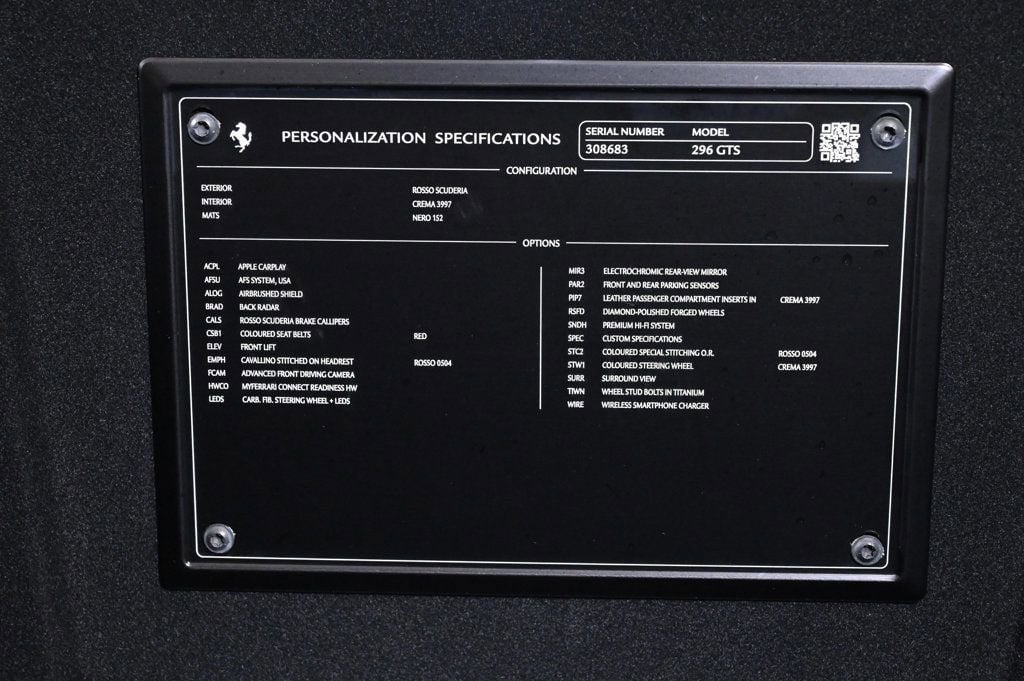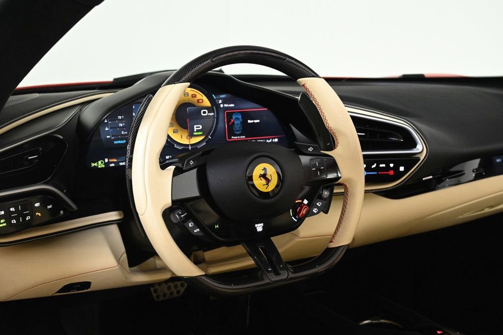 VERY LOW MILES! At just 1639 miles, this 2024 Ferrari provides great value. LOADED WITH VALUE! Comes equipped with: Air Conditioning, Navigation System. This Ferrari 296 GTS also includes Clock, Climate Control, Power Passenger Seat, Tachometer, Memory Seat Position, Digital Info Center, Cruise Control, Tilt Steering Wheel, Power Steering, Telescoping Steering Wheel, Power Windows, Steering Radio Controls, Power Mirrors, Leather Steering Wheel, Leather Shifter, Driver Airbag, ABS Brakes, Fog Lights, Passenger Airbag, Traction Control, Intermittent Wipers, Side Airbags, Dynamic Stability, Keyless Entry, Rear Defogger, Security System, AM/FM, Satellite Radio, Rear Spoiler, Center Arm Rest, Cup Holders, Remote Fuel Door, Remote Trunk Lid, Heated Mirrors, Rear Fog Lamps, Daytime Running Lights, Parking Sensors, Reverse Camera, Roll Stability Control, Adaptive headlights, Tire Pressure Monitor, Premium Sound, Carpeted Floor Mats, HD Radio, Onboard Hard Drive, Voice Control. Air Conditioning, Climate Control, Cruise Control, Power Steering, Power Windows, Power Mirrors, Leather Steering Wheel, Leather Shifter, Power Passenger Seat, Memory Seat Position, Clock, Tachometer, Digital Info Center, Tilt Steering Wheel, Telescoping Steering Wheel, Steering Wheel Radio Controls, Driver Airbag, Passenger Airbag, Side Airbags, Keyless Entry, Security System, ABS Brakes, Traction Control, Dynamic Stability, Rear Defogger, Fog Lights, Intermittent Wipers, AM/FM, Alloy Wheels, Leather Interior Surface, , Convertible HardTop, 6 Speakers, Radio data system, Automatic temperature control, Power driver seat, Adaptive suspension, Four wheel independent suspension, 4-Wheel Disc Brakes, Ceramic disc brakes: front and rear, Dual front impact airbags, Dual front side impact airbags, Front anti-roll bar, Integrated roll-over protection, Low tire pressure warning, Passenger cancellable airbag, Rear anti-roll bar, Brake assist, Exterior Parking Camera Rear, Rear Parking Sensors, Delay-off headlights, Fully automatic headlights, Bumpers: body-color, Convertible roof wind blocker, Heated door mirrors, Power door mirrors, Spoiler, Apple CarPlay, Compass, Convertible roof lining, Driver door bin, Front reading lights, Illuminated entry, Outside temperature display, Power convertible roof, Sport steering wheel, Standard Seats, Telescoping steering wheel, Voltmeter, Front Center Armrest, Leather Seat Trim, Sport Plus Seats, Passenger door bin, Wheels: 20 x 9 Fr & 20 x 11 Rr, Glass rear window, Rain sensing wipers Adaptive headlights, Carpeted Floor Mats, Center Arm Rest, Cup Holders, Daytime Running Lights, Heated Mirrors, Navigation System, Parking Sensors, Premium Sound, Rear Fog Lamps, Rear Spoiler, Rear Spoiler, Remote Fuel Door, Remote Trunk Lid, Reverse Camera, Roll Stability Control, Tire Pressure Monitor - Contact Alvaro Uribe at 786-628-7606 or auribe@ferrariofmiami.com for more information. -