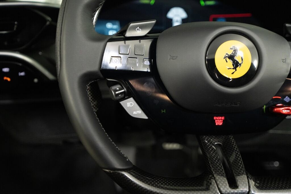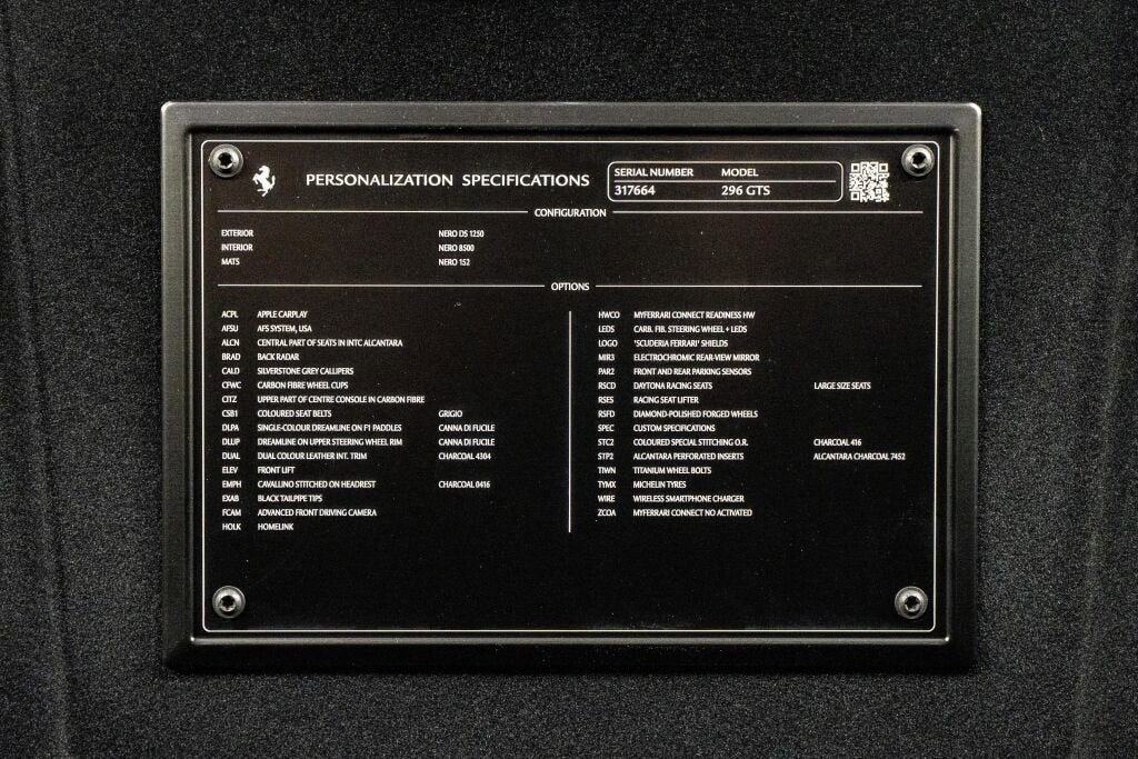• Nero exterior paint - EXTC Grigio Silverstone brake callipers - CALD Carbon fibre wheel centre cap - CFWC Tailpipe tips with black finish - EXAB Scuderia Ferrari shields on fenders - LOGO 20 sports wheels with diamond-polished finish - RSFD Titanium wheel studs - TIWN Front suspension lift - ELEV Adaptive Headlight System - AFSU Front parking sensors - PAR2 Nero interior - INTC Carbon fibre front tunnel - CITZ Carbon fibre steering wheel with LEDs - LEDS Centre part of seat in colour-matched Alcantara® - ALCN Nero carpet - CRPT Coloured seat belts in grey- CSB1 Dreamline F1 Paddles in Canna di Fucile - DLPA Dreamline Upper Arch Steering Wheel in Canna di Fucile - DLUP Dual colour leather interior trim in Charcoal - DUAL Embroidered Cavallino emblem on headrest in Charcoal - EMPH Daytona racing seats in carbon fibre in XL - RSCD Daytona insert panels in Alcantara® in Charcoal - STP2 Manual ratchet seat height adjustment mechanism - RSES Special stitching in Charcoal - STC2 Apple CarPlay - ACPL Blind Spot Detection and rear radar - BRAD Advanced Front Driving Camera with Lane Keep Assist - FCAM Homelink home access control system - HOLK Myferrari Connect - ZCOA Electrochromic exterior rear view mirrors - MIR3 Wireless smartphone charger - WIRE