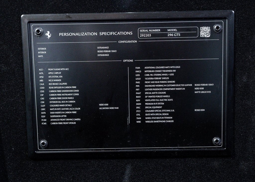 SALE PENDING Wide World Ferrari is delighted to offer this stunning 2023 Ferrari 296 GTS, impeccably optioned example with 7,723 miles, a clean Carfax, and an original msrp of nearly $519,000. Finished in rare and sophisticated Grigio 812S Opaco, this open-top hybrid supercar perfectly blends Ferraris legendary design language with the innovation of electrified performance. Built to excite on both road and track, this 296 GTS makes a commanding statement at every angle. The exterior is accentuated by Rosso Corsa brake calipers, iconic Scuderia Ferrari shields on the fenders, and a full complement of carbon fiber upgrades, including the rear diffuser, under-door trim, exterior sill plates, and gloss-finish carbon fiber front and lateral spoilers. Forged wheels in a Brilliant Silver gloss finish, secured by titanium wheel studs, add both elegance and weight-saving performance. Inside, the cabin is a masterclass in Italian craftsmanship and contemporary motorsport styling. Upholstered in Rosso Ferrari with Nero leather accents, the interior features special stitching in Rosso and contrasting Nero leather seat piping. The Style full-electric ventilated seats include integrated neck warmers, offering year-round comfort with the top down. Additional interior highlights include a carbon fiber steering wheel with LED shift lights, carbon fiber dashboard accents, carbon fiber door panels, and a center tunnel trimmed in carbon fiber. Overmats with the embroidered vehicle logo and bespoke Nero leather accents throughout the passenger compartment enhance the personalized feel. This 296 GTS comes loaded with advanced driver-focused technology that integrates seamlessly into daily usability. Apple CarPlay, a Premium Hi-Fi audio system, and a wireless smartphone charger bring modern connectivity, while performance and convenience features like Adaptive Cruise Control with front radar, the Advanced Front Driving Camera, AFS Adaptive Front Lighting, a front suspension lift system, and front parking sensors ensure an elevated driving experience in every situation. The Personalisation Pack adds a final touch of exclusivity to this already extraordinary Ferrari. Additionally, the car is Ferrari Approved and eligible for up to a 2-year Ferrari Certification warranty (available at an additional charge). This car benefits from an active warranty until July 2028 and complimentary maintenance until July 2030. As the only 4-Time Cavallino Winning Ferrari Center in the tri-state area and one of the first Ferrari Centers in North America, we pride ourselves on exceptional service. We assist with all aspects of your purchase, including trade-ins, shipping, registration, non-reported financing, and customizations. Conveniently located in Rockland County, just under 30 miles from Manhattan. For more information, email us at ferrarivip@newcountry.com or call 845-682-0129.