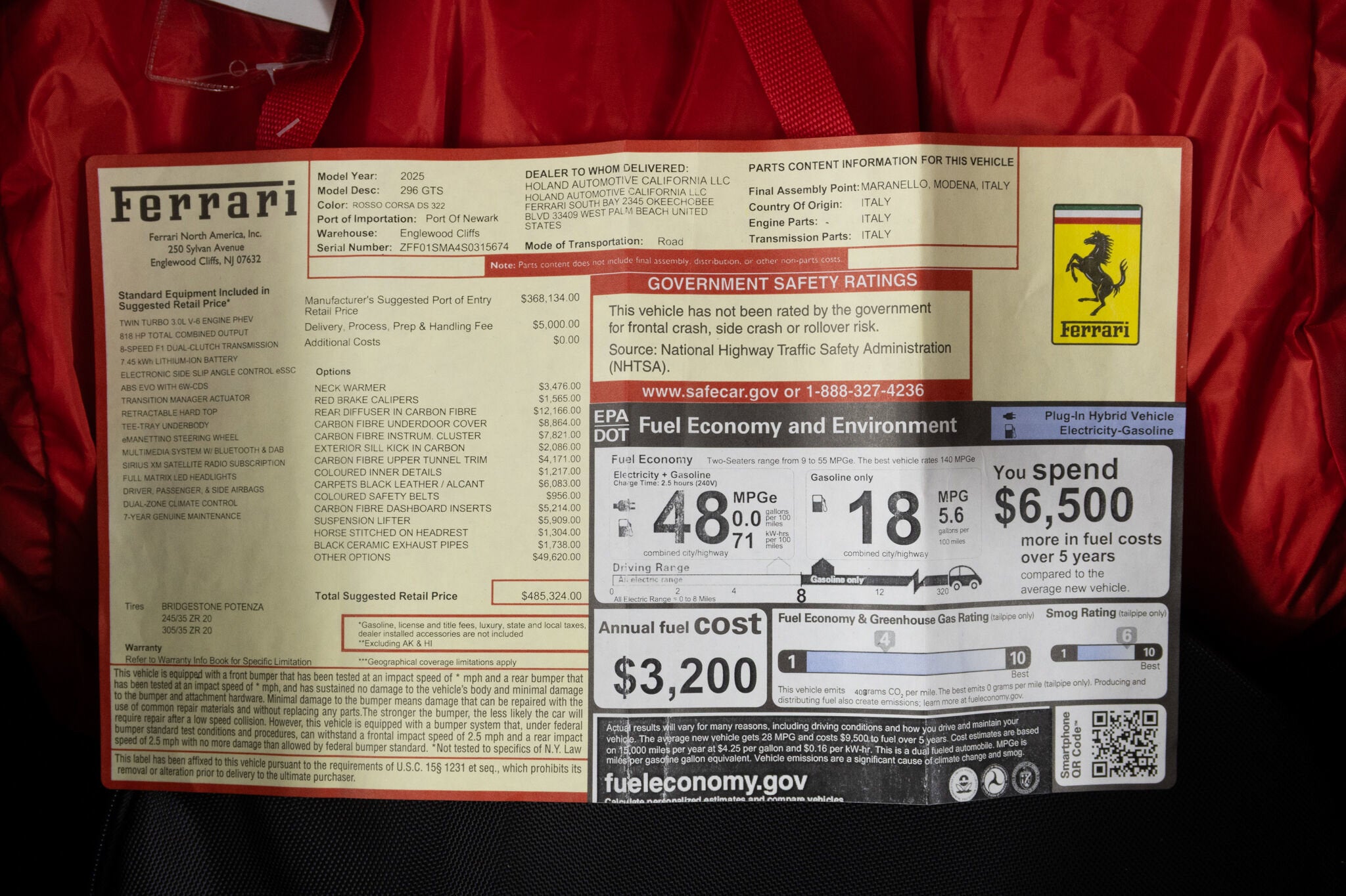 Ferrari South Bay is thrilled to offer this gorgeous super-low mileage one-owner 296 GTS finished in historic Rosso Corsa with Nero Leather Interior. The exterior of this 296 GTB is finished in iconic Rosso Corsa. Carbon Fiber covers the Rear Diffuser, Underdoor Covers, and Front Spoiler. Diamond Polished Forged Wheels surround Carbon Ceramic Brakes with Red Calipers. Scuderia Ferrari Shields are placed proudly on the front fenders. The interior is finished in Nero Leather, with Rosso Stitching found throughout the cabin, including the Cavallinos embroidered onto the headrests of the Fully Electric Ventilated Seats (which also feature the Neck Warmer). Carbon Fiber finishes the Steering wheel (with LED Shift Lights), F1 Shift Paddles, Instrument Cover, Sill Kickplate, and Dashboard Inserts. The Steering Wheel also sports a Red Livery line at the 12 o'clock position. Welcome conveniences include an Advanced Front Driving Camera, Front and Rear Parking Sensors and Surround View Camera to help with tight maneuvers, and Apple CarPlay, with a Wireless Smartphone Charger. This 296 GTS is offered with both original keys, hybrid charging cable assembly, cover, books and tools. The original Factory Warranty carries through February 17, 2028 and Ferrari's Genuine Maintenance Program covers Annual Maintenance through February 17, 2032. if you'd like to learn more about this amazing 296 GTB or set up a viewing in our showroom, please reach out to one of our knowledgeable sales staff. Ferrari South Bay is proudly part of Holand Automotive Group, one of North America’s leading luxury automotive retailers. We offer nationwide shipping, trade-in opportunities, financing, client consignments, and world-class delivery service. Contact us today to explore ownership of this remarkable. Please visit us at 23305 Hawthorne Blvd, Torrance, CA 90505, or call us at (888) 578-8767.