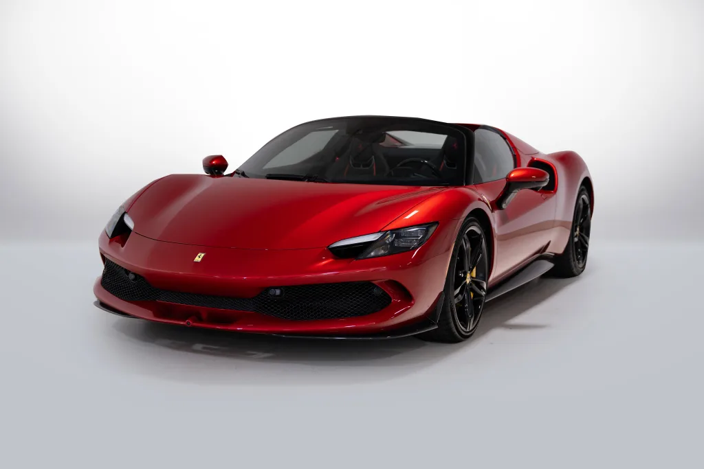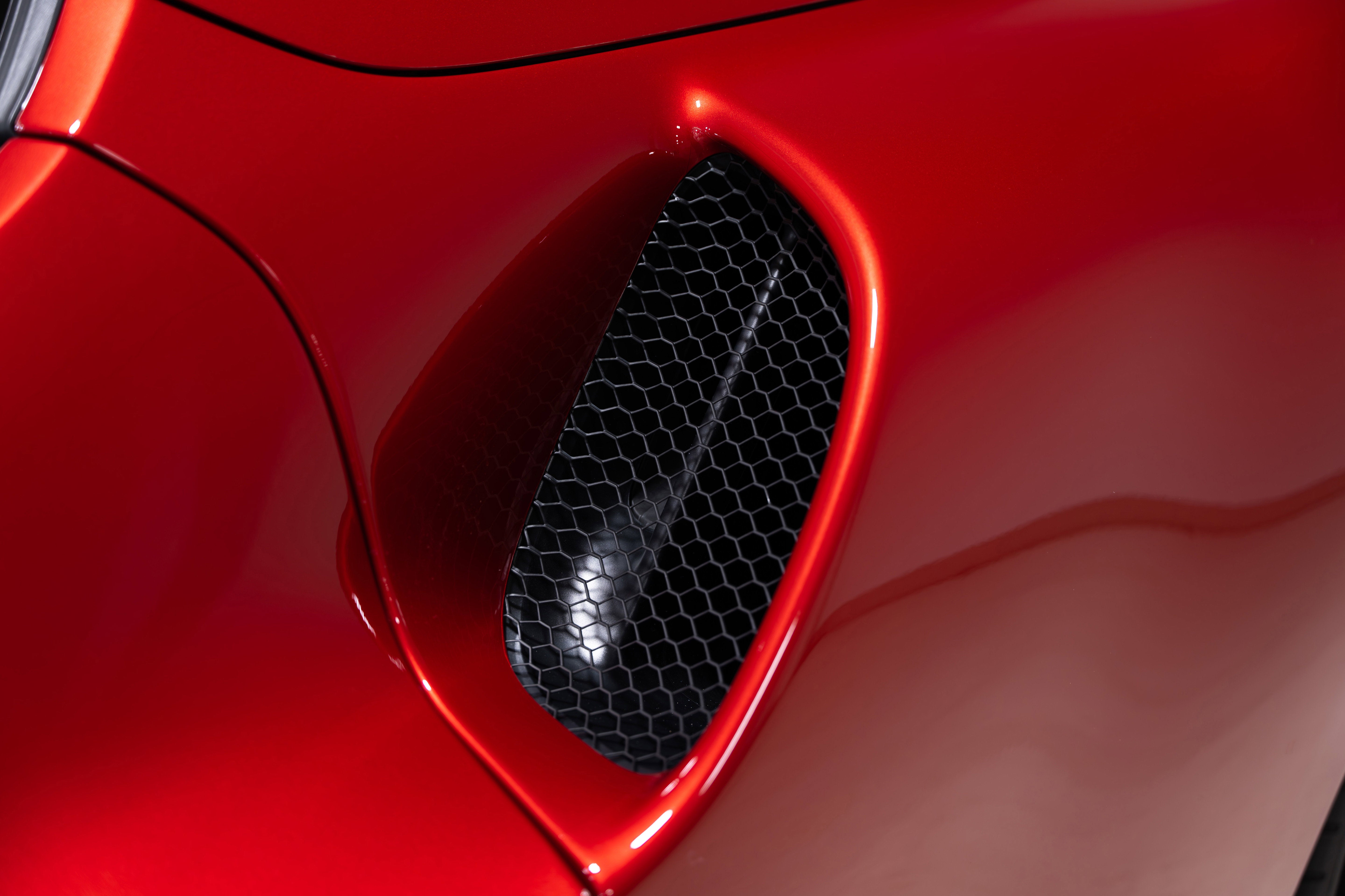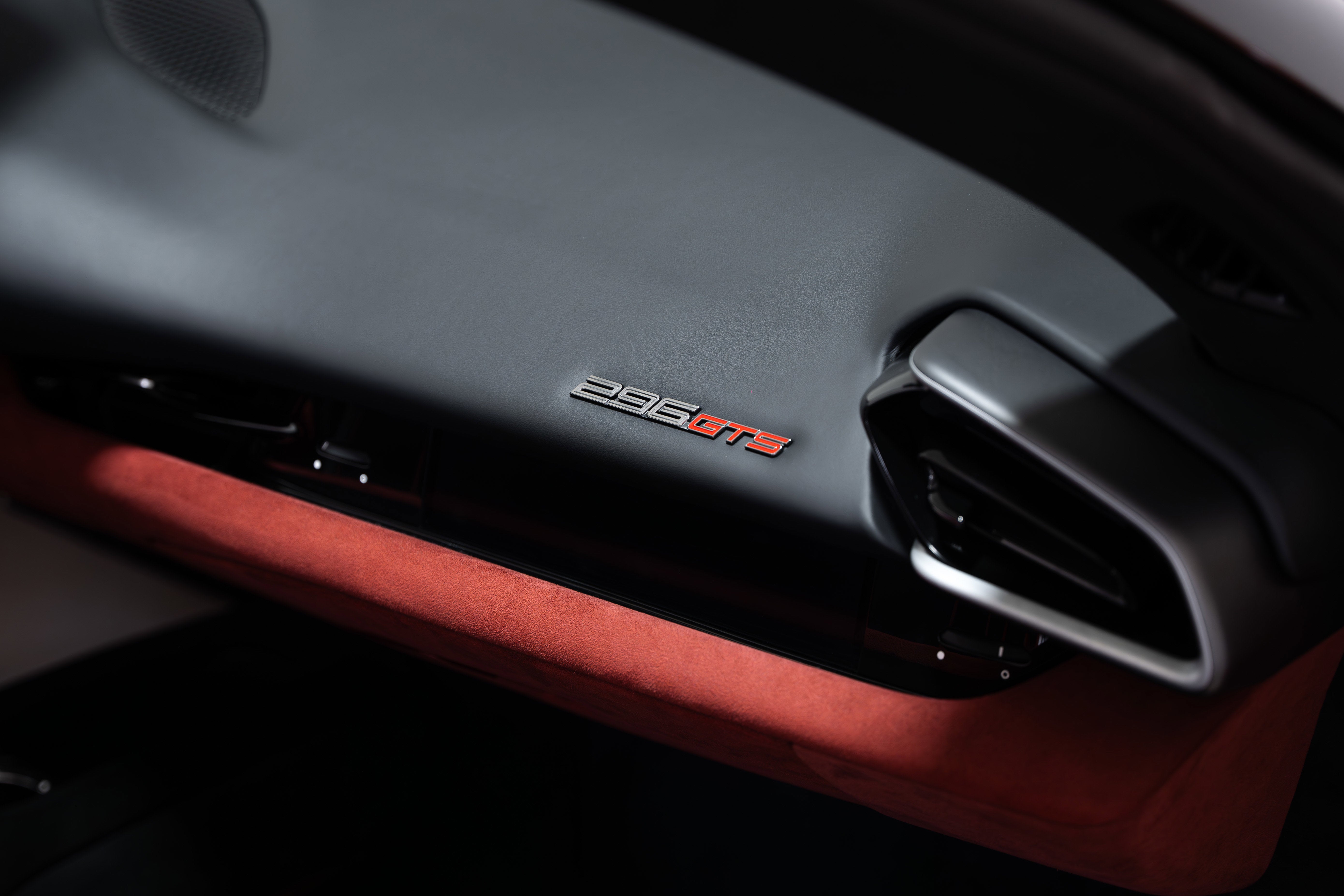 • Finished in Rosso Imola, the exterior radiates intensity and sophistication. This particular example features factory two-tone bodywork that accentuates the low, sculpted lines of the 296 GTS. Extensive exterior carbon fibre---including the front splitter, side skirts, and rear diffuser---adds both visual drama and aerodynamic function. Giallo brake calipers provide a vibrant contrast to the deep red paintwork, infusing the car with a race-inspired aesthetic.
