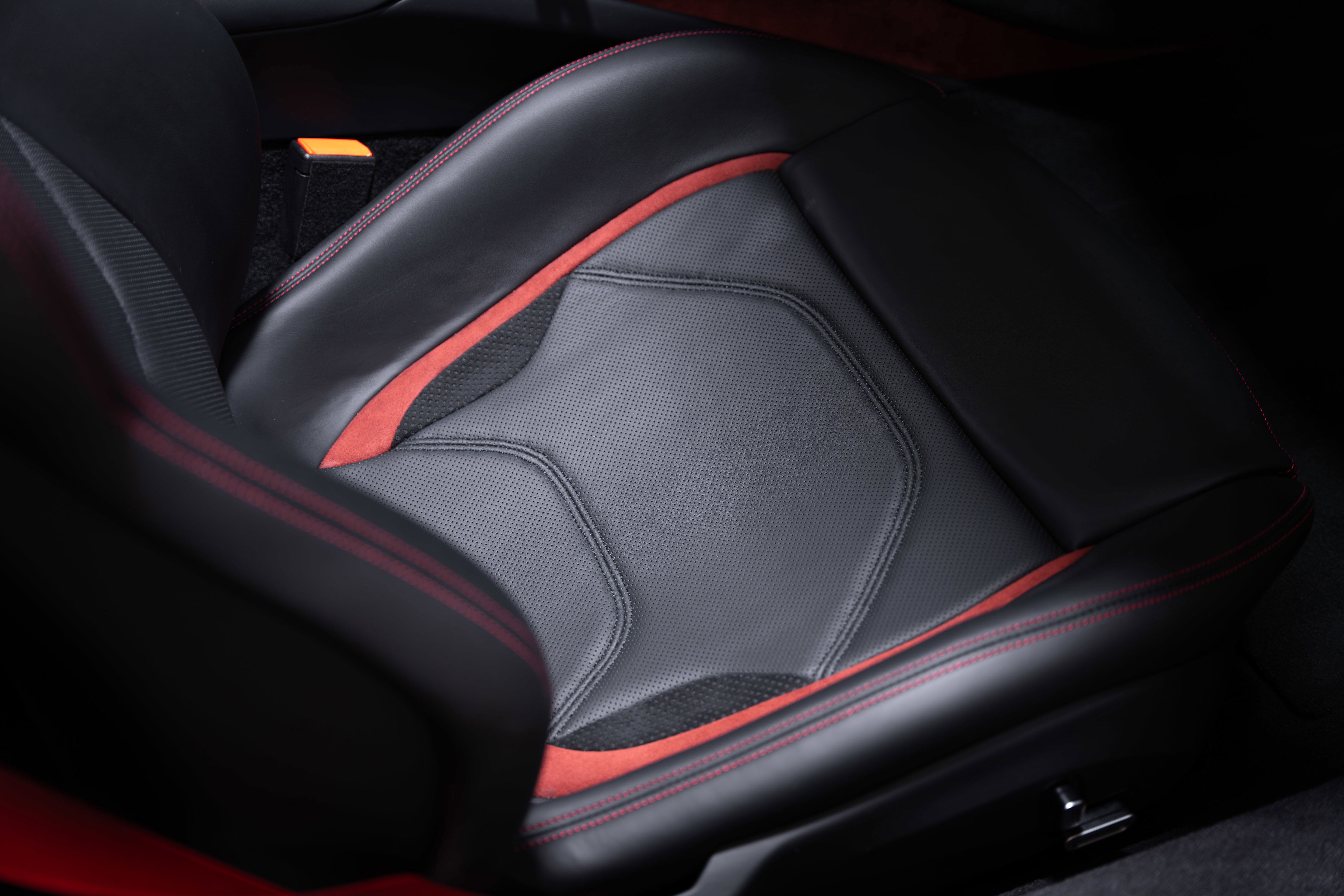 • Inside, the cabin is a masterclass in detail and craftsmanship. The dashboard and door panels are finished in rich Rosso Alcantara, while the 18-way power-adjustable seats are trimmed in Rosso leather with exposed Rosso stitching---an elegant touch that mirrors the car's exterior tone. Extensive carbon fibre is applied throughout the interior on the steering wheel, dashboard, centre console, and door panels, bringing motorsport intensity into the cockpit.