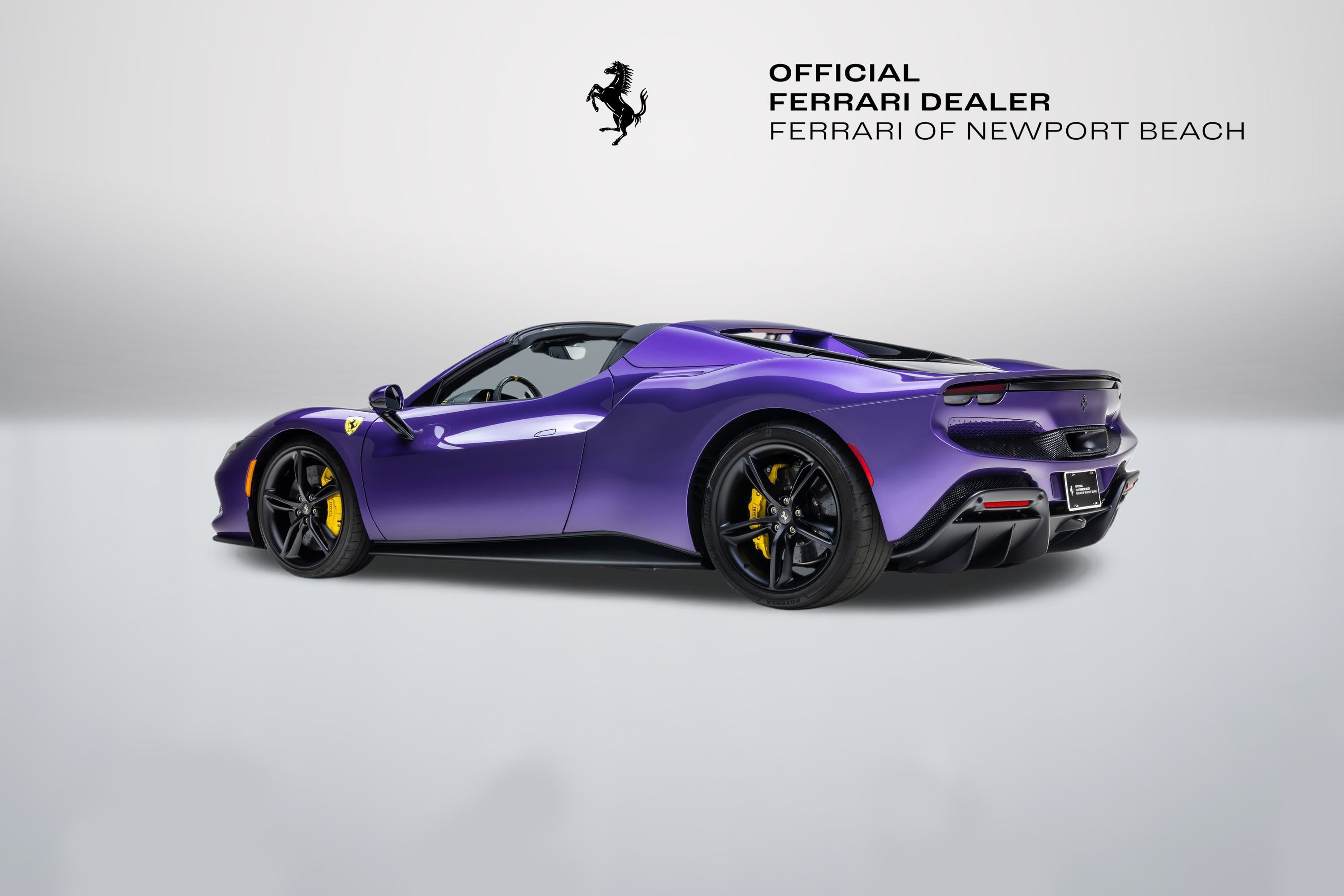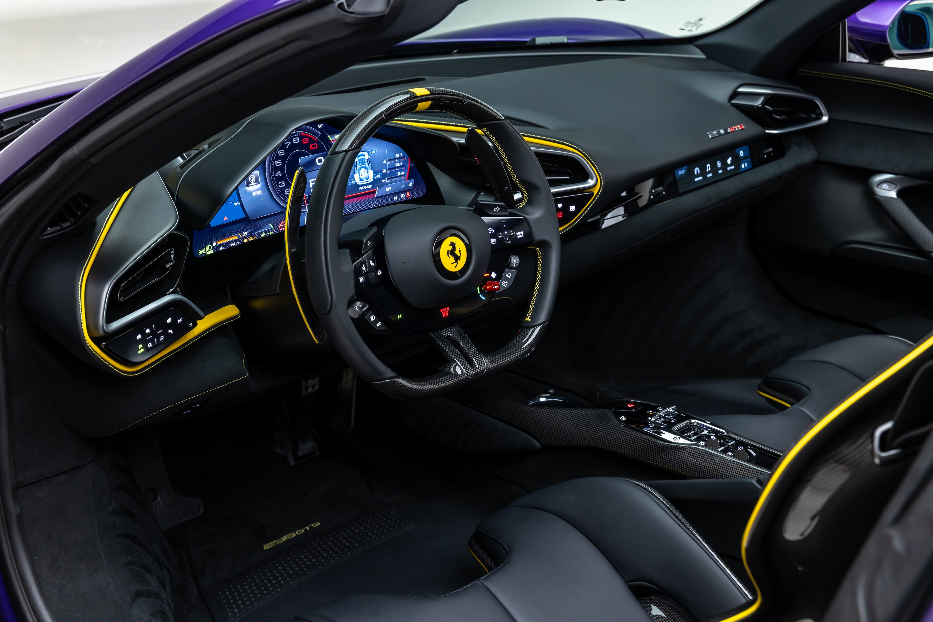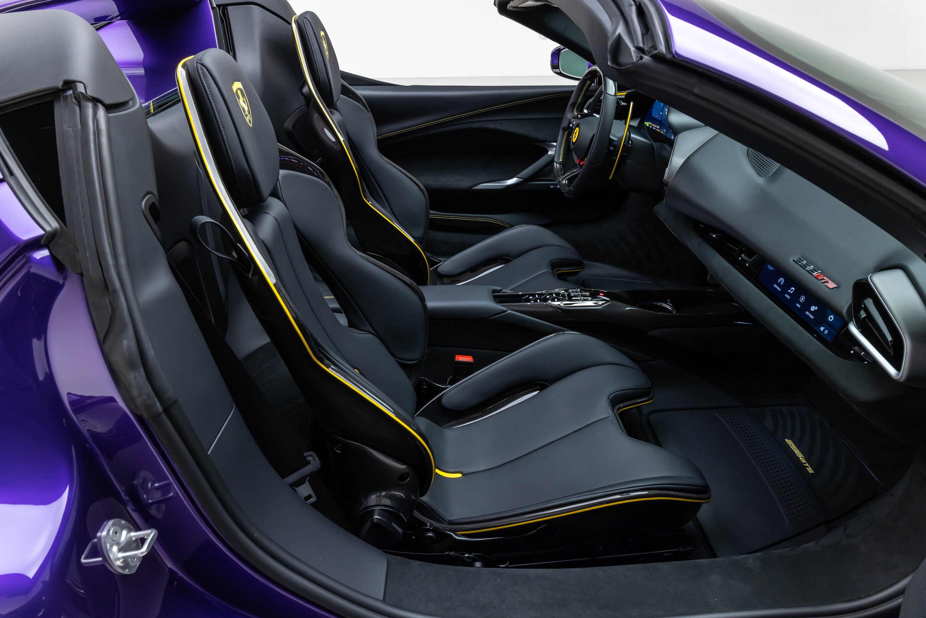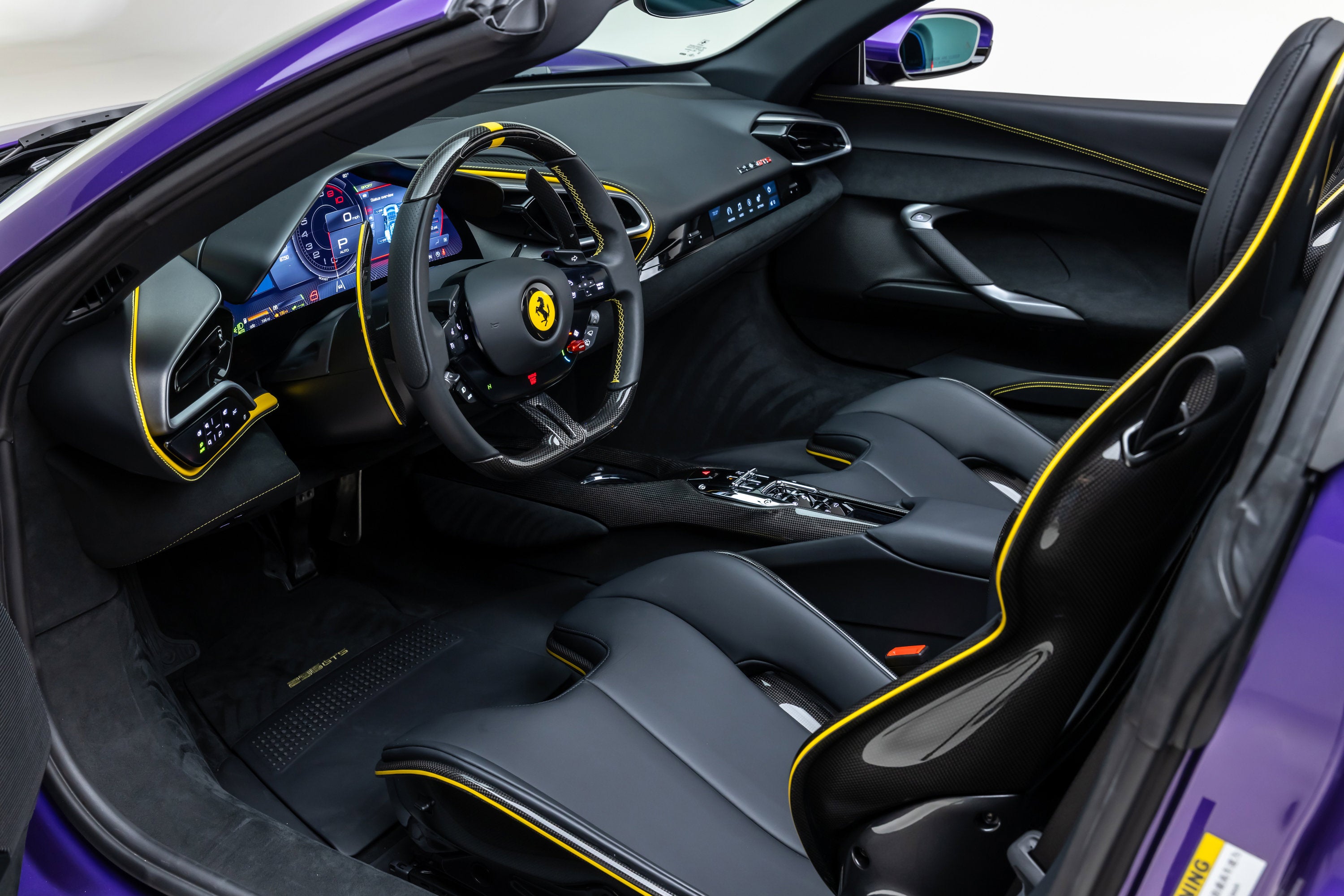 ===== 2025 Ferrari 296 GTS ===== Violetto Dino over Nero with Giallo Accents 143 Miles | VIN: ZFF01SMA6S0317930 Finished in a bespoke Extracampionario Violetto Dino, this 2025 Ferrari 296 GTS is a highly exclusive Atelier-commissioned example with just 143 miles. Built through Ferrari's Atelier New York program, this car represents a one-of-one specification, pairing a deep metallic purple exterior with a Nero interior and curated Giallo accents throughout. The exterior is defined by its striking Violetto Dino finish, complemented by matte black forged wheels, yellow brake calipers, and carbon fiber detailing. Subtle finishes including a satin Ferrari badge and matte black rear Cavallino further enhance the bespoke nature of this build. Inside, the Nero cabin is elevated with extensive Extracampionario customization, featuring Giallo accents across the steering wheel, paddles, and stitching. Carbon fiber racing seats (XL) and a carbon fiber steering wheel with LEDs reinforce the car's performance-focused design, while Atelier personalization details complete the interior. ==== Factory Options & Highlights ==== * Atelier New York Commission * Special Exterior Color (Violetto Dino) * Carbon Fiber Racing Seats (XL) with Lifter * Carbon Fiber Steering Wheel with LEDs * Matte Black Forged Wheels * Scuderia Ferrari Shields Carbon fiber specification includes: * Carbon Fiber Exterior Sill Kickplates * Carbon Fiber Upper Center Console * Carbon Fiber Wheel Cups Additional features include: