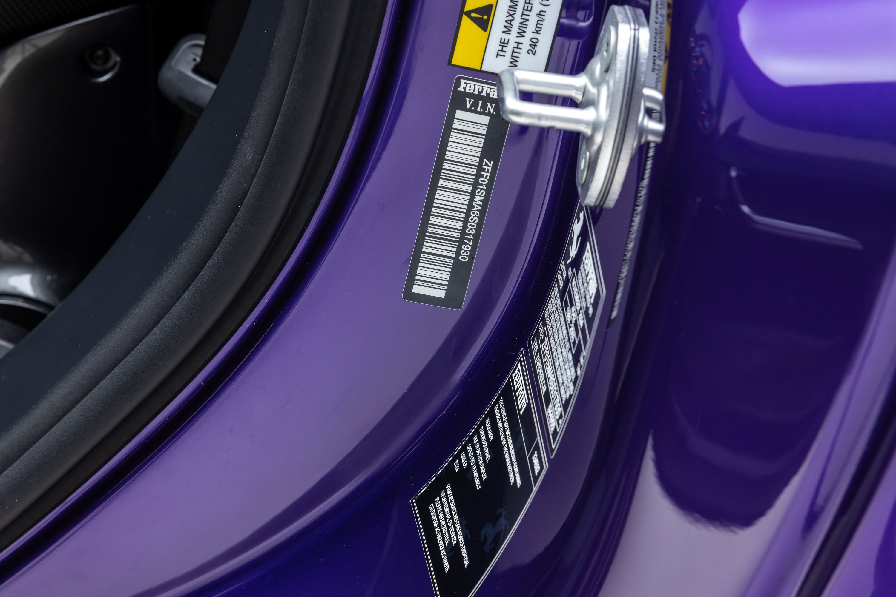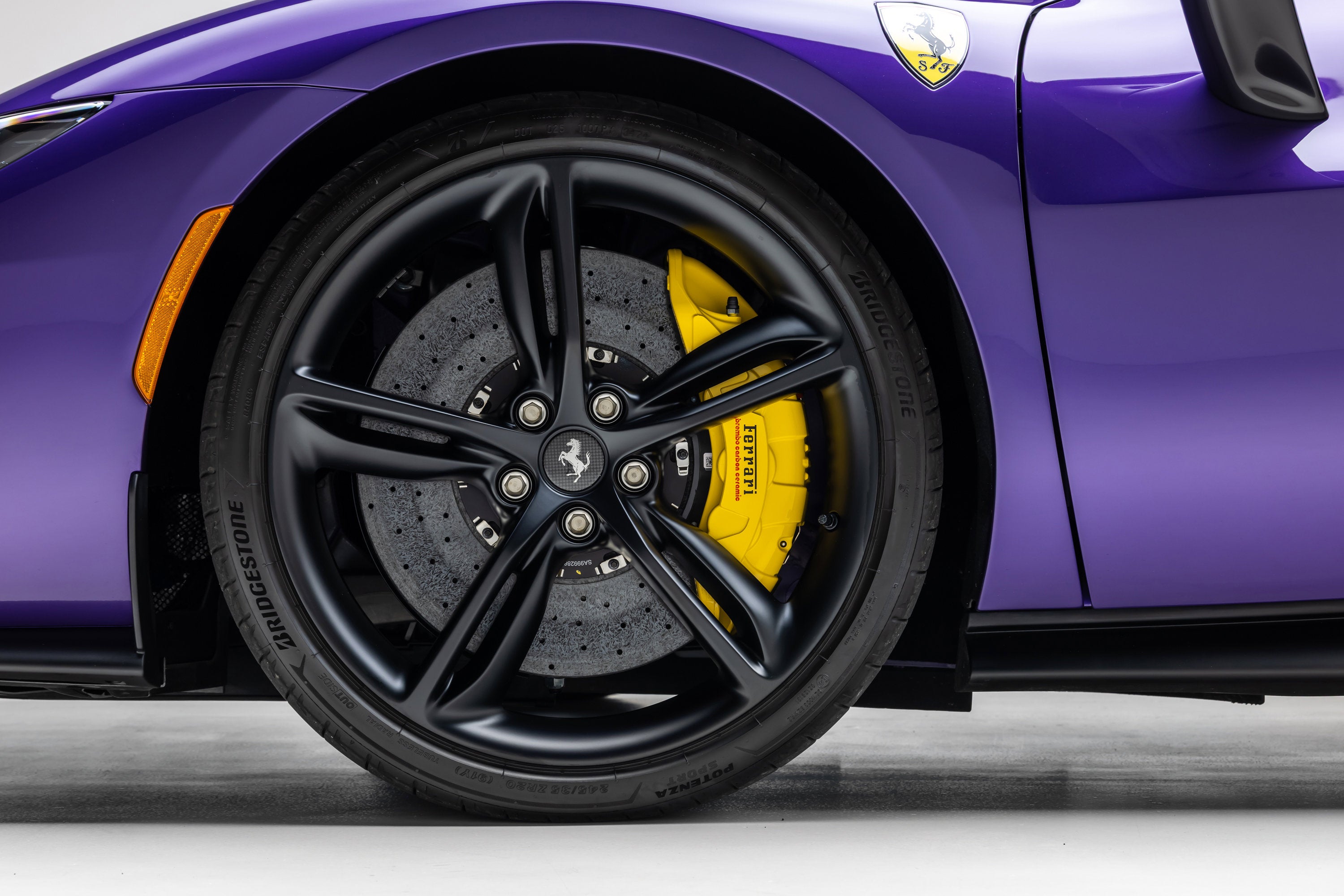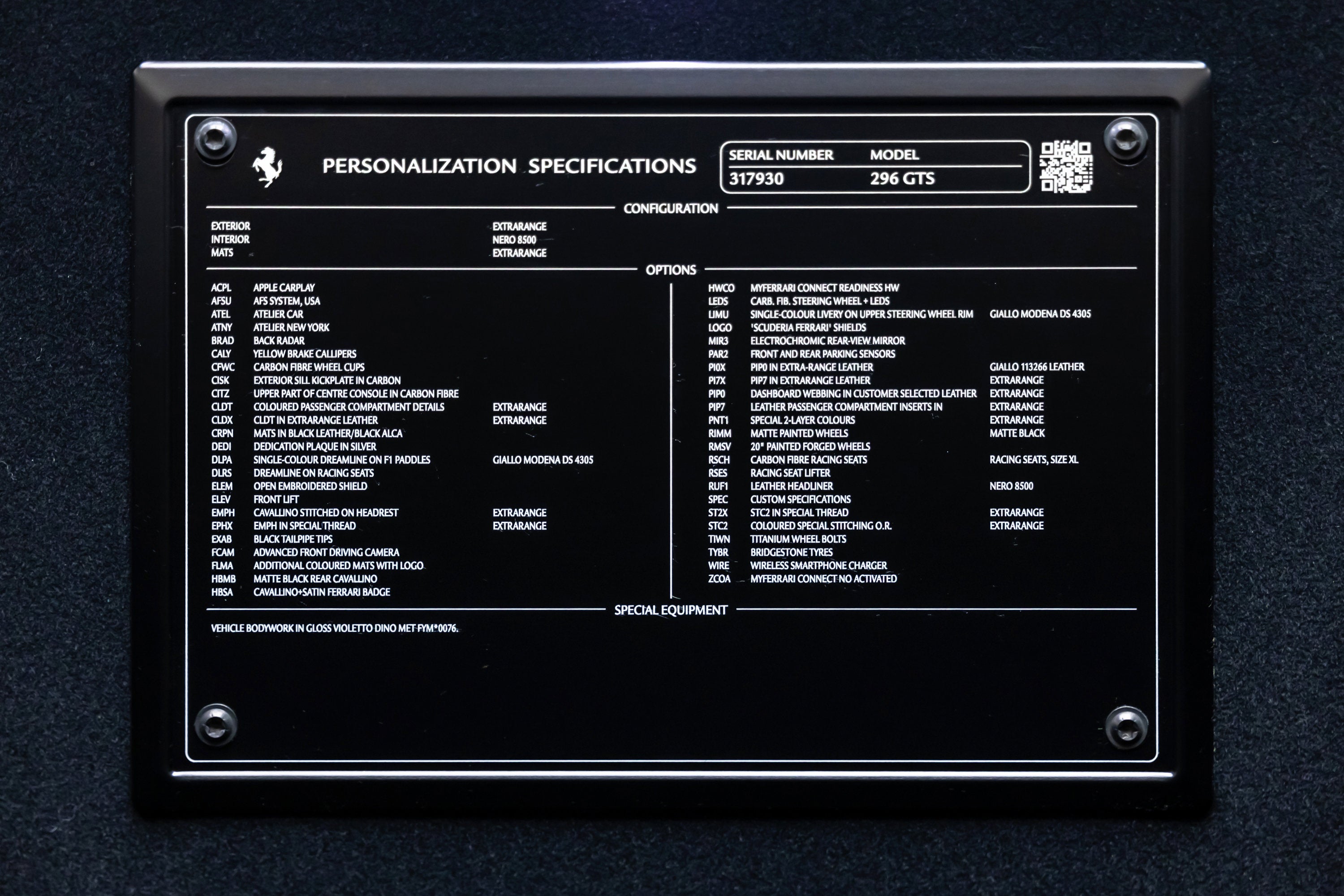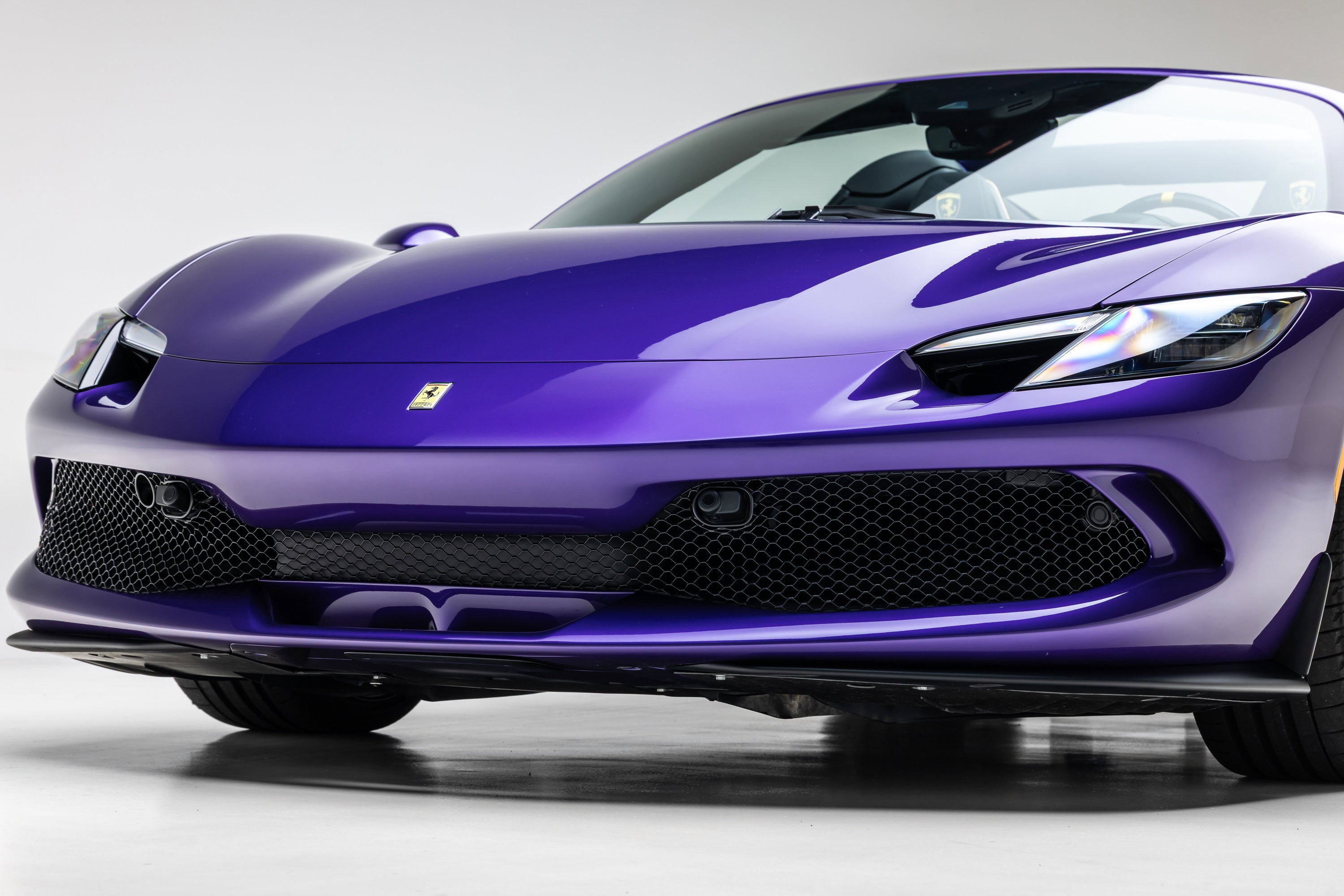 ===== 2025 Ferrari 296 GTS ===== Violetto Dino over Nero with Giallo Accents 143 Miles | VIN: ZFF01SMA6S0317930 Finished in a bespoke Extracampionario Violetto Dino, this 2025 Ferrari 296 GTS is a highly exclusive Atelier-commissioned example with just 143 miles. Built through Ferrari's Atelier New York program, this car represents a one-of-one specification, pairing a deep metallic purple exterior with a Nero interior and curated Giallo accents throughout. The exterior is defined by its striking Violetto Dino finish, complemented by matte black forged wheels, yellow brake calipers, and carbon fiber detailing. Subtle finishes including a satin Ferrari badge and matte black rear Cavallino further enhance the bespoke nature of this build. Inside, the Nero cabin is elevated with extensive Extracampionario customization, featuring Giallo accents across the steering wheel, paddles, and stitching. Carbon fiber racing seats (XL) and a carbon fiber steering wheel with LEDs reinforce the car's performance-focused design, while Atelier personalization details complete the interior. ==== Factory Options & Highlights ==== * Atelier New York Commission * Special Exterior Color (Violetto Dino) * Carbon Fiber Racing Seats (XL) with Lifter * Carbon Fiber Steering Wheel with LEDs * Matte Black Forged Wheels * Scuderia Ferrari Shields Carbon fiber specification includes: * Carbon Fiber Exterior Sill Kickplates * Carbon Fiber Upper Center Console * Carbon Fiber Wheel Cups Additional features include: