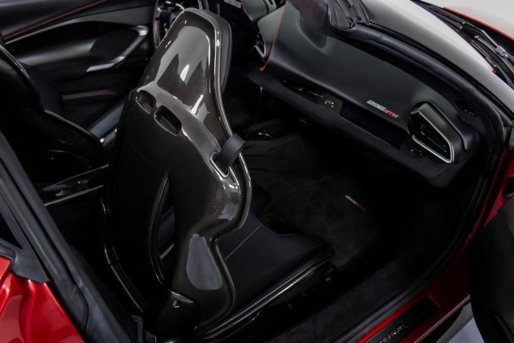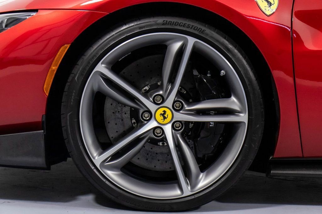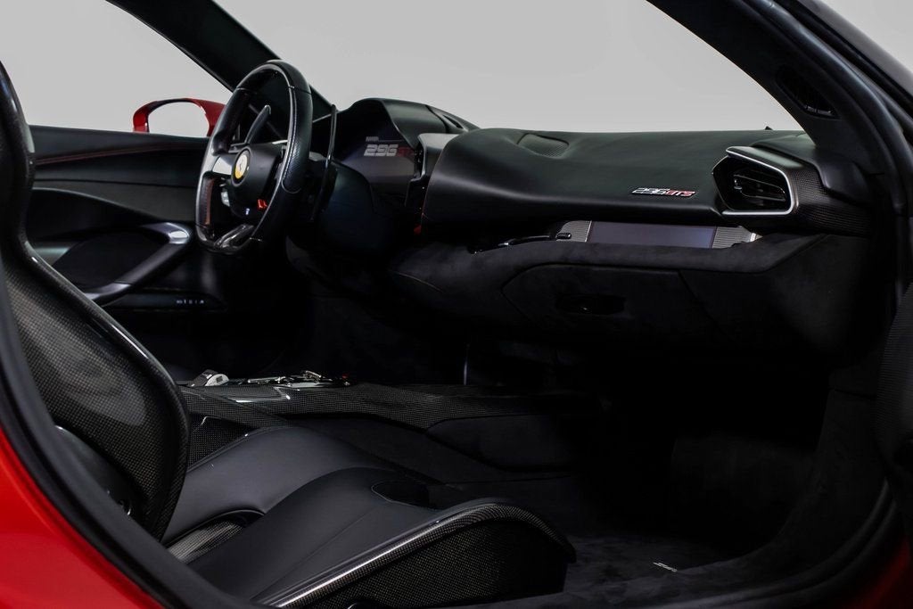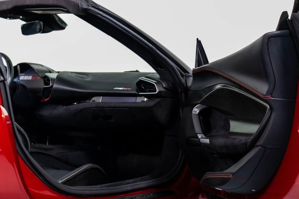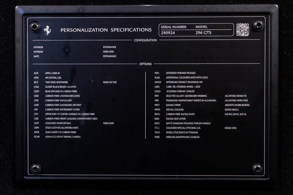 290924 Exterior: Rosso Imola Interior: Nero Mats: Nero 2023 Ferrari 296 GTS Options: Apple CarPlay AFS System, USA Two-Tone Bodywork in Nero Glossy Black Brake Calipers Rear Diffuser in Carbon Fiber Carbon Fiber Underdoor Cover Carbon Fiber Vehicle Key Carbon Fiber Dashboard Air Vent Carbon Fiber Instrument Cover Upper Part of Center Console in Carbon Fiber Carbon Fiber Front Luggage Compartment Area Colored Inner Details in Nero Stile4 Leather/Alcantara Mats Dash Inserts in Carbon Fiber Advanced Front Driving Camera Extended Fiorano Package Additional Colored Mats with Logo MyFerrari Connect Readiness HW Carb. Fib. Steering Wheel + LEDS 'Scuderia Ferrari' Shields Selected Alcant. Dashboard Webbing in Alcantara Rosso Passenger Compartment Inserts in Alcantara in Alcantara Nero Racing Stripe in Argento Nurburgring Special Colors in Rosso Imola Carbon Fiber Racing Seats Racing Seat Lifter Matte Diamond-Polished Forged Wheels Colored Special Stitching O.R. in Rosso Wheel Stud Bolts in Titanium Wireless Smartphone Charger This 2023 Ferrari 296 GTS is a striking expression of open-top performance, finished in Special Color Rosso Imola with dramatic two-tone Nero bodywork and a motorsport-inspired Argento Nurburgring racing stripe. The exterior is elevated by matte diamond-polished forged wheels, glossy black brake calipers, and extensive carbon fiber elements including the rear diffuser and underdoor covers, emphasizing its aggressive stance. Inside, the cockpit is focused and luxurious, featuring carbon fiber racing seats, a carbon fiber steering wheel with LED shift lights, Alcantara and leather accents, and Rosso contrast stitching throughout. The extended Fiorano Package enhances the cars dynamic capabilities, while advanced technology such as Apple CarPlay, wireless smartphone charging, and driver-assistance systems ensure modern usability. Altogether, this 296 GTS delivers a thrilling blend of cutting-edge hybrid performance, lightweight design, and unmistakable Ferrari craftsmanship.