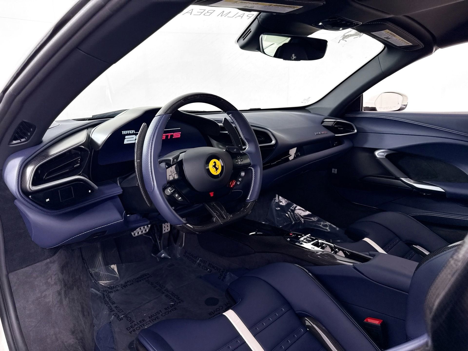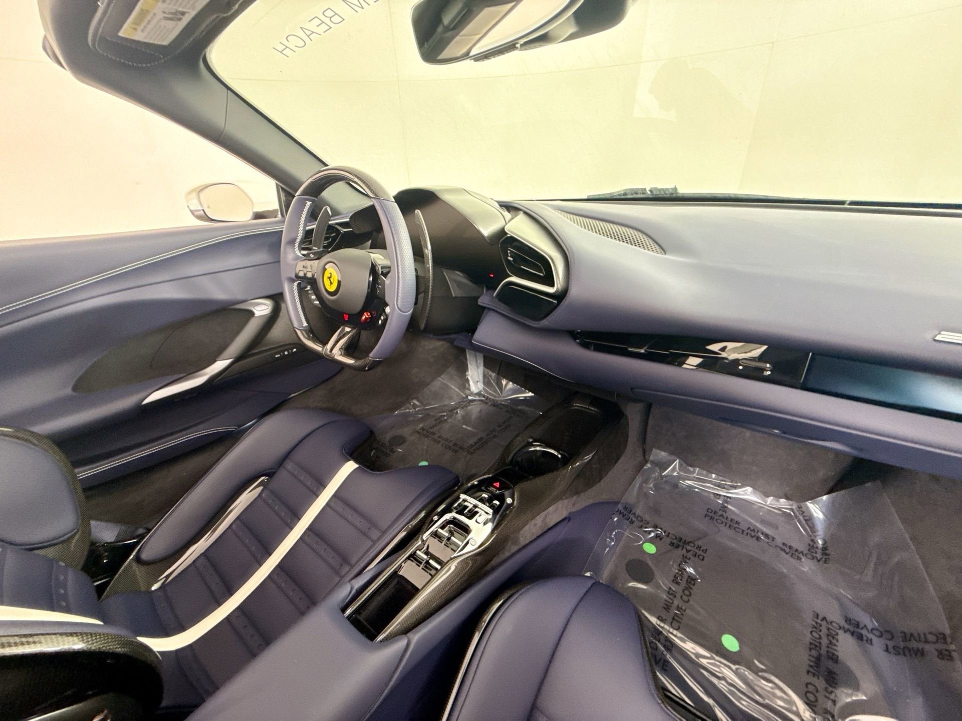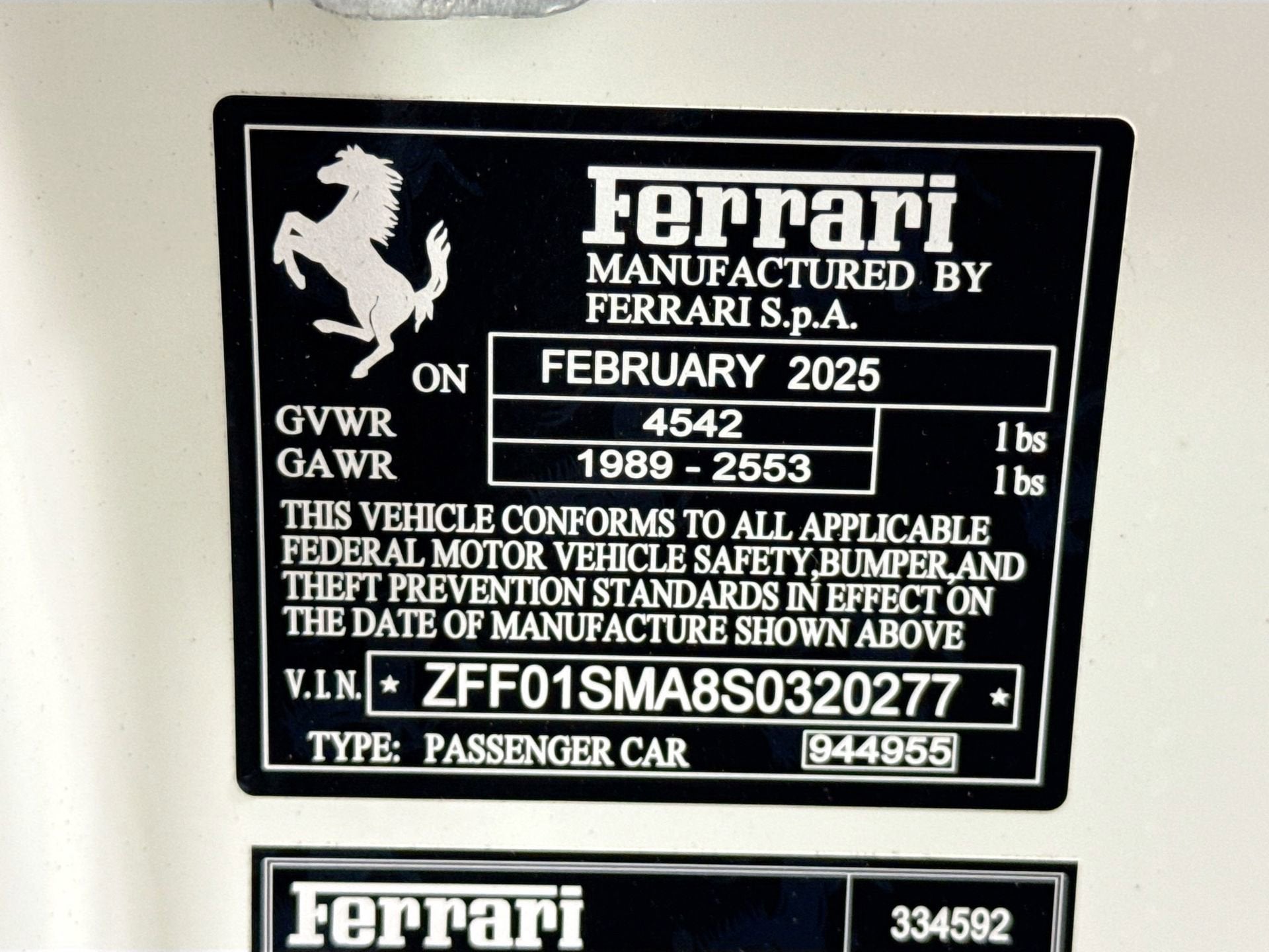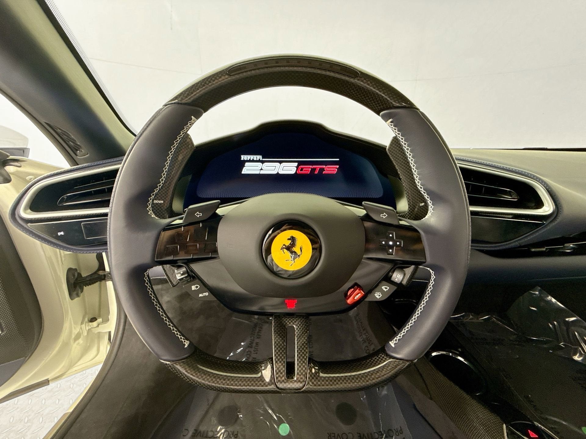 2025 Ferrari 296 GTS One Owner, Local Delivery Mile, Stunning Custom Spec Experience the pinnacle of Italian performance and craftsmanship with this 2025 Ferrari 296 GTS, featuring an immaculate, delivery-mile, one-owner history. Finished in Bianco Avus, this example commands attention with its signature Scuderia Ferrari shields on the fenders and Giallo Modena brake calipers, perfectly complementing the 20 diamond-polished sports wheels with titanium wheel studs. Tailpipe tips with a sleek black finish add a subtle yet aggressive touch. Step inside and enjoy a fully custom Blu Sterling leather interior, featuring Daytona carbon fiber racing seats, dual-color leather trim, and special stitching with embroidered Cavallino emblems on the headrests. The cockpit is further enhanced with carbon fiber instrument binnacle brow, custom leather accents, and LED-equipped carbon fiber steering wheel, providing both style and function. Colored seat belts, Alcantara carpets, and embroidered over mats complete this truly bespoke interior. This 296 GTS comes fully loaded with advanced technology and convenience: Apple CarPlay, premium Hi-Fi audio, wireless smartphone charging, and Home link home access control. Safety and driving assistance include Blind Spot Detection, front driving camera, and front parking sensors, while the AFS America lighting system and electrochromic mirrors enhance visibility. The front suspension lift system ensures worry-free access over curbs. Equipped with Bridgestone performance tires and retaining all Ferrari personalization features, this 296 GTS exemplifies the perfect combination of track-capable performance and refined daily usability. Delivered new locally, it has only the original miles from delivery and has been meticulously cared for by its single owner. This is your opportunity to own a rare, fully loaded, one-owner 2025 Ferrari 296 GTS with exceptional custom spec, delivering the ultimate driving experience in a turnkey package.