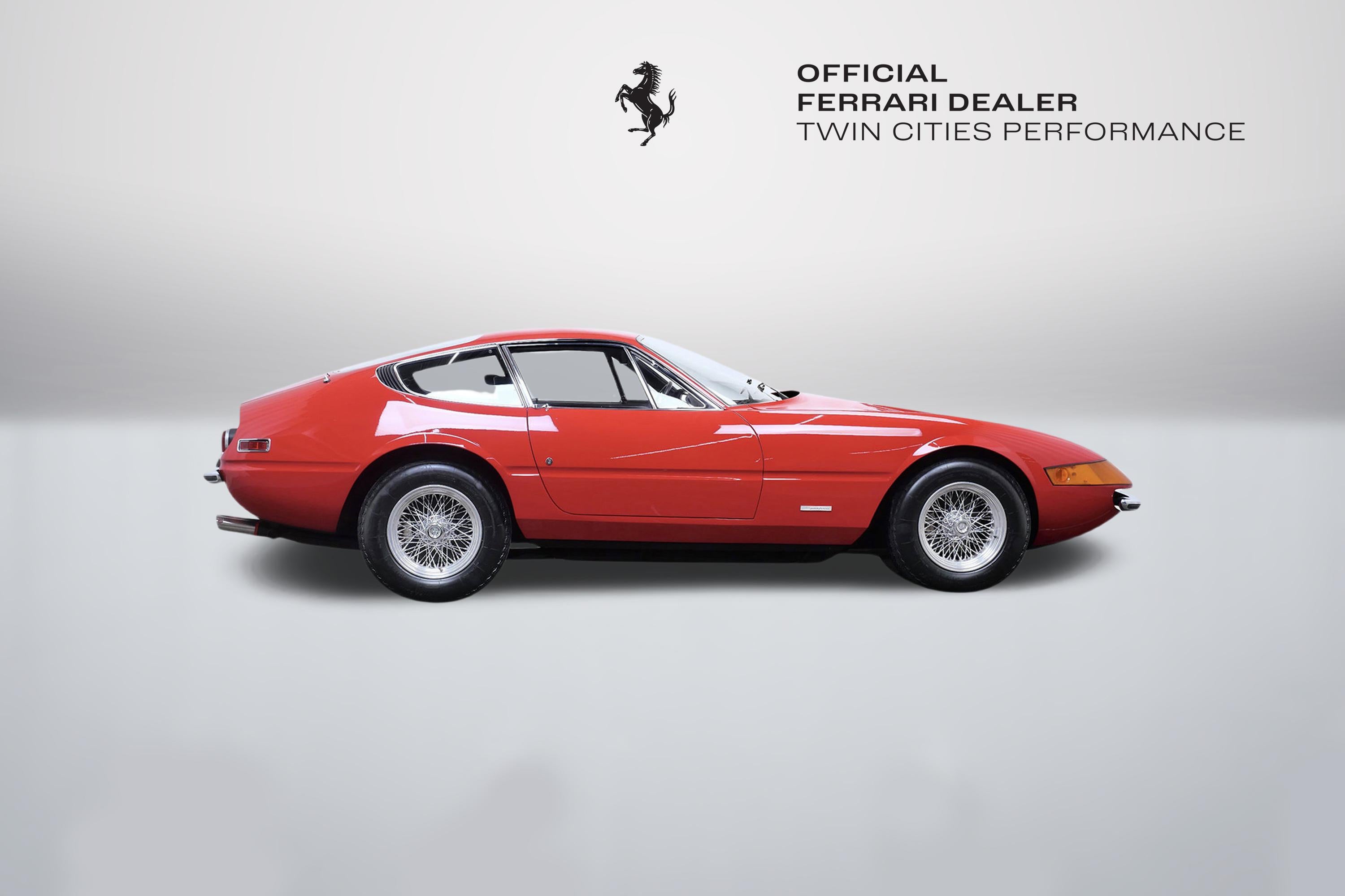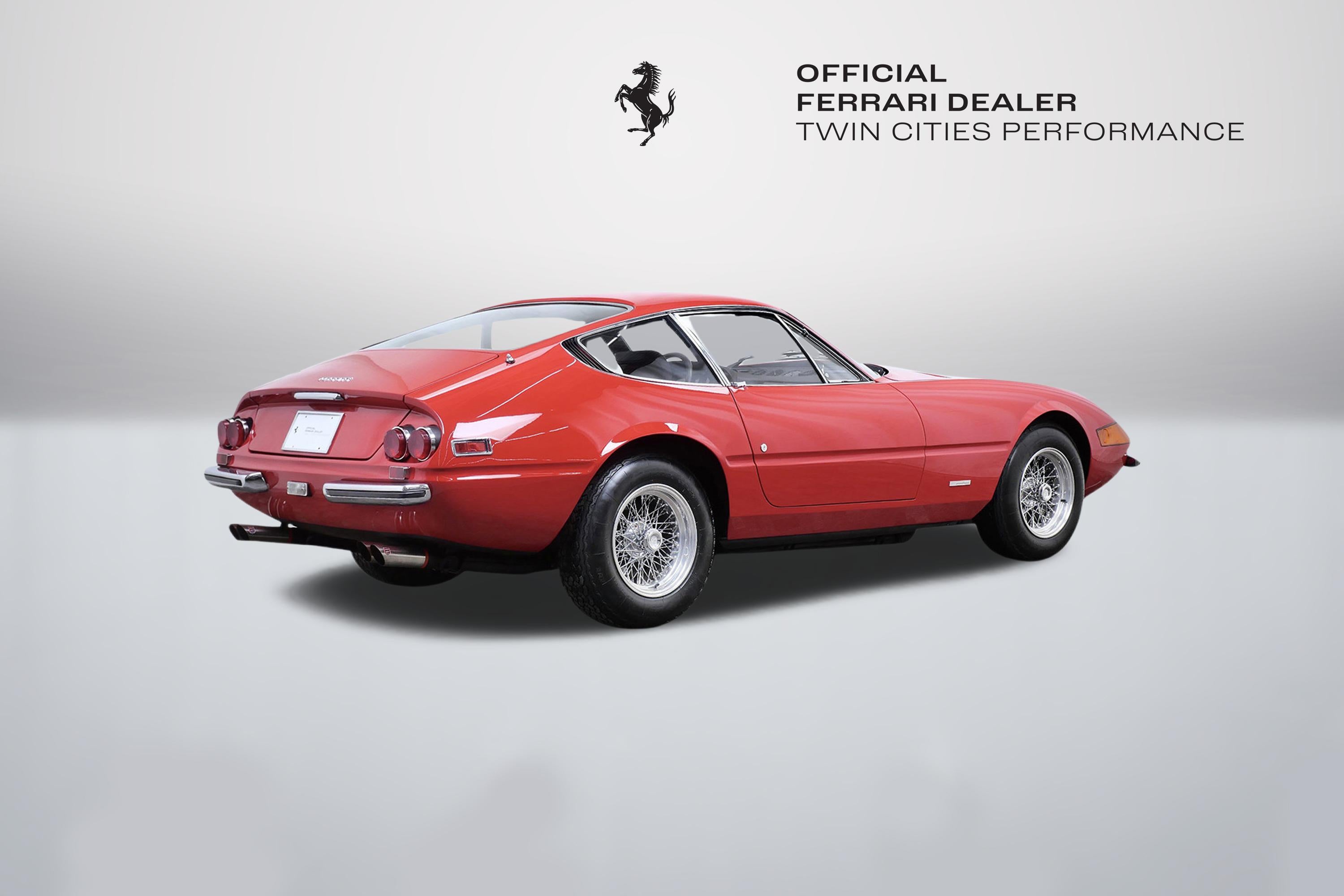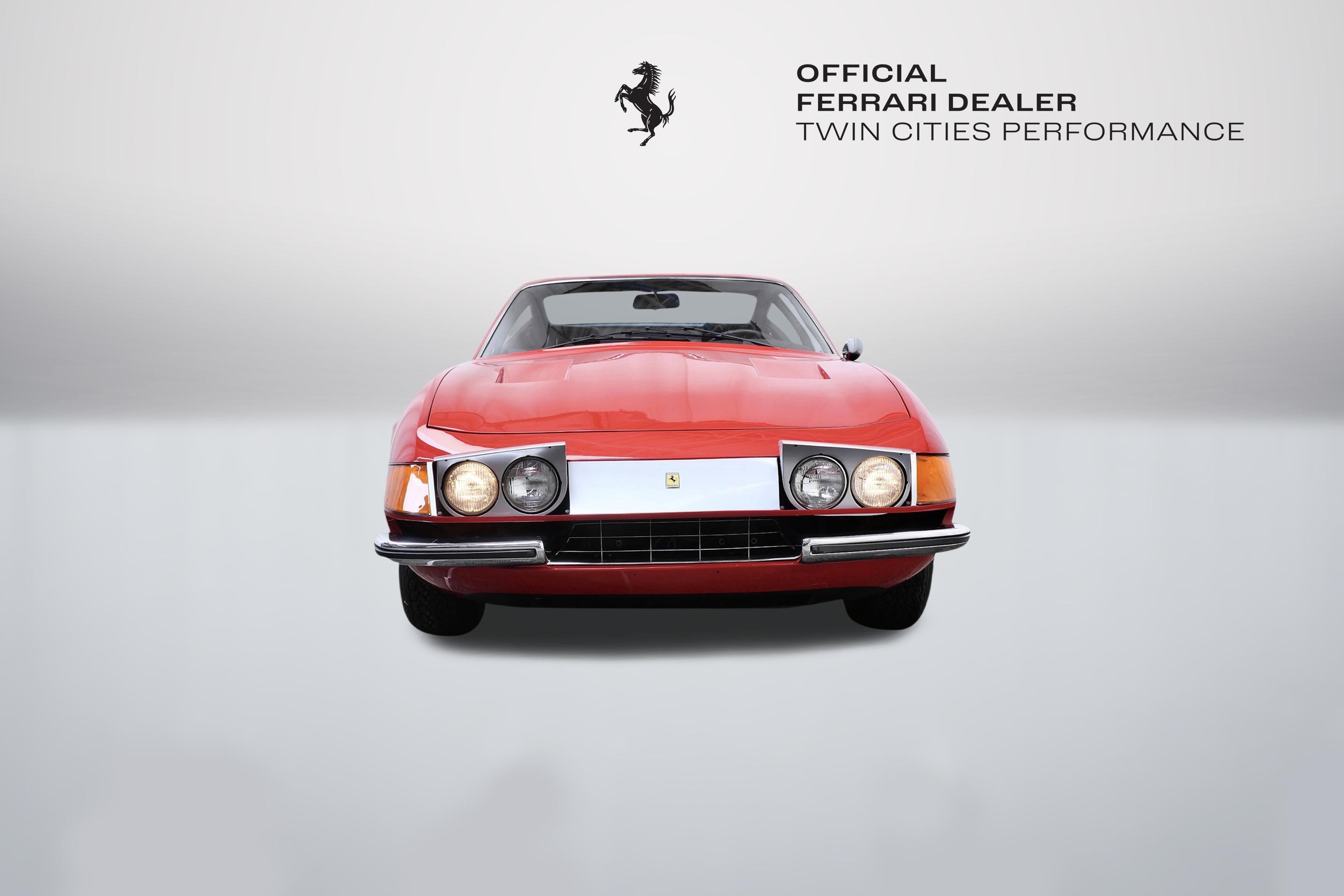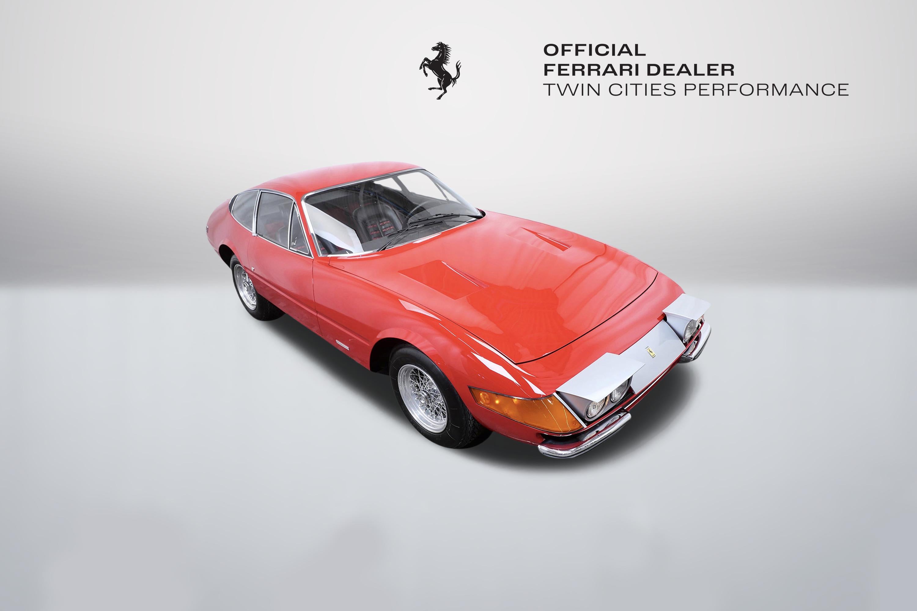 This 1971 Ferrari 365 GTB/4 Daytona was originally finished new in Rosso Chiaro over Nero VM 8500 Connolly. Options included the rare Silvergrey Painted Nose Band, Air Conditioning, and Power Windows. This vehicle was delivered new to Luigi Chinetti Motors April 15th, 1971. Vehicle was restored in the late 90’s. It comes with books, toolkit, and extra set of Cromodora wheels, and currently equipped with the Borrani wire wheels. This vehicle will be going through the Classiche certification process here at Twin Cities Performance Ferrari. We will be going through all mechanicals to meet our expectations, and all maintenances will be up to date. Our service department has incredible experience with these cars, as we are one of the few dealers in the world that offer vintage Ferrari restorations. One of our technicians used to work at the Factory in Maranello and toured on the F1 team with Michael Schumacher and Eddie Irvine.
