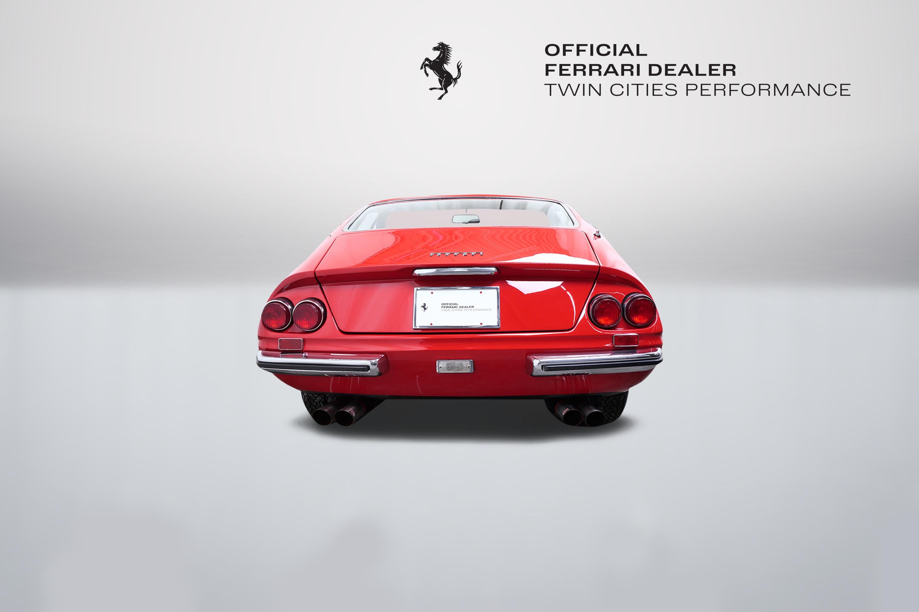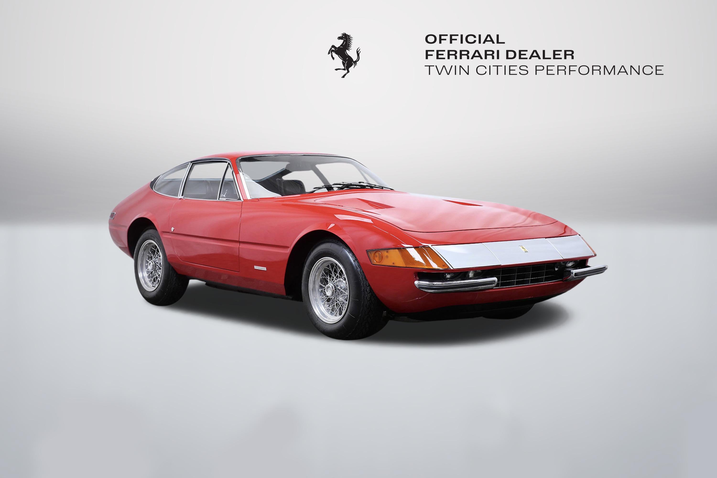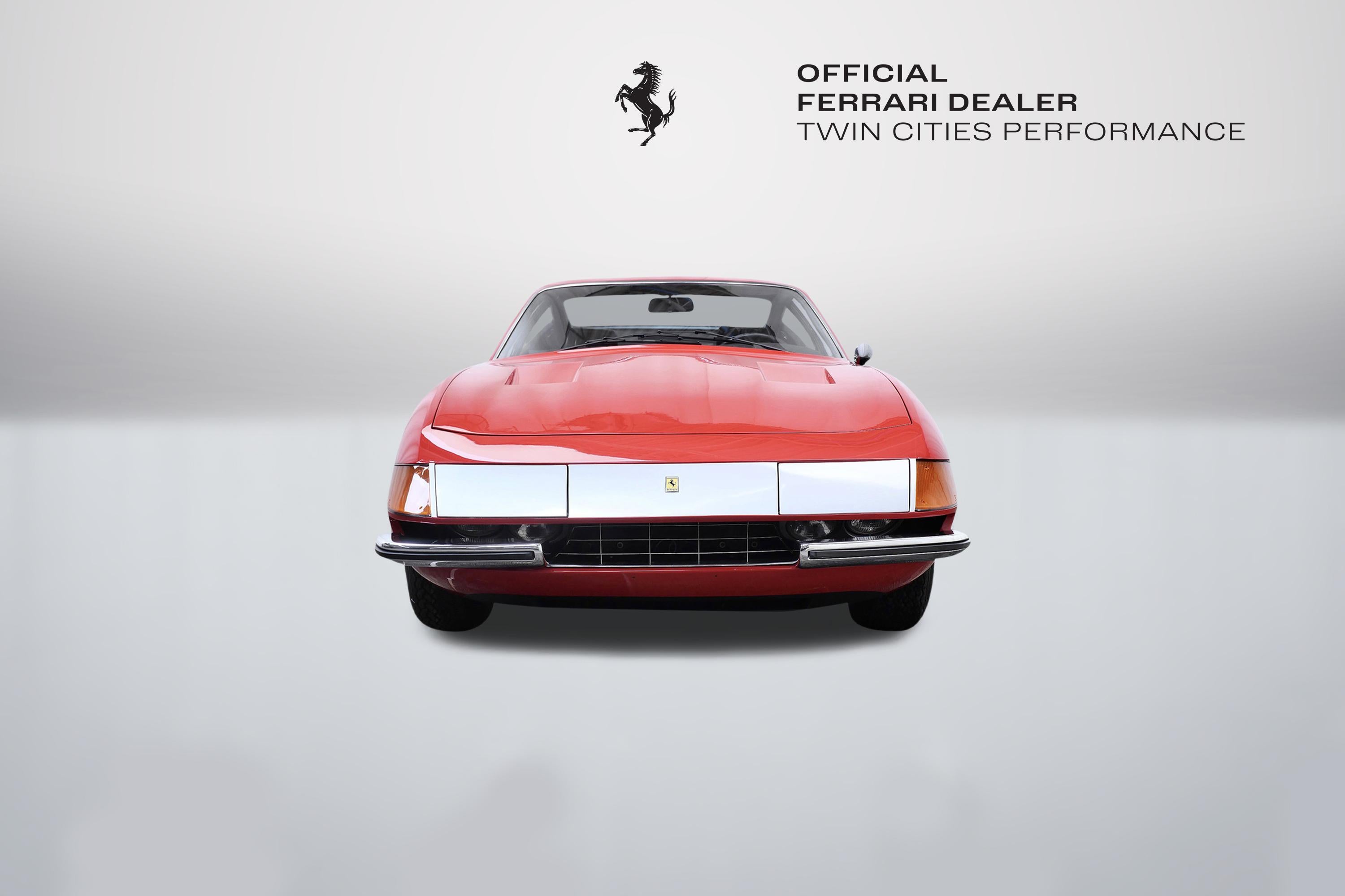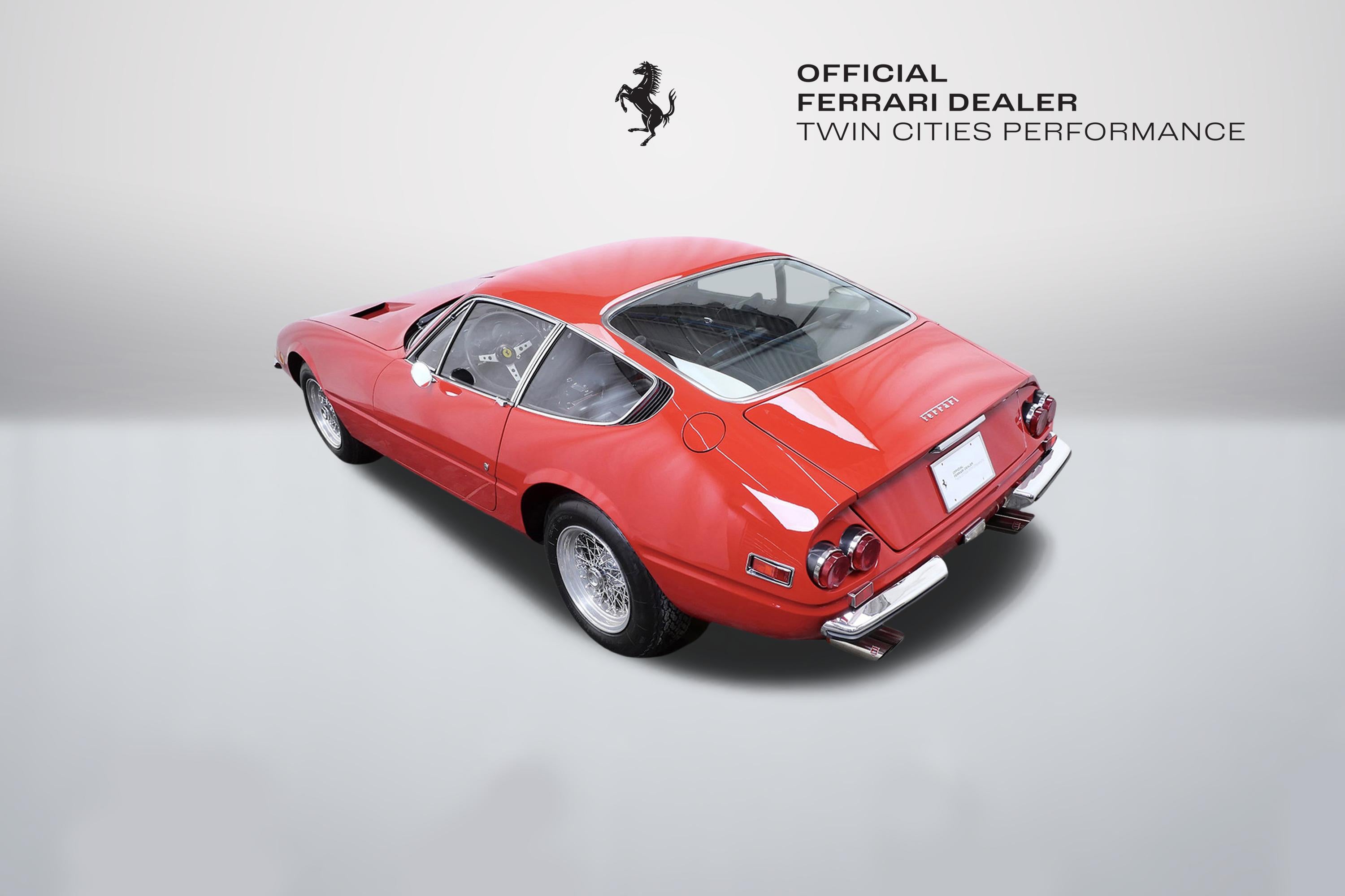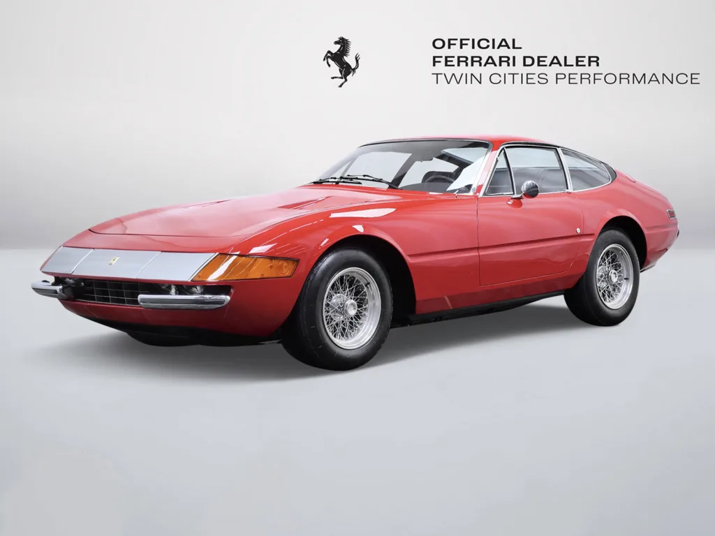This 1971 Ferrari 365 GTB/4 Daytona was originally finished new in Rosso Chiaro over Nero VM 8500 Connolly. Options included the rare Silvergrey Painted Nose Band, Air Conditioning, and Power Windows. This vehicle was delivered new to Luigi Chinetti Motors April 15th, 1971. Vehicle was restored in the late 90’s. It comes with books, toolkit, and extra set of Cromodora wheels, and currently equipped with the Borrani wire wheels. This vehicle will be going through the Classiche certification process here at Twin Cities Performance Ferrari. We will be going through all mechanicals to meet our expectations, and all maintenances will be up to date. Our service department has incredible experience with these cars, as we are one of the few dealers in the world that offer vintage Ferrari restorations. One of our technicians used to work at the Factory in Maranello and toured on the F1 team with Michael Schumacher and Eddie Irvine.