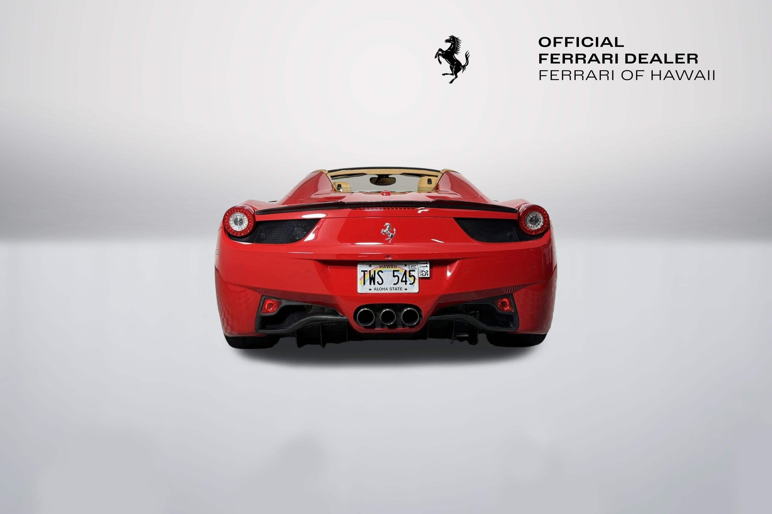 Certified. Mainland Buyer? Shipping Made Easy! Ask About Kama'aina pricing and Special shipping to Neighbor islands. Velocity Honolulu proudly presents this outstanding 2013 Ferrari 458 Spider, finished in Rosso Corsa with a Beige interior and loaded with premium features. Nationwide delivery available seamless, secure, and hassle-free. 20" Sports Painted Alloy Wheels, ABS brakes, AFS Advanced Frontlighting System Headlights, Brake Calipers in Red Color, Carbon Fiber Steering Wheel w/LED Rev Display, Color Upon Request for Seat Piping - Nero, Colored Seat Belts - Rosse, Daytona Style for Seat, Electric Seats, Electric Steering Column, Electronic Stability Control, Front & Rear Parking Sensors, Front dual zone A/C, Front Parking Lifter, Full Electric Electrochromic Mirrors w/Memory, Full Electric Seats, Heated door mirrors, HELE (High Emotion Low Emission) System, Illuminated entry, Interior Color for Upper Zone, iPod Installation, Leather Seat Trim, Leather Upholstery for Headliner - Beige, Low tire pressure warning, Michelin Tires, Navigation System, Red Tachometer Display, Remote keyless entry, Reverse Camera System, Scuderia Ferrari Shields On Fenders, Traction control. Clean CARFAX. Rosso Corsa 4.5L V8 DI DOHC 7-Speed Manual Dual Clutch RWD JN Group "Where Your Experience Matters" Ferrari Approved Details: