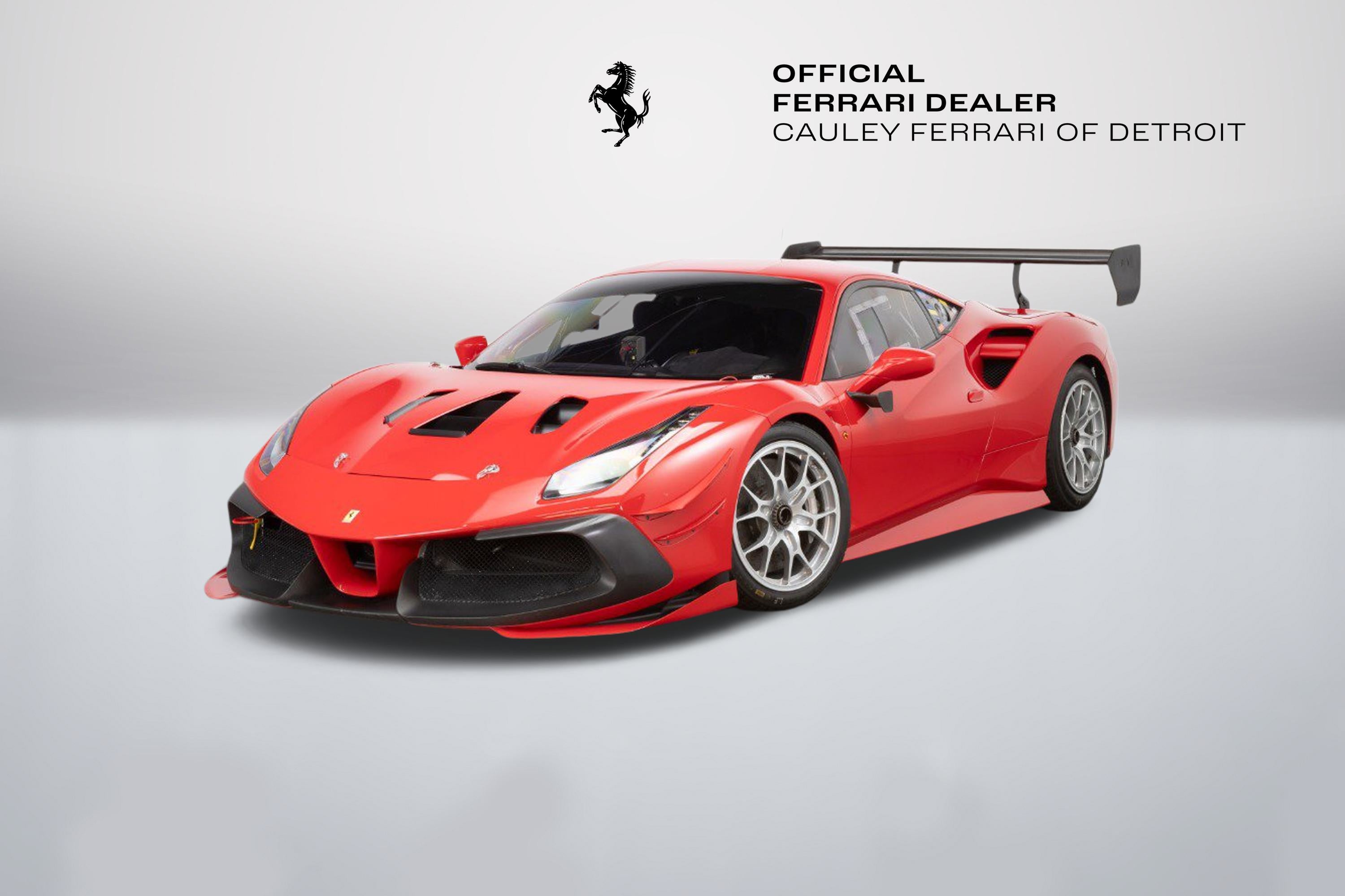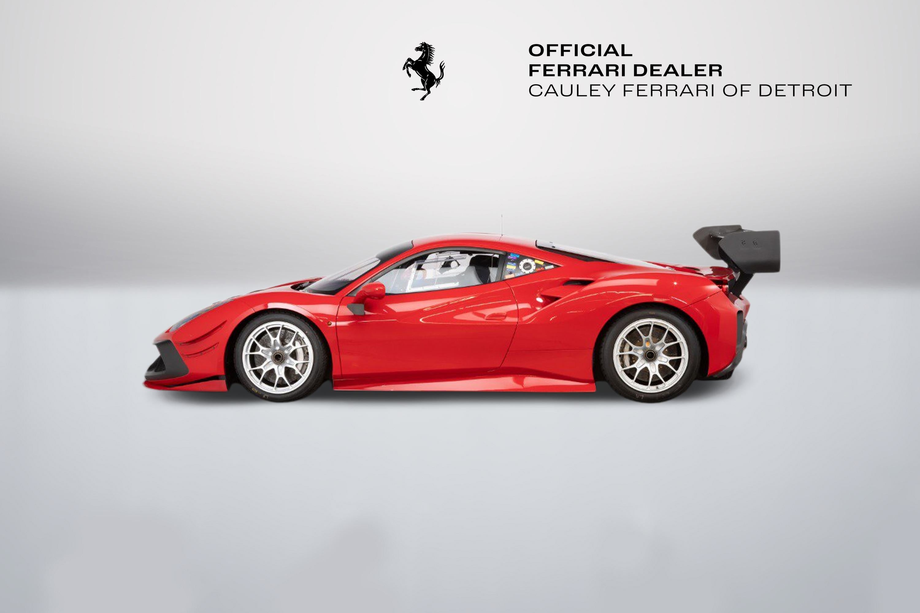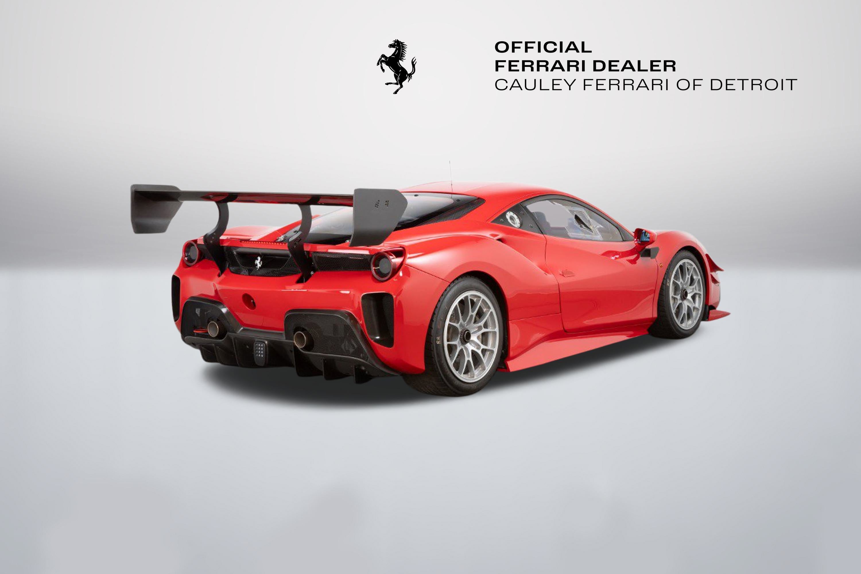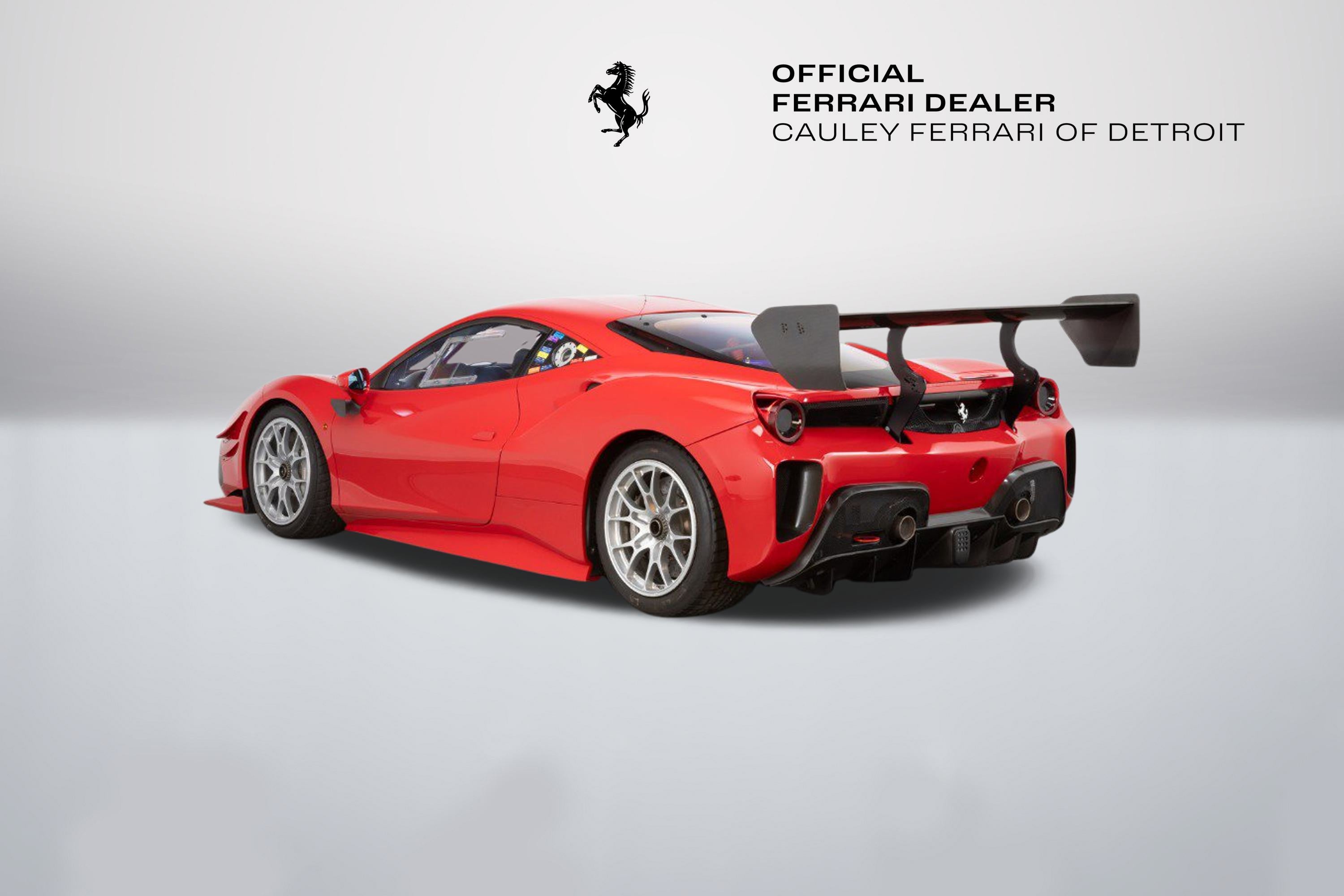 Cauley Ferrari of Detroit is very excited to offer you this 2022 Ferrari 488 Challenge EVO finished in classic Rosso Corsa over a Nero race interior. Currently, it has just 4,414 Miles. IT has been managed and serviced by HP-Tech Motorsport since new. Included with the sale are two extra sets of rims, a large driver and passenger seat, radio, Race Logic VBox Video and Data Recorder, and a Chill Out Cool Suit System. Exterior color and seat sizes are the only options available when ordering. This is not a road-legal car, but a true dedicated race car. Prospective owners have the option to not only purchase the car but the ability to race it in a one-make series throughout North America in Ferrari Challenge. Give us a call at 248-538-9600 or email info@cauley.net to set up a private viewing of this car or stop by our showroom in West Bloomfield, MI to see it up close. In 1993, Ferrari first introduced the Ferrari Challenge race series, which is a Ferrari-only championship that gives its clients the ability to purchase a turnkey Ferrari race car from the factory. Owners are then allowed to race their Challenge car in a Ferrari-sanctioned race series where full support will be offered from crews, fuel, tires, parts, etc. You just show up and drive! The first Ferrari model offered in the Challenge series was the 348 Berlinetta and a race variant has been offered for all subsequent models - the F355, 360, F430, 458, and lastly the 488. The Ferrari challenge now encompasses three official championships around the world, North America, Asia-Pacific, and Europe. Competitors from each series are brought together at the Annual World Finals called the Finali Mondiali which changes location every year. Headlining the changes between the previous 488 Challenge and the new EVO package are upgraded aerodynamics, producing a significant increase in downforce, improved tires from Pirelli that will enable the drivers to push harder over the full race distance, plus the upgraded electronics and driver interface to support all of these enhancements. Visually, the new 488 Challenge EVO is most strikingly marked by a completely revised front end, which is home to the most significant aerodynamic changes to the car. While the new nose is certainly a significant aesthetic improvement, it's the space underneath the new nose that has the most important aerodynamic updates with a new floor and adjustable flaps incorporated. The flaps offer an important tuning opportunity, allowing the driver to select between high and low downforce configurations. Passing down the side of the car, the 488 Challenge EVO is also marked by a small winglet underneath the wing mirrors. This winglet seems to be pointed in such a way as to generate lift, but it is there to redirect hot air from the radiators and ensure it does not enter the intercooler intakes further along the flank of the car. So, while a nominal amount of lift is generated, it is more than counter-balanced by the increase in power that comes from the improved efficiency of the intercoolers. At the rear of the 488 Challenge is a revised rear bumper, which features three critical enhancements. The first is the revised rear-wing endplates, which on the EVO are bowed in slightly at the bottom. These endplates interact with the second enhancement, the holes cut in the bumper behind each rear wheel. These holes exhaust air from the wheel well and reduce the aerodynamic drag on the car. The rear-wing endplates interact with this airflow and help to pull the air out from this space and bring it into contact with the air already being worked by the rear wing. The last, but perhaps most critical enhancement, however, is the revised rear-facing camera. The 488 Challenge car, as well as the EVO, does not have a rear-view mirror, so drivers rely on this camera to see those behind. The Ferrari 488 Challenge EVO also makes use of a new and improved tire, provided by Pirelli. After receiving feedback from the drivers, Pirelli was able to design a tire with a higher performance ceiling and a more consistent performance through the race, allowing drivers to push harder and for longer than previously. Challenge drivers have three Manettino settings to adjust during the heat of competition; one controls braking, while the other two separately adjust the traction control and electronic differential. In essence, they give the driver independent control over when and how intensely the system intervenes. It will take time for any driver to master all the permutations of torque and traction, but this is a car that rewards skill and commitment. If you are not already an experienced race car driver, do not worry. Ferrari offers various driver training programs through its Corso Pilota program at a few different locations in North America. The programs are designed to train everyone from novices to those with real racing experience under their belt.