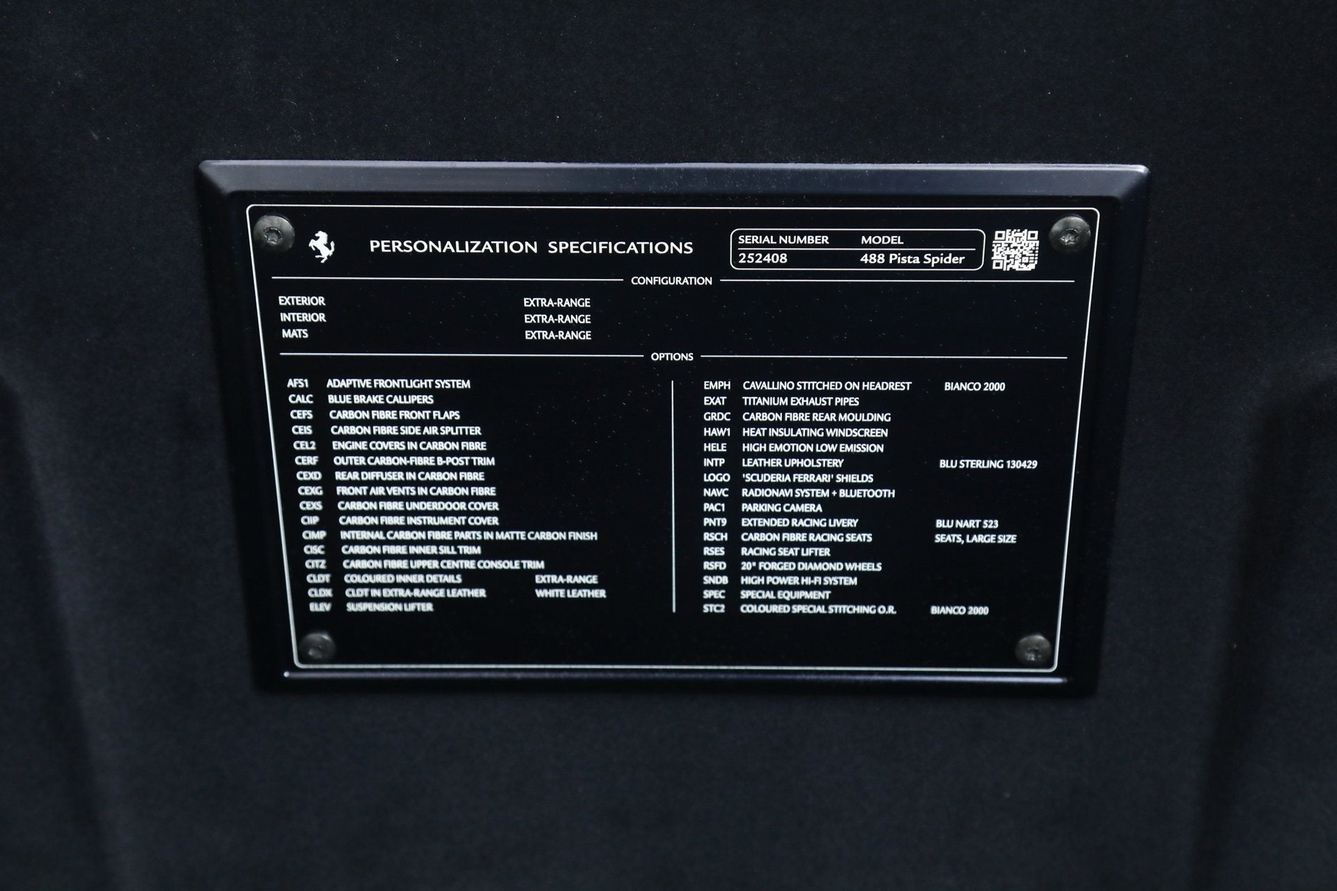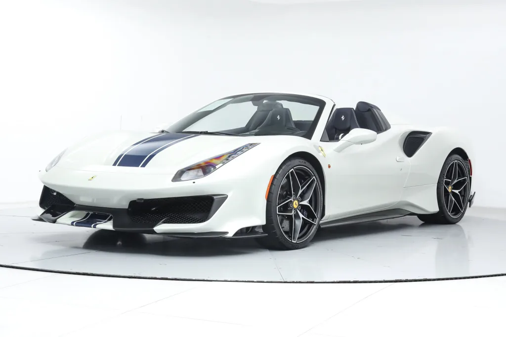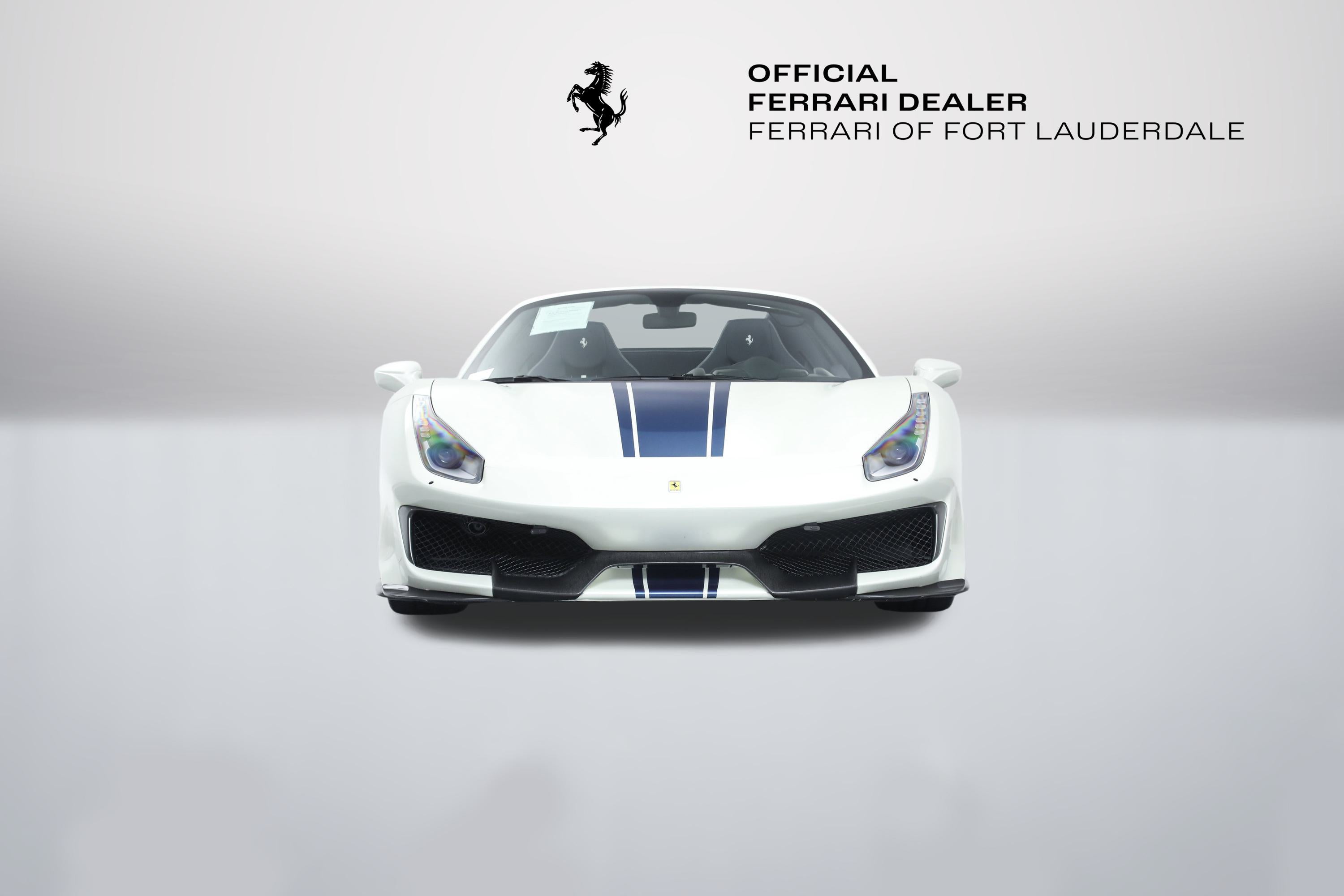 Ferrari 488 Pista Spider - FRONT END PPF - - FERRARI CERTIFIED PRE-OWNED - AVAILABLE EXTENDED FERRARI WARRANTY - - Bianco Italia over Blu Sterling - Low Miles - Pristine Condition - Many Fine Options - Expertly Maintained by Authorized Ferrari Dealers - Ferrari Power Warranty to 3/23/26 - Complimentary Ferrari Genuine Maintenance Service to 2/21/27 - Factory Options: - Suspension Lifter - Extra-Range Paint Color - Extended Racing Livery in Blu NART - Carbon Fiber Front Flaps - Carbon Fiber Front Air Vents - Carbon Fiber Side Air Splitters - Carbon Fiber Outer B-Post Trim - Carbon Fiber Rear Diffuser - Carbon Fiber Rear Moulding - Carbon Fiber Engine Covers - Carbon Fiber Underdoor Covers - Carbon Fiber Instrument Cover - Carbon Fiber Upper Center Console - Carbon Fiber Inner Sill Trim - Carbon Fiber Internal Components in Matte Finish - Carbon Fiber Racing Seats - Racing Seat Lifter - 20-inch Forged Diamond Wheels - Blue Brake Calipers - Scuderia Ferrari Shields - Leather Upholstery in Blu Sterling - Cavallino Stitched to Headrests in Bianco - Special Stitching in Bianco - Colored Inner Details in Bianco - High Power HiFi Sound System - Adaptive Frontlight System (AFS) - Titanium Exhaust Pipes - Heat Insulating Windscreen - Navigation System with Bluetooth - Parking Camera - High Emotion Low Emission (HELE) System If you are in the market for a Ferrari 488 Pista, please call or email us today. This Ferrari has passed a multi-point inspection performed by our factory trained technicians, and has been enrolled in the Ferrari Approved Certified Pre-Owned Program. The Certified program makes available up to two years of additional Ferrari Power Approved Warranty coverage. Please see dealer for more details.