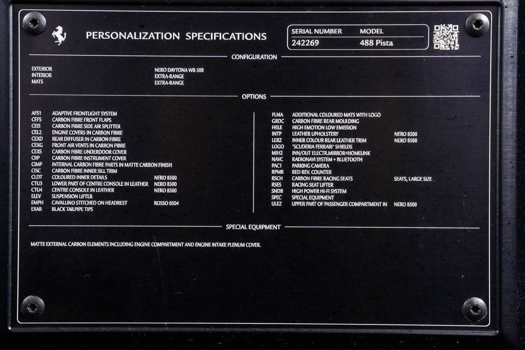 Beautiful Pista for sale. 3,890 miles no stories. Fully serviced and by Ferrari of Dallas. Car has never seen the track or rain. Truly a great example looking for a new home. Car is in immaculate condition. Please do not hesitate to ask for a appraisal as well if you have a trade. Happy Hunting! This 2020 Pista has $120,000 in additional factory customization. It has less than 4,000 miles on the odometer and it can be sold with CPO warranty. The exterior is Nero Daytona and the interior is Alcantara Nera. The original designer of this car added tons of carbon fiber and must-have features. The CARFAX is issue-free. The 488 Pista is one of the best cars Ferrari has ever made. It looks incredible and the performance matches the very best Ferrari has to offer. Optionals: AFS1 AFS SYSTEM CECM EXTERIOR SPECIAL CARBON FIBRE 94084680 CARBONIO STANDARD OPACO CEFS CARBON FIBRE FRONT FLAPS CEIS CARBON FIBRE SIDE AIR SPLITTER CEL2 ENGINE COVERS IN CARBON FIBRE CEXD REAR DIFFUSER IN CARBON FIBRE CEXG FRONT AIRVENTS IN CARBON FIBRE CEXS CARBON FIBRE UNDERDOOR COVER CIIP CARBON FIBRE INSTRUM. CLUSTER CIMP MATT PAINTED INN. CARBON FIBRE CISC CARBON FIBRE INNER SILL TRIM CLDT COLOURED INNER DETAILS 364018500 NERO 8500 (BLACK) CRPT Carpets colors 364000000 EXTRACAMPIONARIO-NOT STANDARD CTU3 LEATHER LOWER TUNNEL 364018500 NERO 8500 (BLACK) CTU4 LEATHER CENTRAL TUNNEL 364018500 NERO 8500 (BLACK) ELEV SUSPENSION LIFTER EMPH HORSE STITCHED ON HEADREST 364100504 ROSSO (RED) 0504 EXAB BLACK CERAMIC EXHAUST PIPES EXTC External colors 68587200 NERO DAYTONA WB 508 FLMA COLOURED MATS WITH LOGO GRDC CARBON FIBRE REAR MOULDING HELE HIGH EMOTION LOW EMISSION INTC Internal colors 364000000 EXTRACAMPIONARIO-NOT STANDARD INTP LEATHER UPHOLSTERY 364018500 NERO 8500 (BLACK) LERZ INNER COLOUR REAR LEATHER TRIM 364018500 NERO 8500 (BLACK) LOGO 'SCUDERIA FERRARI' SHIELDS NAVC RADIONAVI SYSTEM + BLUETOOTH PAC1 PARKING CAMERA RPMR RED REV. COUNTER RSCH CARBON FIBRE RACING SEATS 94078317 SEDILI TAGLIA LARGE RSES RACING SEAT LIFTER SNDB HIGH POWER HIFI SYSTEM ULEZ UPPER PART IN COLORED LEATHER 364018500 NERO 8500 (BLACK) VPPL VEHICLE PERSONALIZATION PLATE As one of the top-selling preowned Ferrari dealers in the nation, Ferrari Dallas takes tremendous pride in offering only the best late-model, low-mileage Ferraris available anywhere in North America. For specific details on the vehicle listed above, please contact any of our qualified sales consultants by calling 888-701-5761. We look forward to assisting you.