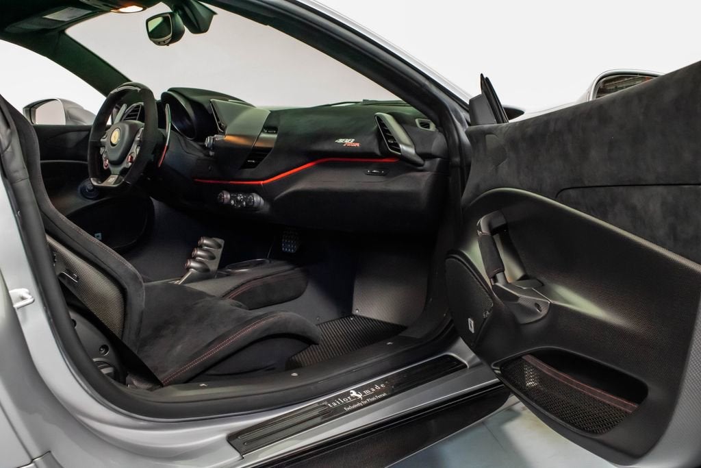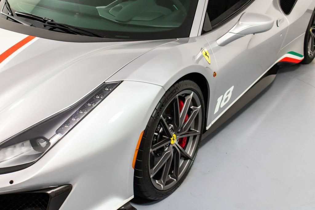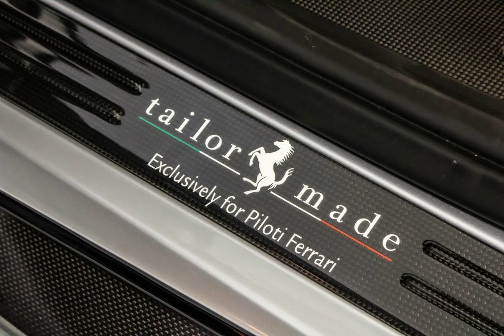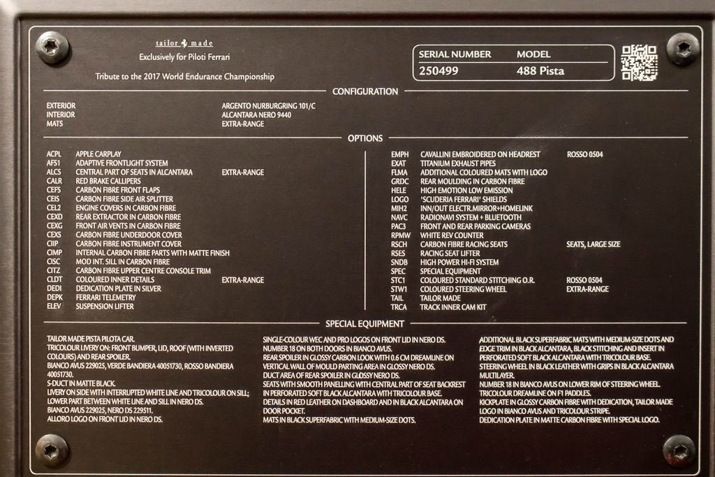 • Apple CarPlay Adaptive Frontlight System Red brake calipers Extensive carbon-fibre exterior and interior trim Carbon fibre engine covers, front flaps, side air splitter, rear extractor, front air vents, underdoor cover, instrument cover, sill trim, and upper centre console trim Titanium exhaust pipes Cavallino embroidered on headrests in Rosso Scuderia Ferrari shields Electrochromic mirrors with HomeLink Navigation with Bluetooth Front and rear parking cameras White rev counter Carbon fibre racing seats, large size Racing seat lifter High-power Hi-Fi system Ferrari Telemetry Suspension lifter Track inner cam kit Coloured steering wheel and stitching in Extra-Range/Rosso tones Description: The Ferrari 488 Pista Piloti is one of the most distinctive and emotionally charged expressions of Ferraris racing heritage, created as a tribute to the marques 2017 World Endurance Championship success. Finished in Argento Nurburgring, this Tailor Made example presents an especially striking interpretation of the Piloti Ferrari theme, pairing its motorsport-inspired livery with a purposeful yet sophisticated specification. The tricolour graphics, WEC and PRO logos, and race number 18 on both doors give the car an unmistakable competition-bred presence, while the extensive use of glossy carbon fibre reinforces its aggressive, lightweight character. Inside, the cabin is trimmed in Nero Alcantara, delivering the focused atmosphere expected of Ferraris most track-oriented special series cars, yet elevated by bespoke Tailor Made details throughout. Tricolour accents on the steering wheel, F1 paddles, and seat design tie the cockpit directly back to Ferraris endurance racing identity, while Rosso embroidery and custom detailing add contrast and craftsmanship. Carbon fibre racing seats, a white rev counter, telemetry, and the track inner cam kit underline the Pistas driver-centric intent, while features such as Apple CarPlay, navigation, parking cameras, and a suspension lifter bring welcome usability. This 488 Pista Piloti is a compelling blend of Ferrari Corse inspiration, Tailor Made exclusivity, and road-going performance, offering a specification that feels every bit as special as the cars place in Ferrari history.