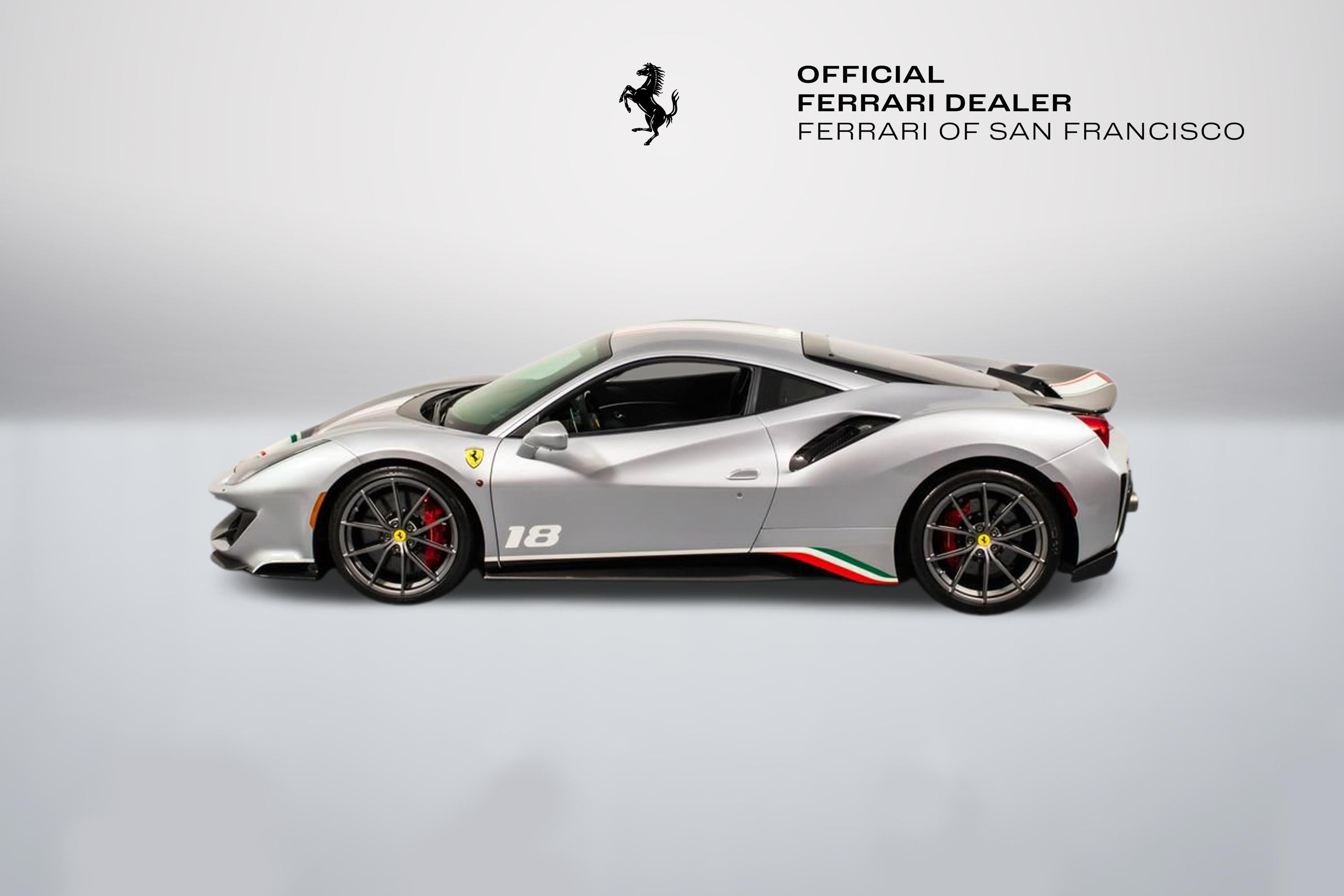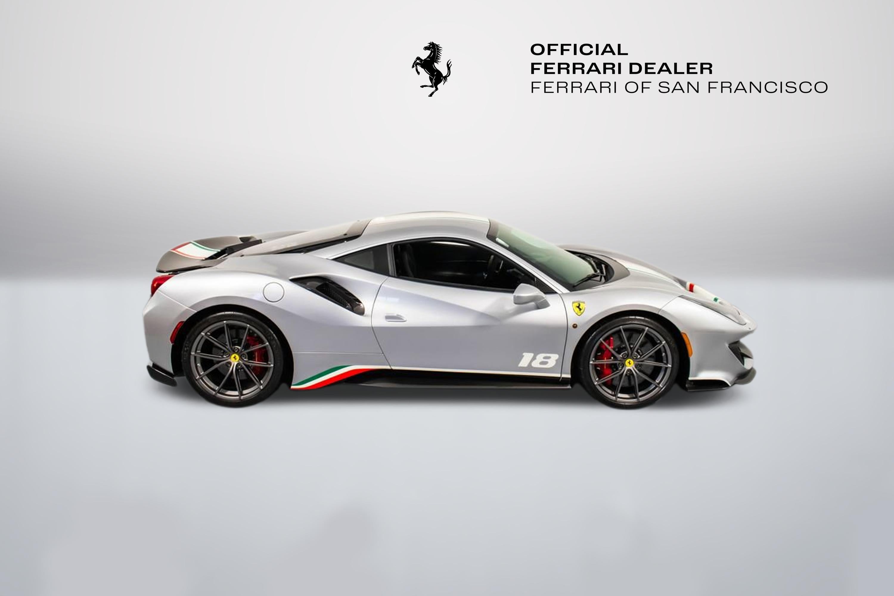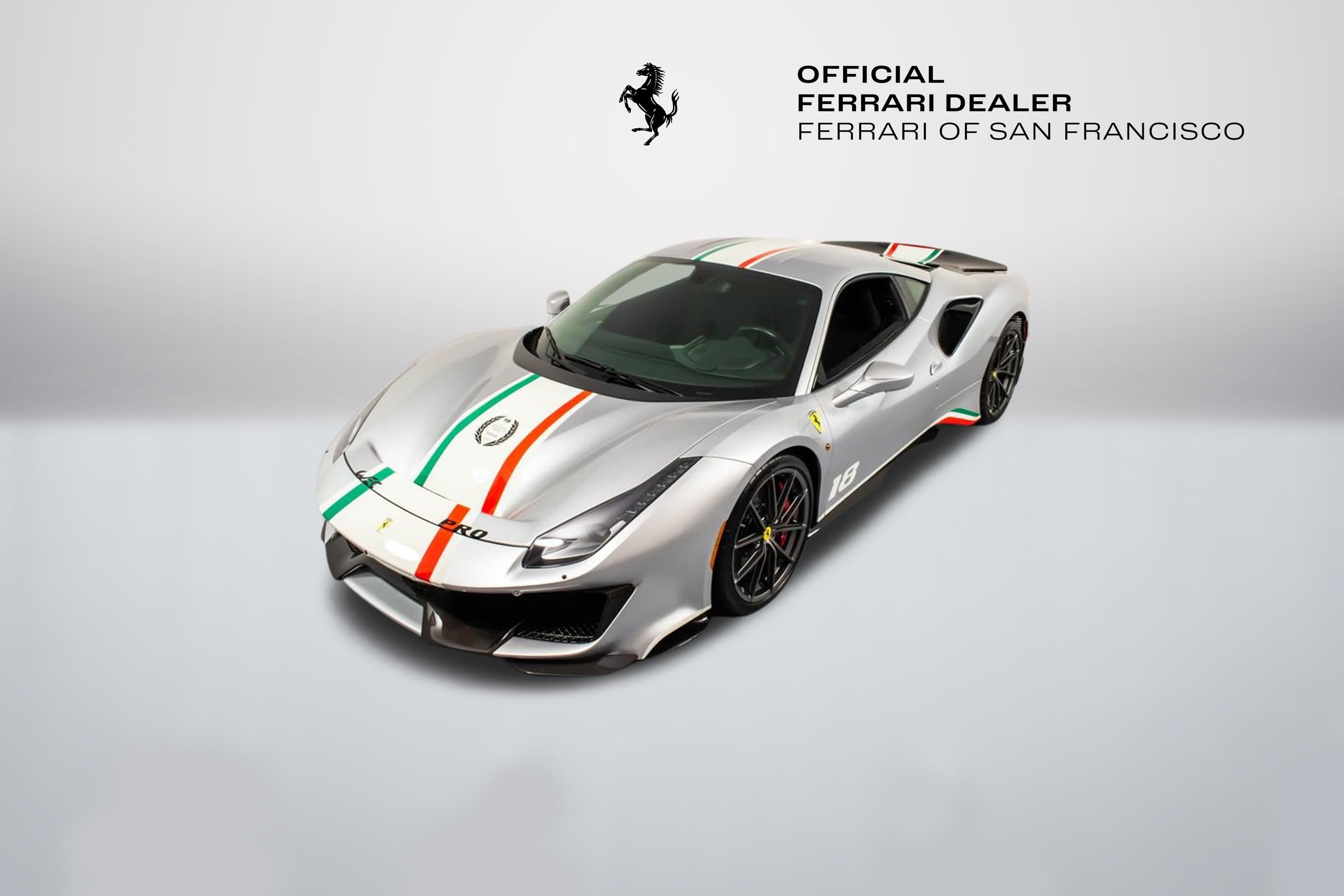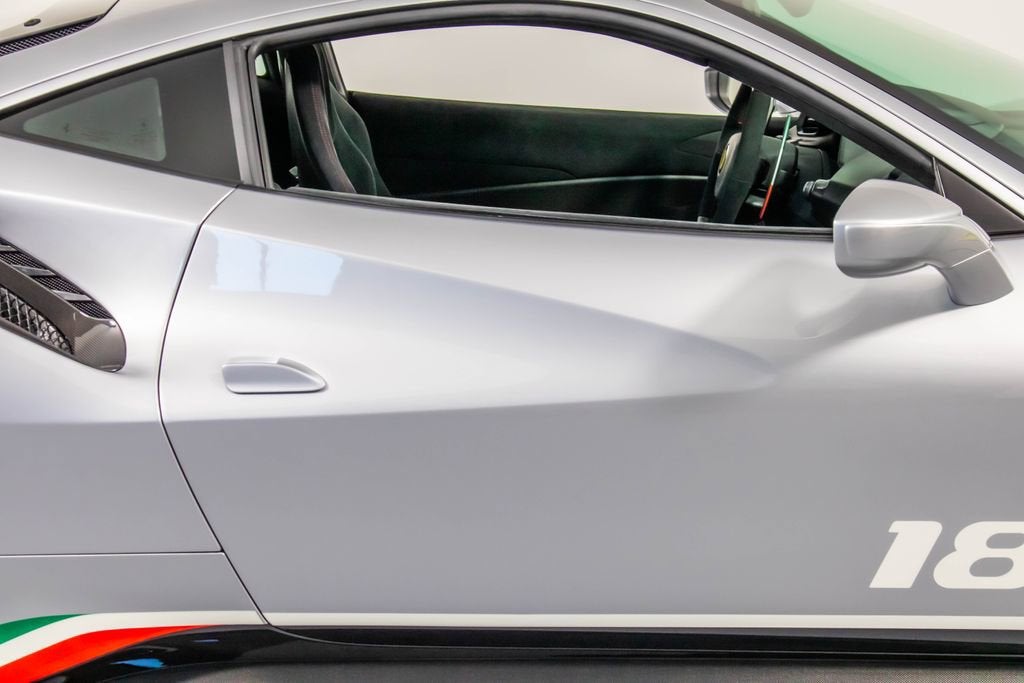 Tailor Made Ferrari 488 Pista Piloti Exterior: Argento Nurburgring 101/C Interior: Alcantara Nero 9440 Mats: Extra-Range Tailor Made / Special Equipment Highlights: Tribute to the 2017 World Endurance Championship Tricolour livery with front bumper, hood, roof, and rear spoiler detailing Number 18 on both doors in Bianco Avus WEC and PRO logos on front lid Tailor Made dedication plate in silver Tailor Made logo and tricolour stripe details throughout Glossy carbon-fibre rear spoiler and kickplate Tricolour dreamline accents on F1 paddles and steering wheel Factory Options Include: