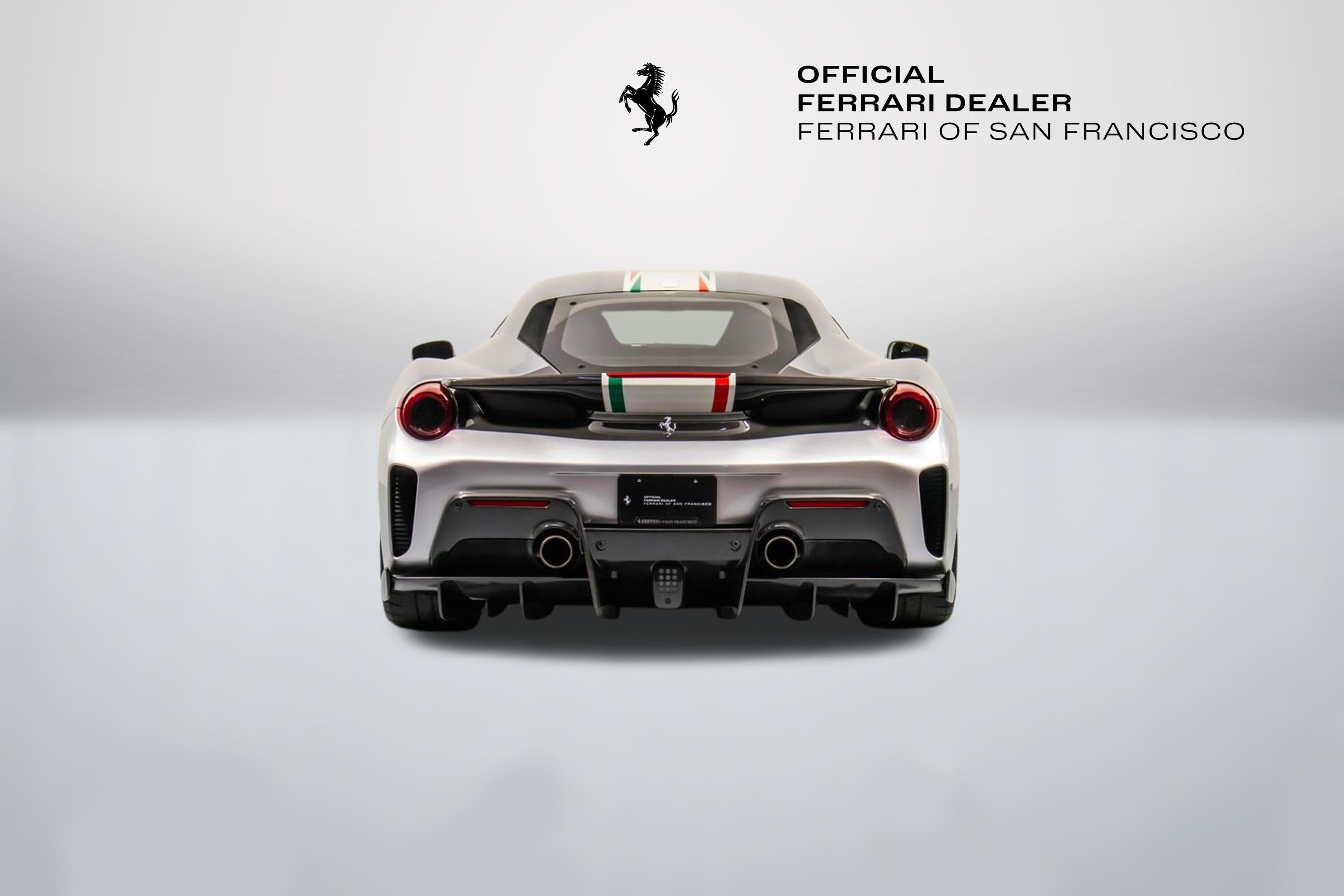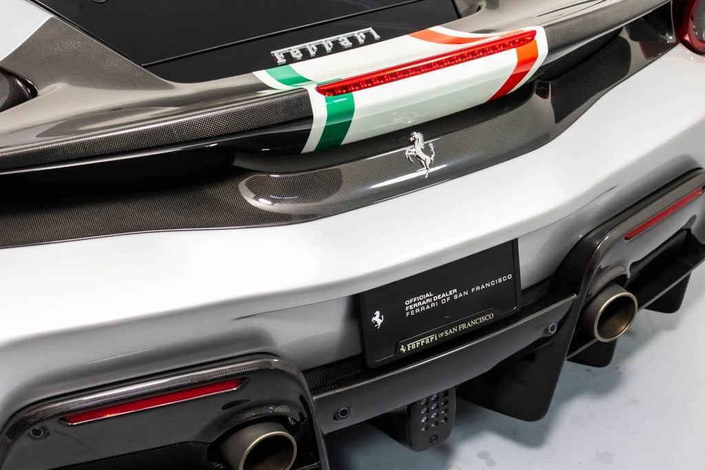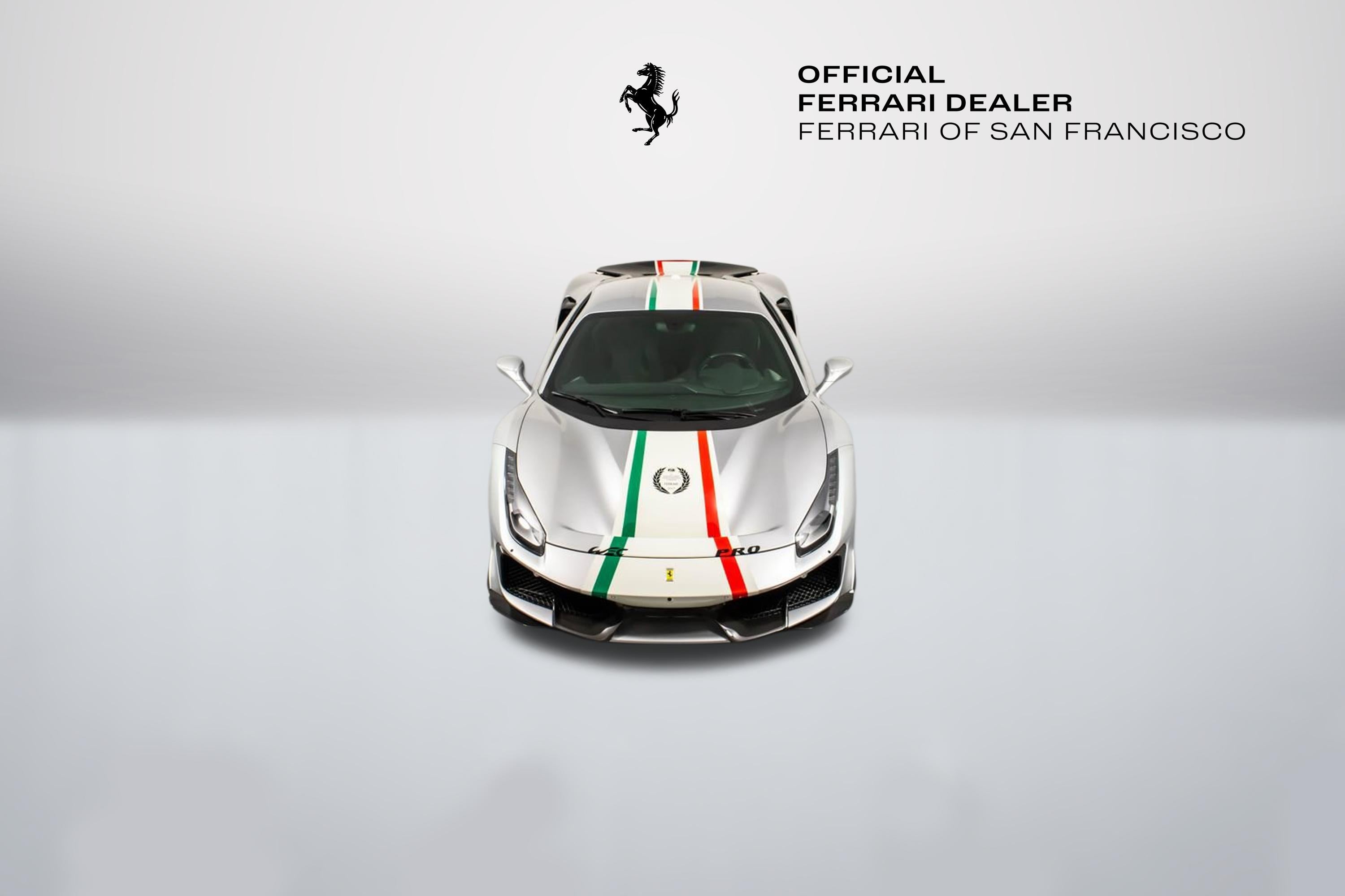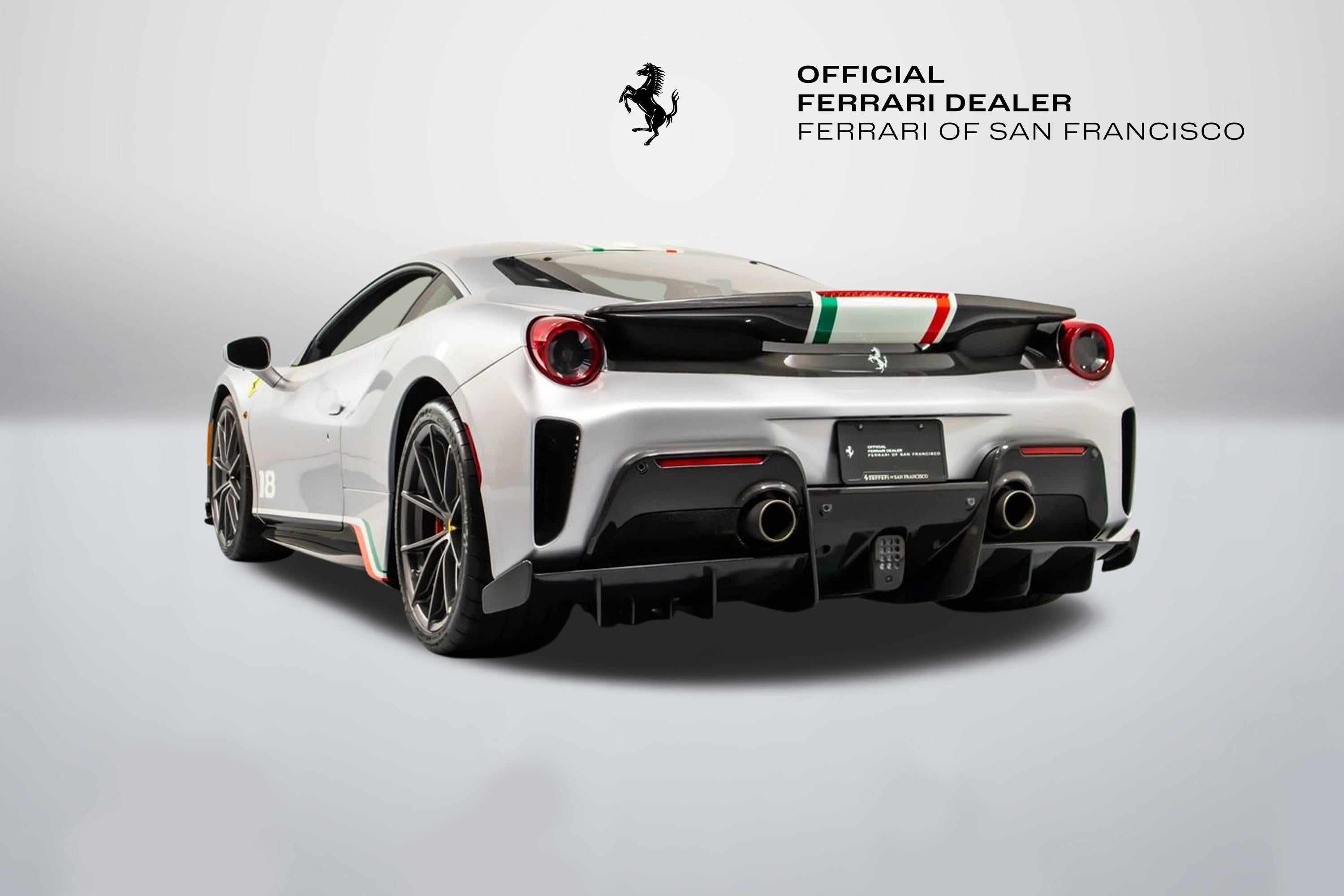 Tailor Made Ferrari 488 Pista Piloti Exterior: Argento Nurburgring 101/C Interior: Alcantara Nero 9440 Mats: Extra-Range Tailor Made / Special Equipment Highlights: Tribute to the 2017 World Endurance Championship Tricolour livery with front bumper, hood, roof, and rear spoiler detailing Number 18 on both doors in Bianco Avus WEC and PRO logos on front lid Tailor Made dedication plate in silver Tailor Made logo and tricolour stripe details throughout Glossy carbon-fibre rear spoiler and kickplate Tricolour dreamline accents on F1 paddles and steering wheel Factory Options Include: