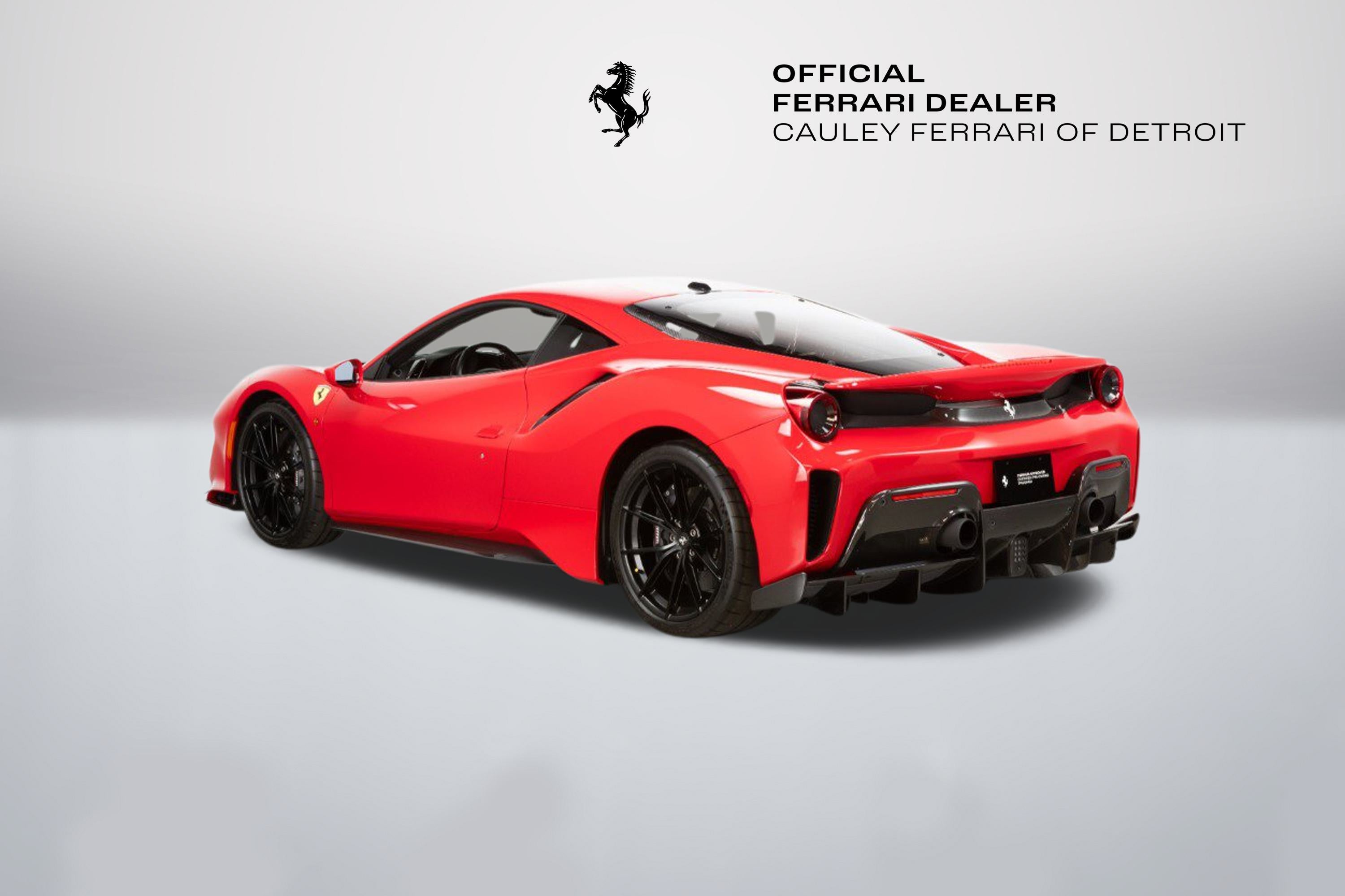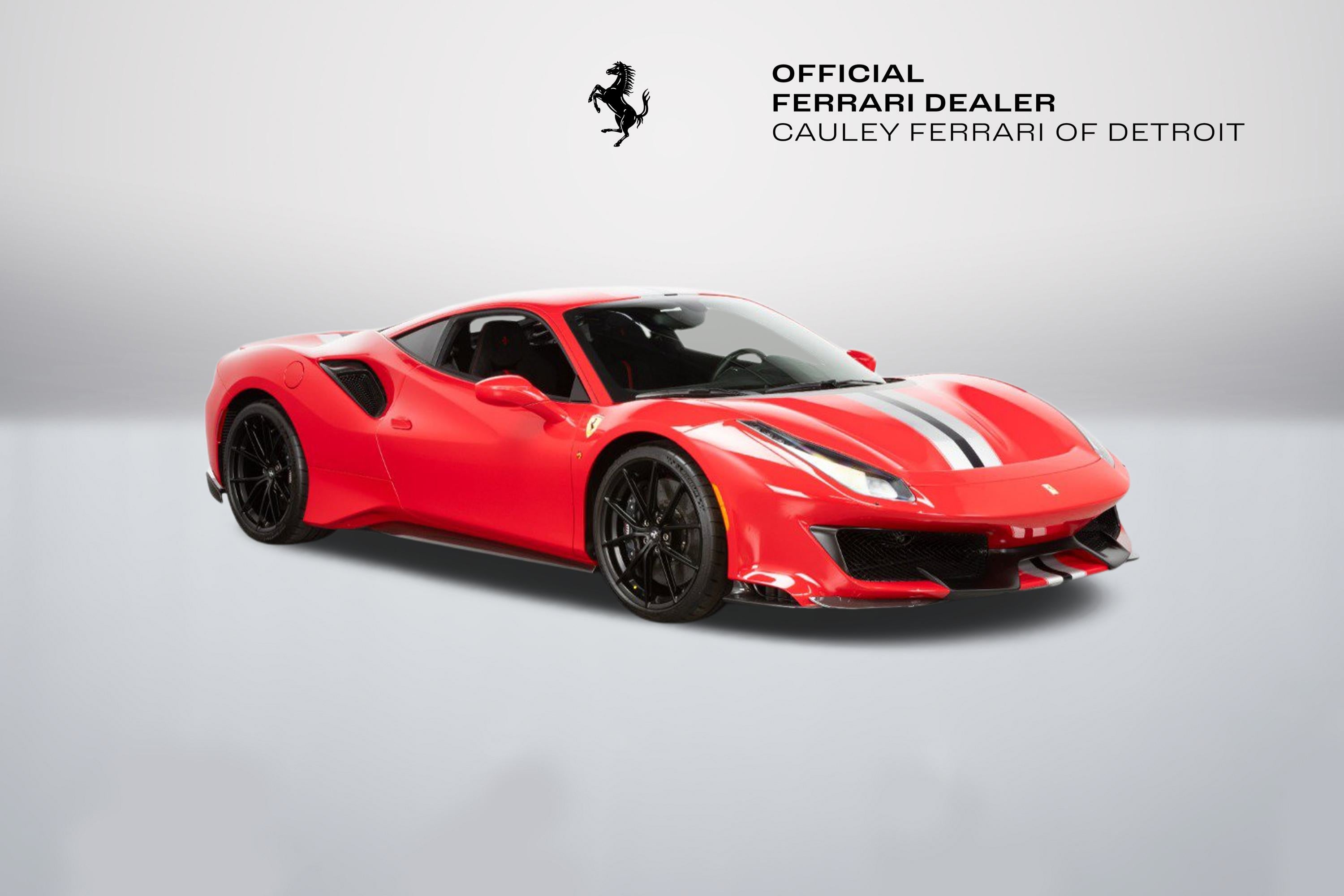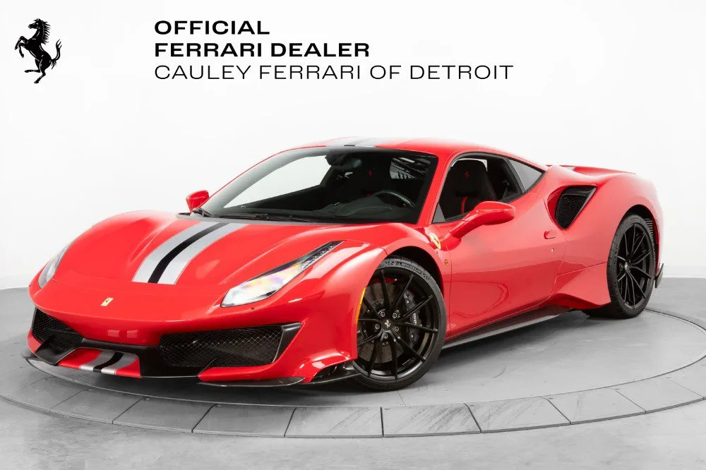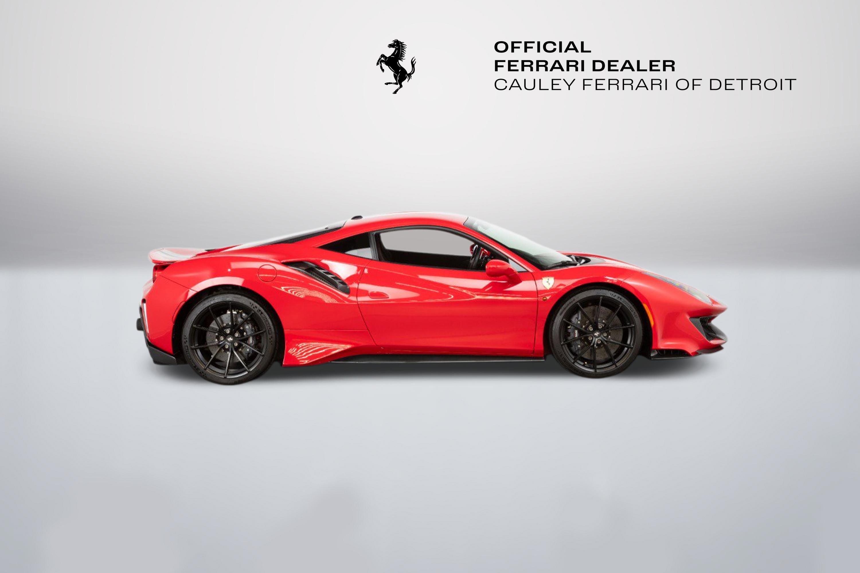 Cauley Ferrari of Detroit is very excited to offer you this gorgeous 2020 Ferrari 488 Pista in the iconic Rosso Corsa with an Argento Nurburgring and Blu America Livery over Nero Alcantara with a Central Stripe in Rosso Ferrari on the seats. It has all the right options - suspension lifter, carbon fiber options throughout the interior and exterior, and engine bay as well, and much more. It has completed 5,419 miles, and we are selling this as a Ferrari Approved Certified Pre-Owned Vehicle. It is currently under a Ferrari Bumper-to-Bumper Warranty through 4/3/27 and this will be followed by a 1-year Ferrari Power Warranty through 4/3/28. The free scheduled maintenance plan is in effect until 4/3/27. Please ask us about our financing and leasing options available through Ferrari Financial Services (FFS). We can offer you monthly financing as far out as 84 months, Balloon financing up to 60 months, as well as Open-End Leasing scenarios. FFS is available on all new and pre-owned Ferrari models. These flexible payment options make getting into a Ferrari easier than ever before. Let us show you how. Give us a call at 248-538-9600 to set up an appointment for a closer look or stop by our showroom in West Bloomfield, MI. Factory Options: - Adaptive Frontlight System - Carbon Fibre Side Air Splitter - Engine Covers in Carbon Fibre - Rear Diffuser in Carbon Fibre - Carbon Fibre Underdoor Cover - Coloured Inner Details Rosso Ferrari 130421 - Carbon Fibre Hub Caps - Suspension Lifter - Cavallino Stitched on Headrest Rosso 0504 - Black Tailpipe Tips - Carbon Fibre Rear Moulding - High Emotion Low Emission - 'Scuderia Ferrari' Shields - Inner/Outer Electrochromic Mirrors + Homelink - Radio/NAV System + Bluetooth - Parking Camera - Two-Tone Stripe Argento Nurburgring - 20" Dark Forged Wheels - Red Rev Counter - Carbon Fibre Racing Seats Large Size Seats - Racing Seat Lifter - Integrated Audio System - Coloured Special Stitching Rosso 0504 The Ferrari 488 Pista is a track-focused, limited-edition supercar at the time featured the most powerful V8 engine ever produced by Ferrari, that boasted exceptional performance with a heavy emphasis on lightweight design and aerodynamic efficiency, drawing heavily from the company's racing experience with the 488 Challenge and GTE cars; its name translates to "track" in Italian, signifying its pure racing pedigree and exceptional handling capabilities on the circuit.