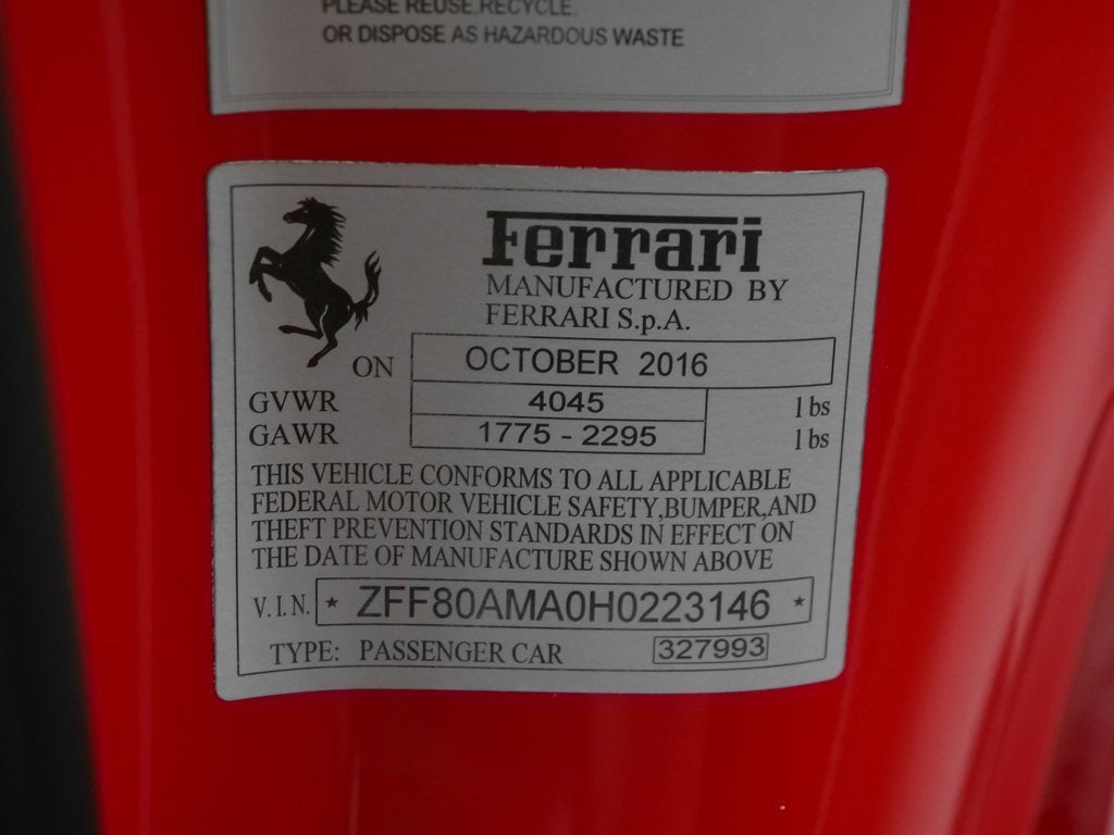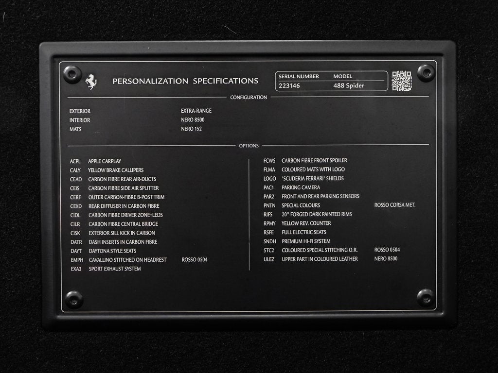 Official Ferrari Dealer Cavallino Rosso St. Louis is proud to present this Ferrari Approved Certified Pre-Owned 2017 Ferrari 488 Spider. Finished in breathtaking multi-layer Rosso Corsa Met over a Nero interior, this 488 Spider is exceptionally equipped and showcases an extensive array of factory carbon fibre options throughout the exterior and cabin, amplifying both its visual drama and performance-focused character. 488 Spider Multi-Layer Rosso Corsa Met Exterior Nero (Black) Interior Carbon Fibre Driver Zone + LED Shift Indicators Rear Diffuser in Carbon Fibre Carbon Fibre Rear Air-Ducts Carbon Fibre Side Air Splitter Outer Carbon-Fibre B-Post Trim Carbon Fibre Central Bridge Carbon Fibre Dashboard Inserts Exterior Sill Kick in Carbon Daytona Style Seats Yellow Brake Calipers Apple CarPlay Sport Exhaust Pipes Horse Stitched on Headrest Performance: At the heart of the 488 Spider lies a 3.9-liter twin-turbocharged mid-mounted V8 producing an astonishing 661 horsepower at 8,000 rpm and 561 lb-ft of torque. Paired with a lightning-fast 7-speed F1 dual-clutch transmission, this open-top Ferrari launches from 060 mph in approximately 3.0 seconds. Featuring SCM3 magnetic suspension damping, Carbon Ceramic Brakes (CCM), Slide Slip Control (SSC), and Ferraris iconic Manettino steering wheel drive mode selector, the 488 Spider delivers razor-sharp handling, relentless acceleration, and an unmistakable Ferrari soundtrack intensified by its sport exhaust system. This 2017 Ferrari 488 Spider represents the pinnacle of open-air performance and Italian craftsmanship, now available at Official Ferrari Dealer Cavallino Rosso St. Louis. This Ferrari Approved Certified Pre-Owned vehicle has undergone Ferraris comprehensive 101-point inspection and offers the confidence of a 2-Year / Unlimited Mile warranty included at no additional cost. Official Ferrari Dealer Cavallino Rosso St. Louis, located at 3000 S Hanley Road in St. Louis, Missouri, is your gateway to the world of high-performance Ferraris and luxury vehicles. Cavallino Rosso St. Louis is the premier destination for enthusiasts seeking the iconic luxury and performance synonymous with the Ferrari brand. Cavallino Rosso has the capability to sell and deliver vehicles to customers throughout the United States. All vehicles are fully inspected and serviced in our state of the art Ferrari Service Center. As a member of the Indigo Auto Group, Cavallino Rosso embodies the same commitment to excellence and passion for luxury vehicles that define the group as a whole. To get the most accurate and up-to-date information regarding Cavallino Rosso St. Louis's services and vehicle availability please visit our official website at cavallinorossostlouis.com or call us directly at 314-626-9547.