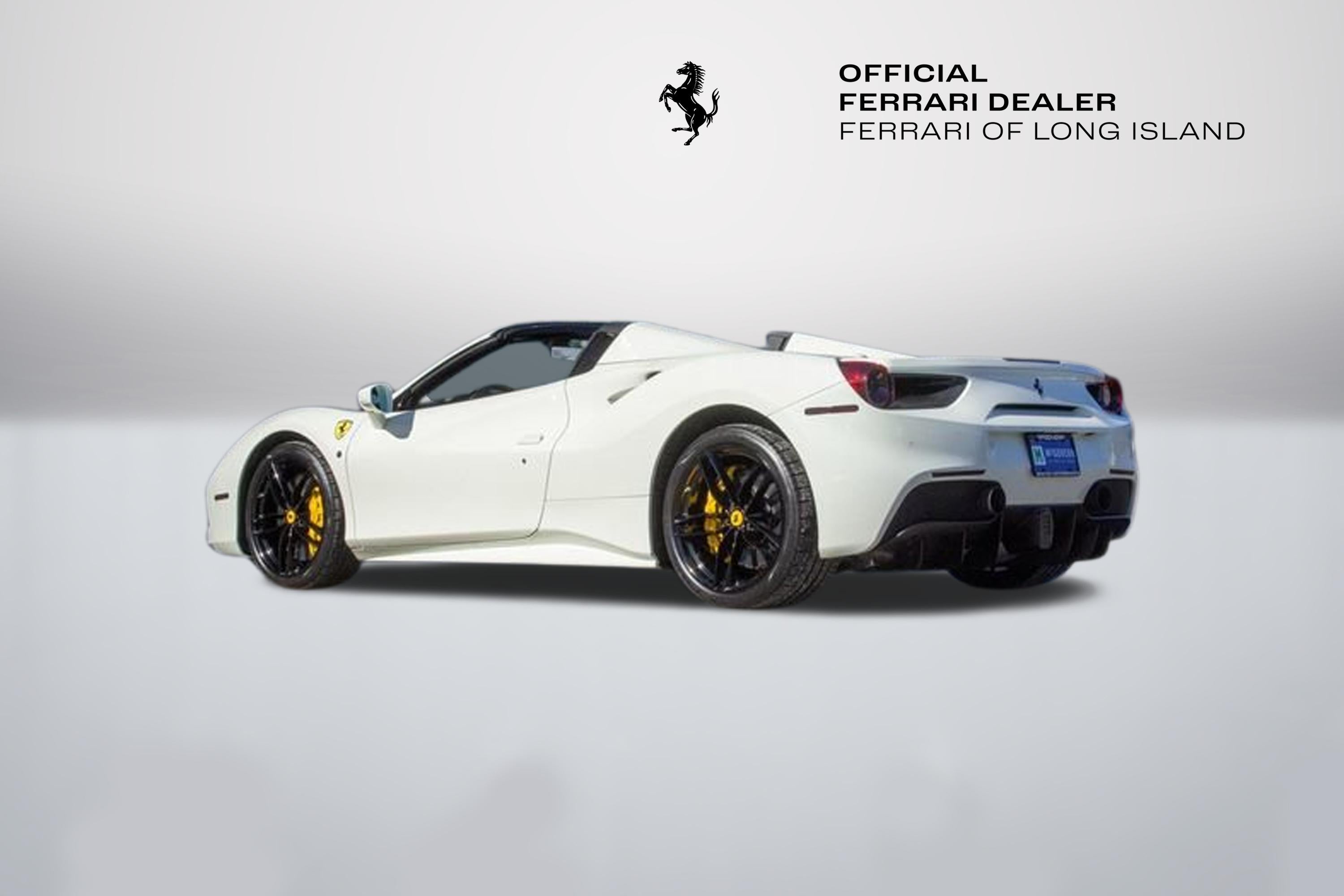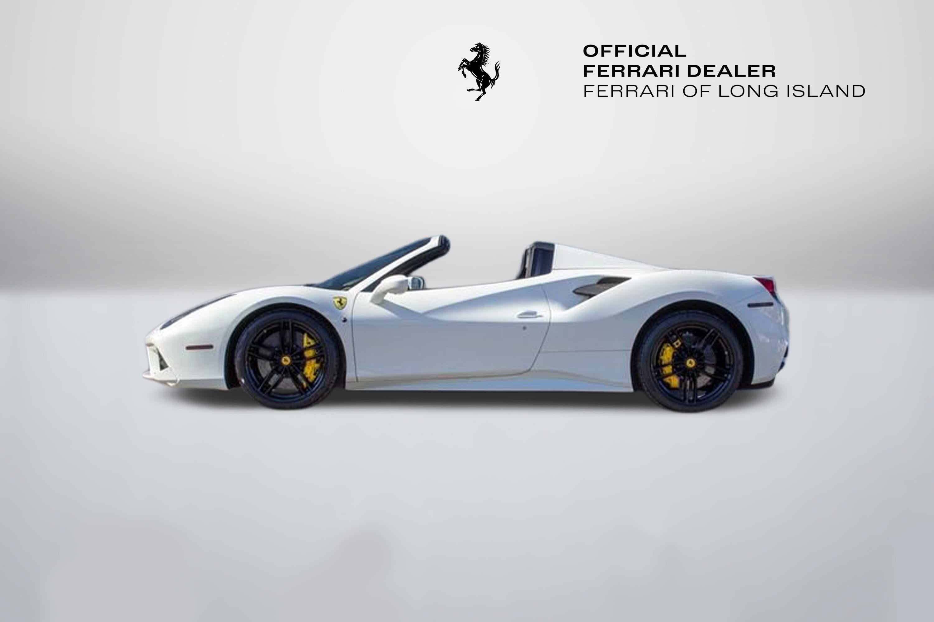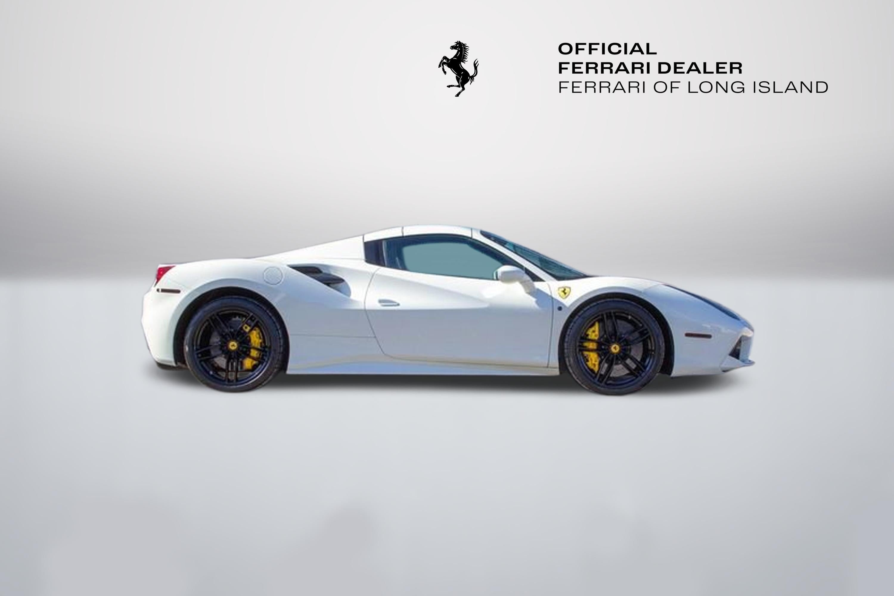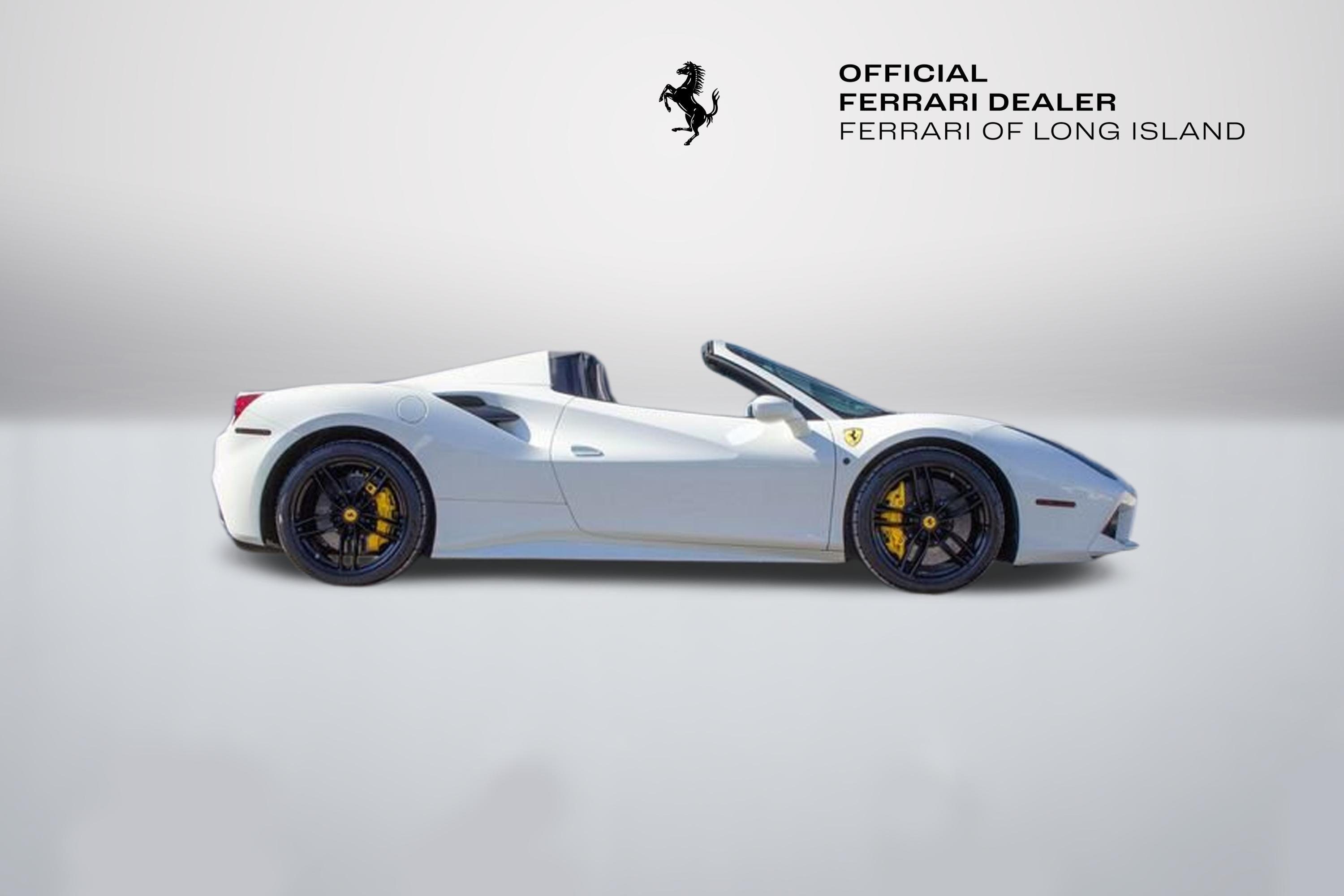 Ferrari of Long Island is proud to present this stunning Ferrari 488 Spider, finished in Bianco Avus over a Nero interior, accented by Bianco contrast stitching. This highly optioned example is equipped with a host of performance-focused features, including Scuderia Ferrari fender shields, gloss black brake calipers, and 20-inch forged wheels in a matte Grigio Corsa finish. Carbon fibre racing seats in the Goldrake style and a carbon fibre racing package further enhance its driver-focused character, while sport tailpipe tips complete the cars aggressive and unmistakable presence. Inside, the cabin blends performance with refined technology, featuring a white tachometer dial face and a rear parking camera for added convenience and everyday usability. This vehicle has passed a comprehensive multi-point inspection performed by our factory-trained technicians and is enrolled in the Ferrari Approved Certified Pre-Owned Program. This program offers up to two additional years of Ferrari Power Approved Warranty coverage. Please contact Ferrari of Long Island today for additional information or to schedule your private viewing.
