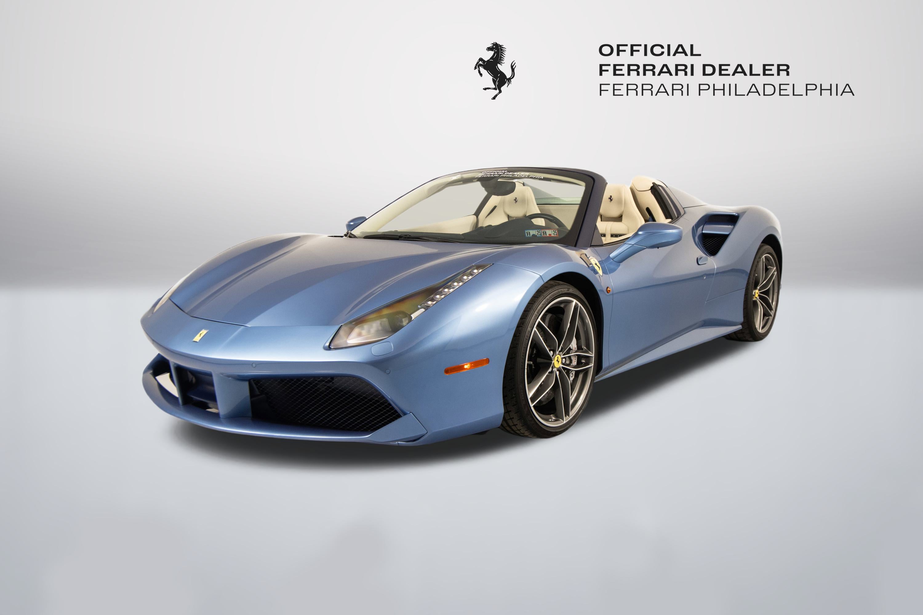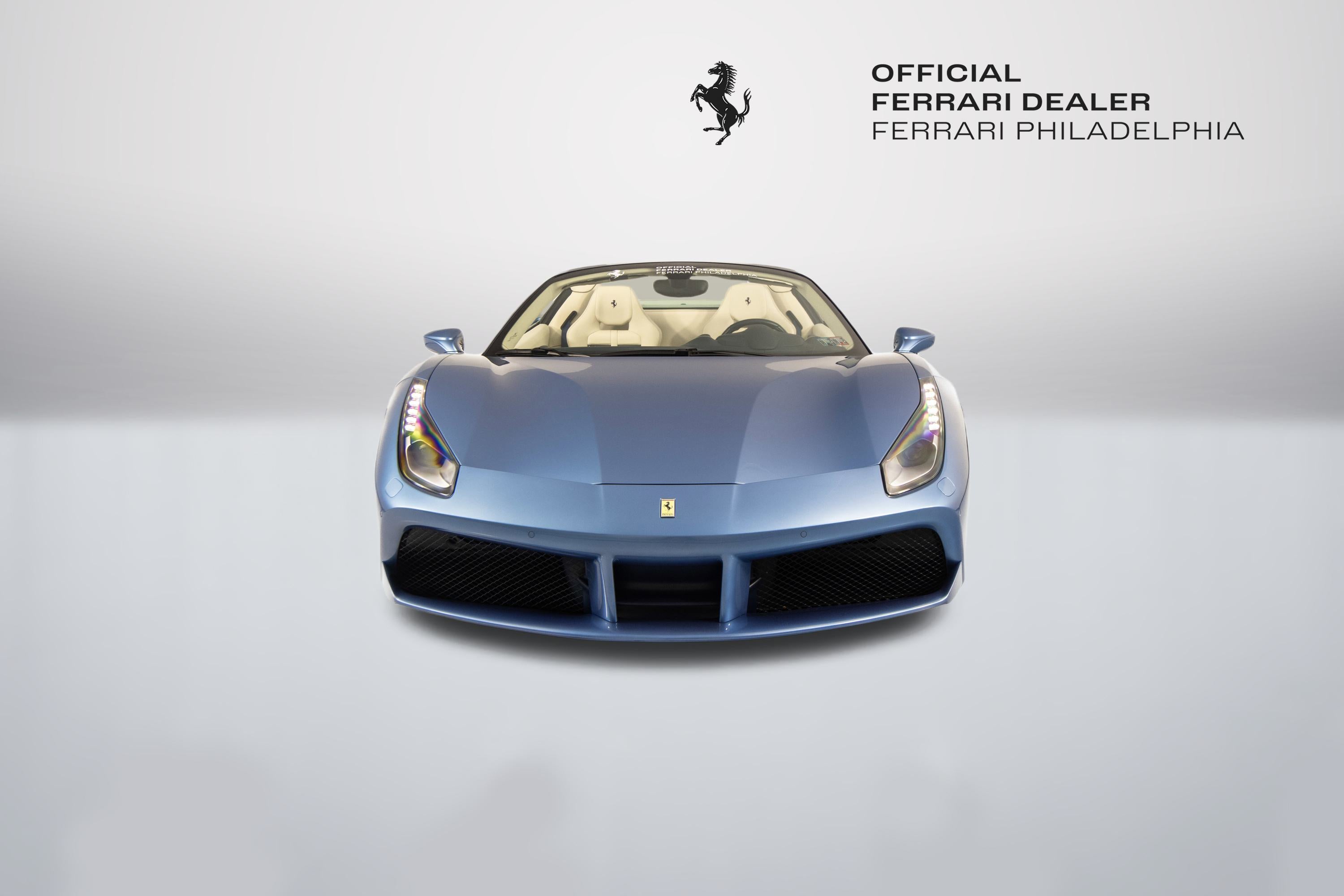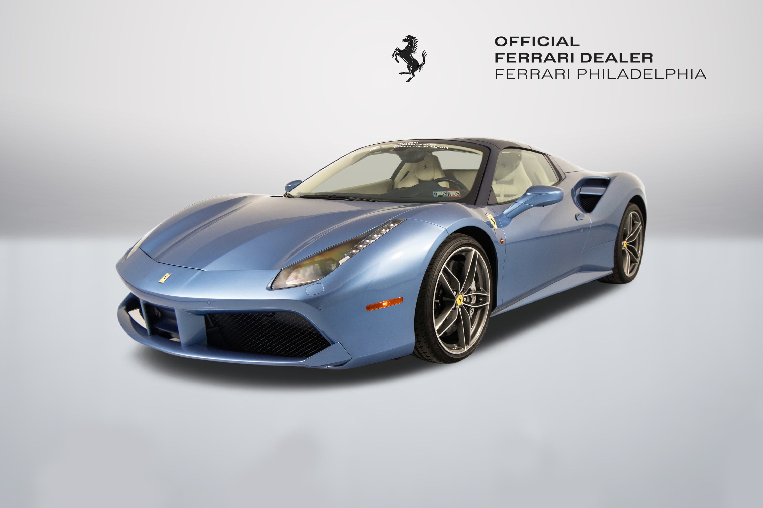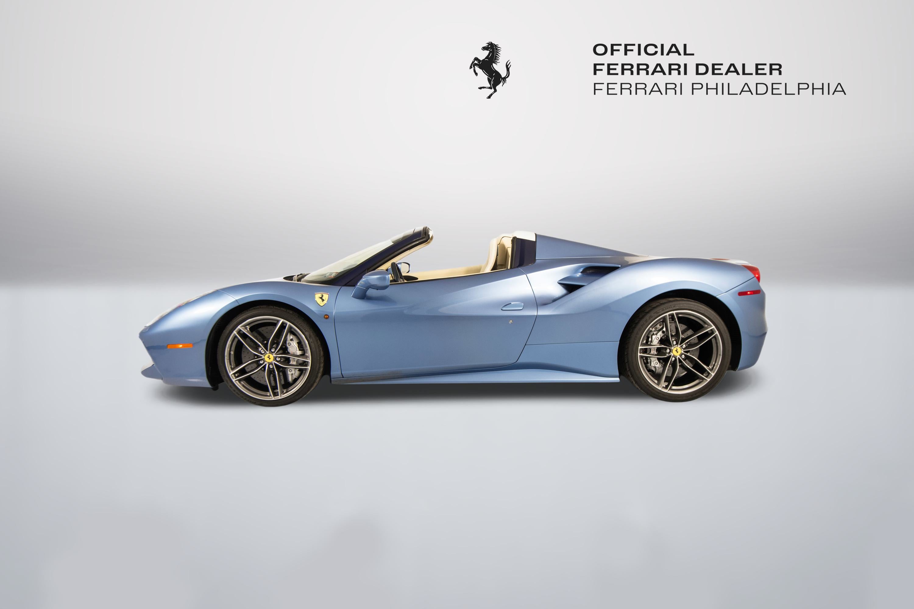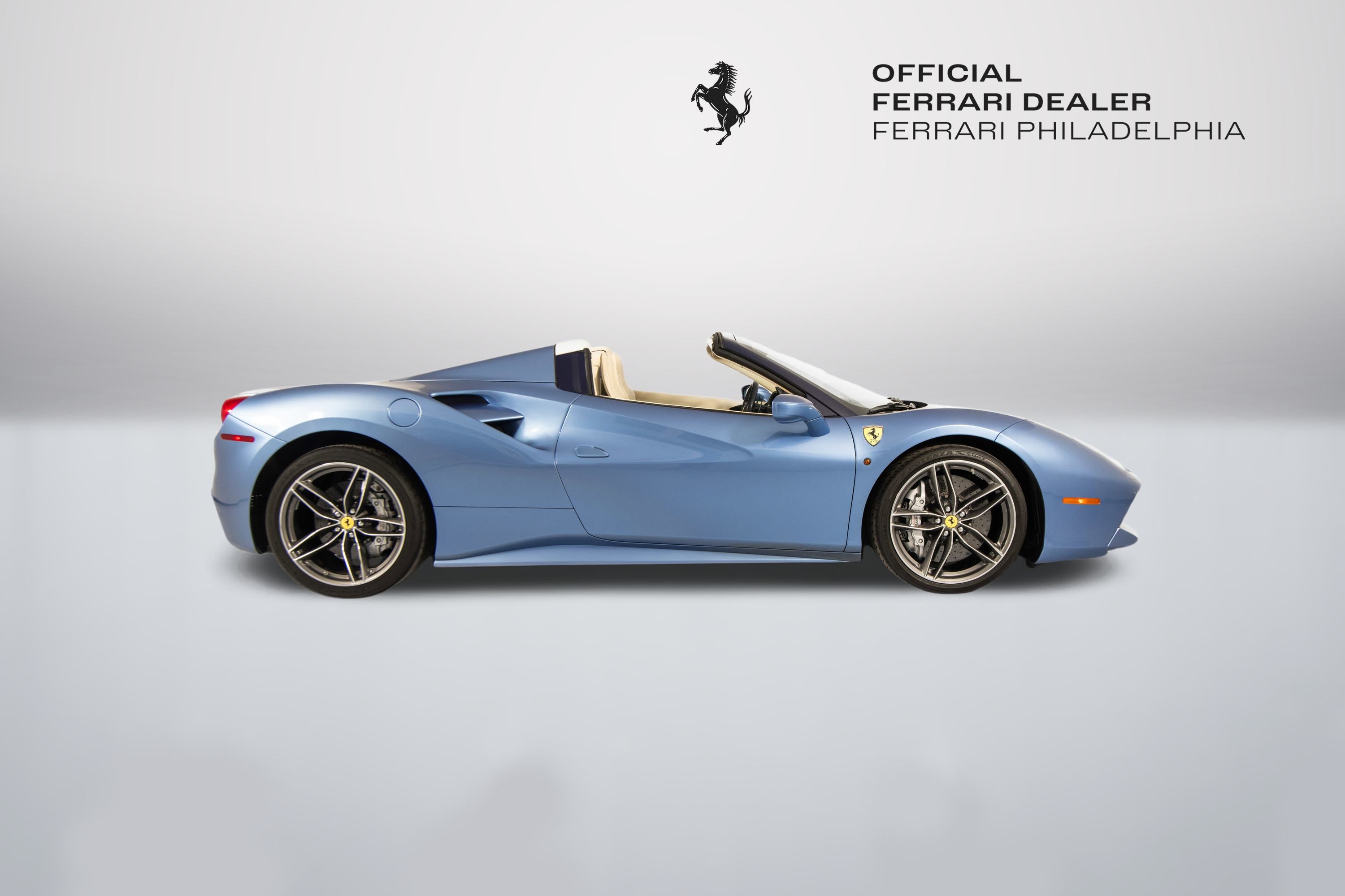 Ferrari Philadelphia is pleased to offer this 2017 Ferrari 488 Spider with only 16,479 miles. This vehicle is being sold under the Ferrari Certified Pre-Owned. The 488 Spider, among Ferrari's finest open-top sports cars, boasts performance of the first order 0-60mph in under 3 seconds, a sculptural design with superb aerodynamics, and an F1-inspired interior for a seamless relationship between car and driver. It's a car that enhances the pleasure of driving on any route. The exterior color of this Ferrari is hand-finished in Azzurro California complemented by a Crema leather interior. The options on this 488 Spider include: