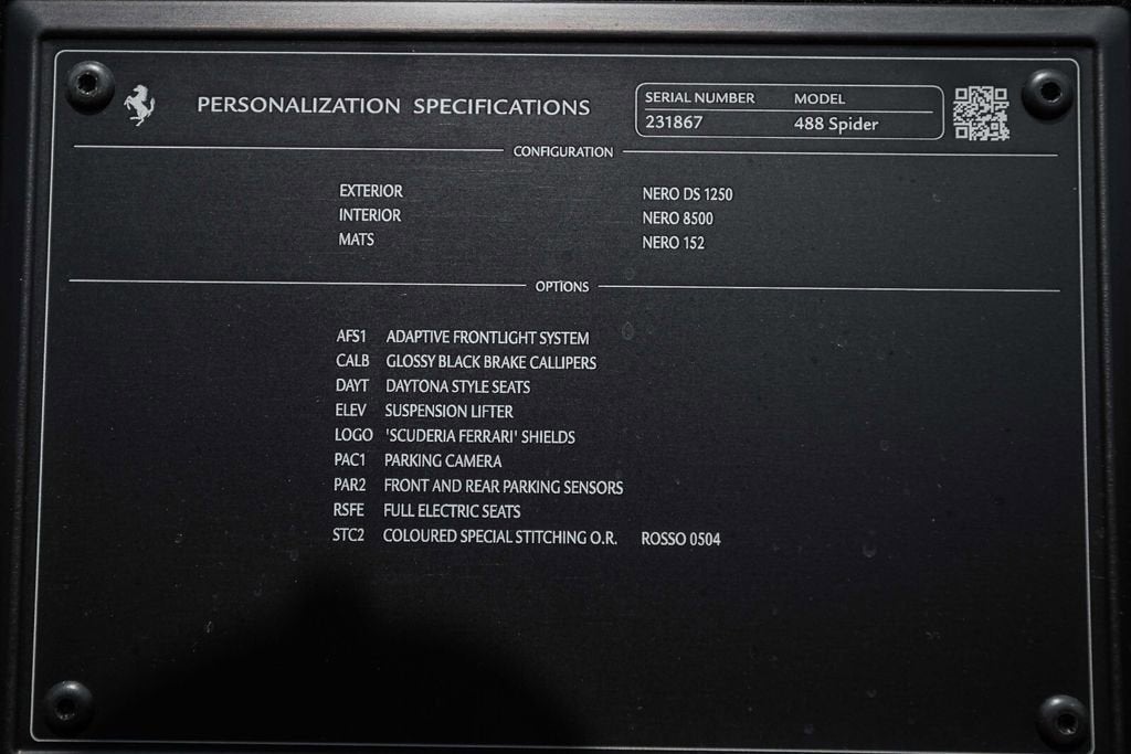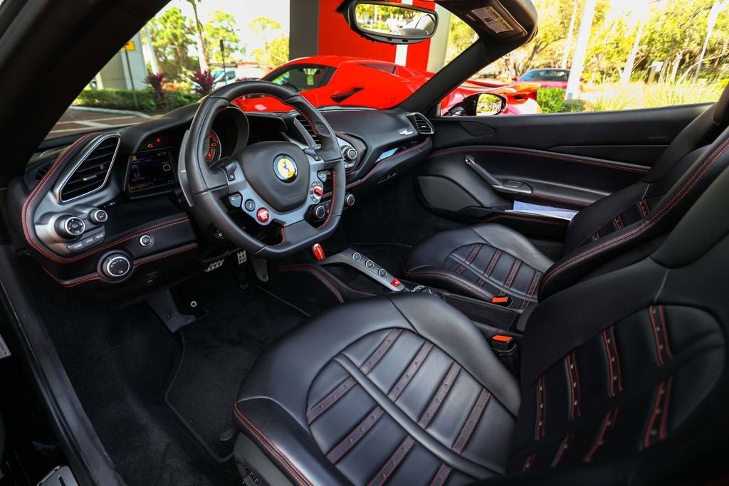 Ferrari of Naples is proud to present this 2018 Ferrari 488 Spider, finished in the elegant and timeless combination of Nero over Nero leather, showing just 3,153 miles from new and one owner since new. This beautifully maintained example offers a perfect blend of Ferraris cutting-edge turbocharged performance with the exhilaration of open-top driving. The 488 Spider represents a major milestone in Ferraris mid-engine V8 lineage, combining advanced aerodynamics, extraordinary performance, and daily usability. Powered by a 3.9-liter twin-turbocharged V8 producing 661 horsepower, the 488 Spider accelerates from 0-60 mph in approximately 3.0 seconds, delivering blistering performance accompanied by Ferraris signature driving dynamics. This example features a sleek all-black specification, highlighted by Daytona seats with red contrast stitching, gloss black brake calipers, and Scuderia Ferrari shields. With its extremely low mileage and single-owner history, this 488 Spider presents as an exceptional example of one of Ferraris most celebrated modern V8 convertibles. Exterior Nero Exterior Finish Gloss Black Brake Calipers Scuderia Ferrari Fender Shields Power Retractable Hardtop Interior Nero Leather Interior Daytona Style Seats Red Contrast Stitching Full Electric Seats Black Carpets Equipment & Features Adaptive Front Lighting System (AFS) Front Suspension Lift Rear Parking Camera Front Parking Sensors USA Functional Equipment Package As the official Ferrari dealer of Southwest Florida, Ferrari of Naples offers an exclusive selection of Ferrari models, backed by unparalleled service and expertise. Our commitment to excellence ensures that each vehicle meets the highest standards of quality and performance. To schedule a private viewing or request a personalized video tour of this 2018 Ferrari 488 Spider, please contact us: Phone: (239) 256-1400 Email: smora@newcountry.