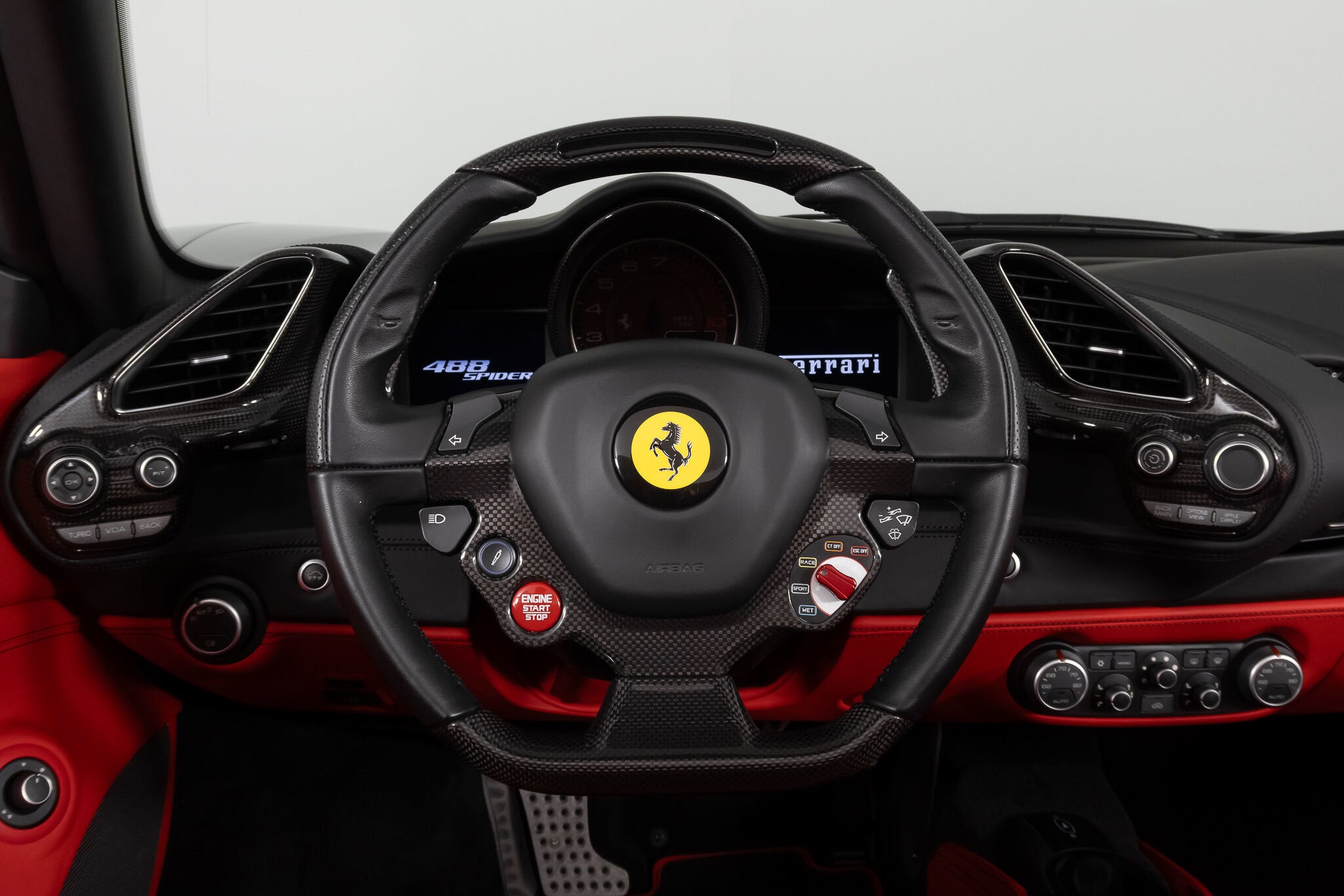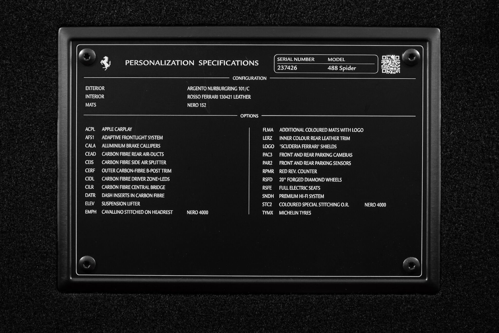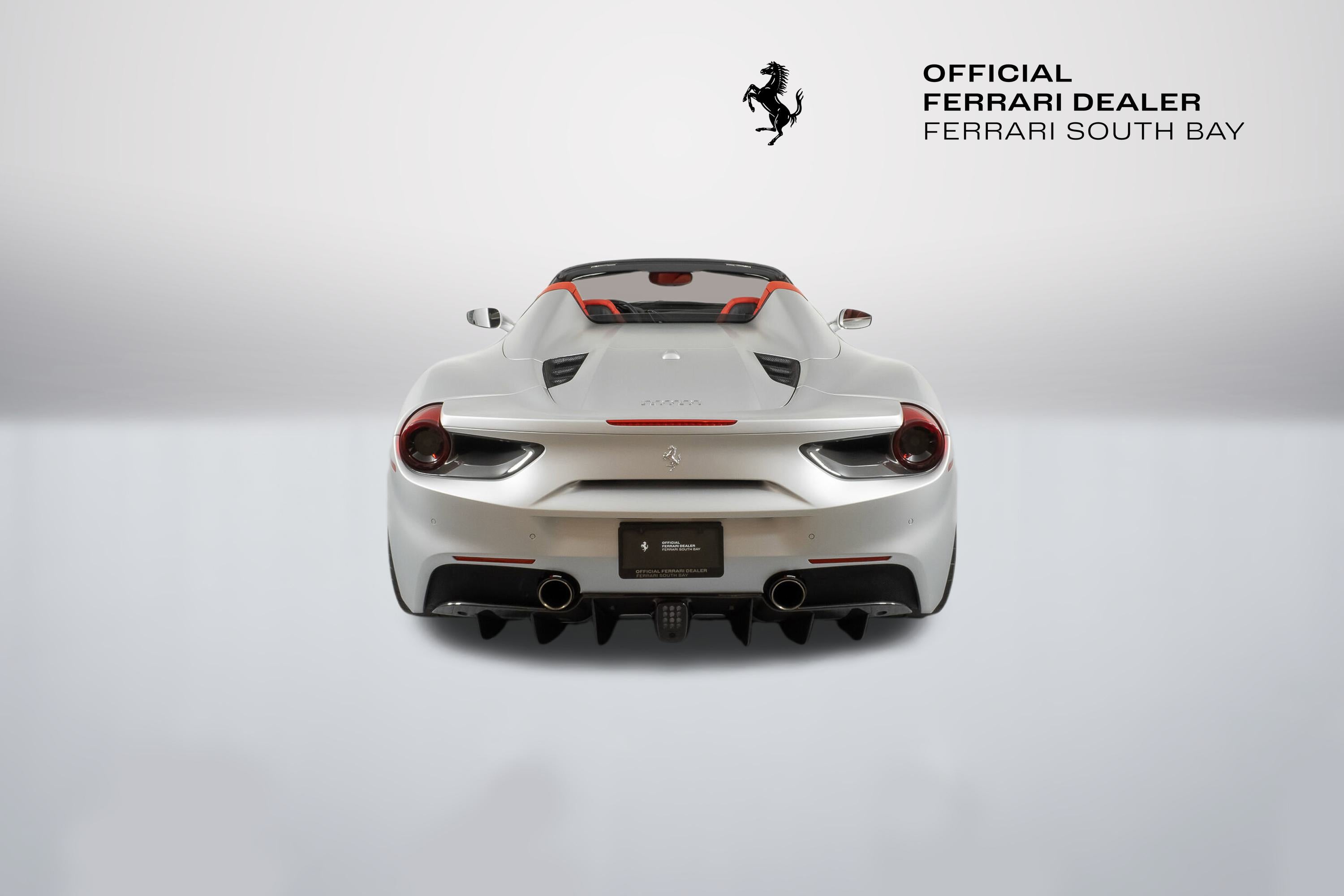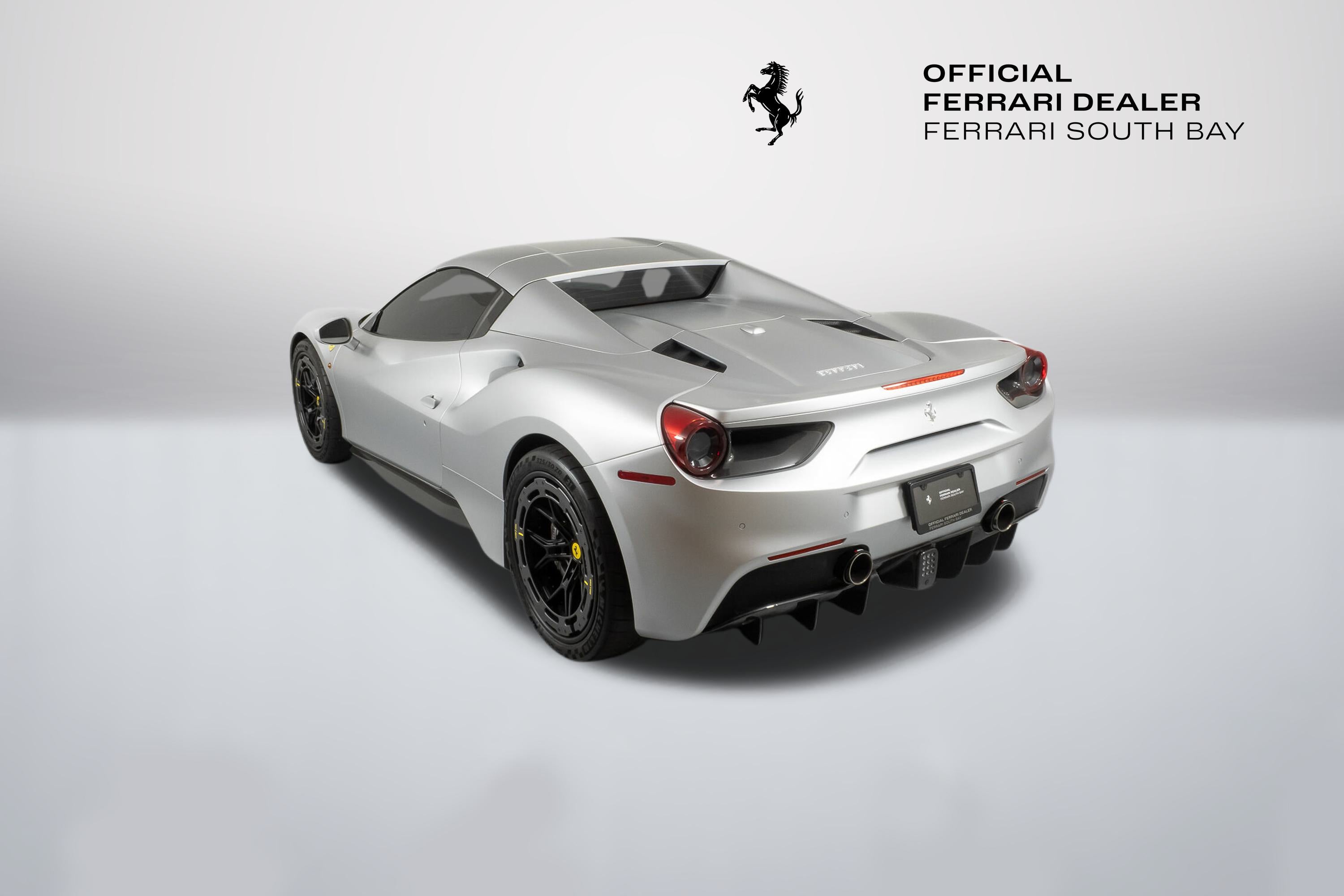 Ferrari South Bay is thrilled to offer this spectacular 488 Spider, finished in Brilliant Argento Nurburgring (protected by an impeccable satin PPF) with Rosso Ferrari Leather. The previous owner fit many pieces of Genuine Ferrari Carbon Fiber, as well as custom wheels and a custom exhaust to create a truly SMKY 488 488 Spider! The exterior is finished in Argento Nurburgring, and has been covered with full body satin PPF to create a very technical, very sophisticated look. The car was fitted with Factory Carbon Fiber on the Rear Air Ducts, B-Pillar Trim and Side Air Splitter; the previous owner added Genuine Ferrari Carbon Fiber Underdoor Covers, Rear Diffuser, Front Splitter and Taillight Buckets. The wheels are custom cut and feature the car's name: SMKY 488 machined into the face and highlighted in yellow. The car's exhaust system was supplied by Akropovic and adds not only a powerful audio punch, but a visually arresting one as well, given the size of the exhaust pipes out back! The Interior of this 488 Spider is trimmed with Rosso Ferrari Leather, accented with Nero Stitching (including the Cavallinos Embroidered onto the Headrests of the Fully-Electric Seats). Carbon Fiber finishes the Dash Inserts, Central Bridge and Driver's Zone, including the F1 Paddles and Steering Wheel (which is fitted with Ferrari's LED Shift Lights). The Vehicle Lifter, Front and Rear Parking Cameras and Sensors simplify tight maneuvers. Apple Car play is a welcome convenience and pairs nicely with the JBL Premium Audio System. This 488 Spider is offered complete with both keys, tools, battery tender and cover. Ferrari's Power15 Warranty is in place through March 21, 2027, and Ferrari Genuine Maintenance handles annual servicing until then as well. If you'd like to know more about this sensational 488 Spider, please contact one of our knowledgeable sales staff. Ferrari South Bay is proudly part of Holand Automotive Group, one of North America’s leading luxury automotive retailers. We offer nationwide shipping, trade-in opportunities, financing, client consignments, and world-class delivery service. Contact us today to explore ownership of this remarkable Ferrari. Please visit us at 23305 Hawthorne Blvd, Torrance, CA 90505, or call us at (888) 578-8767.