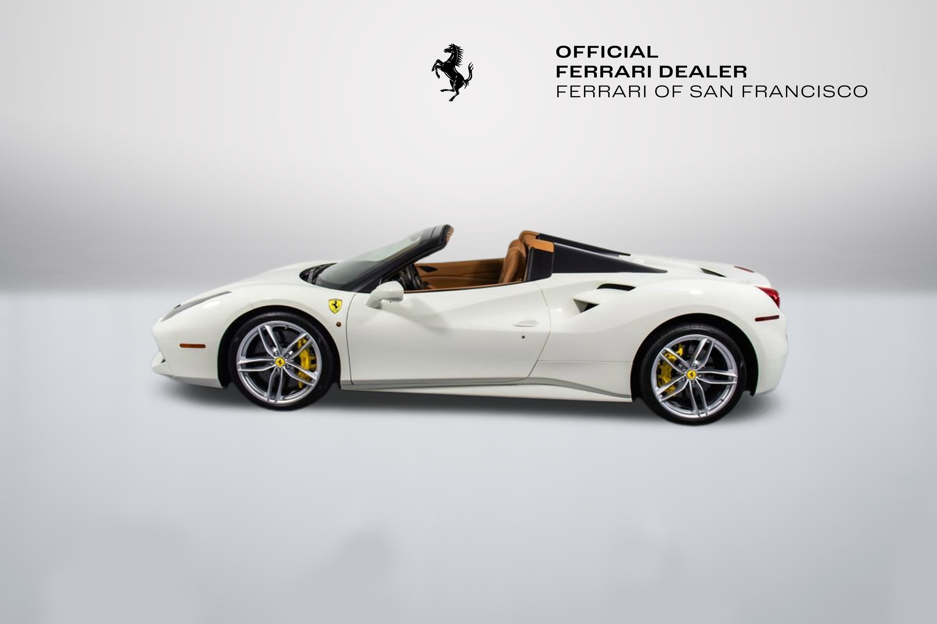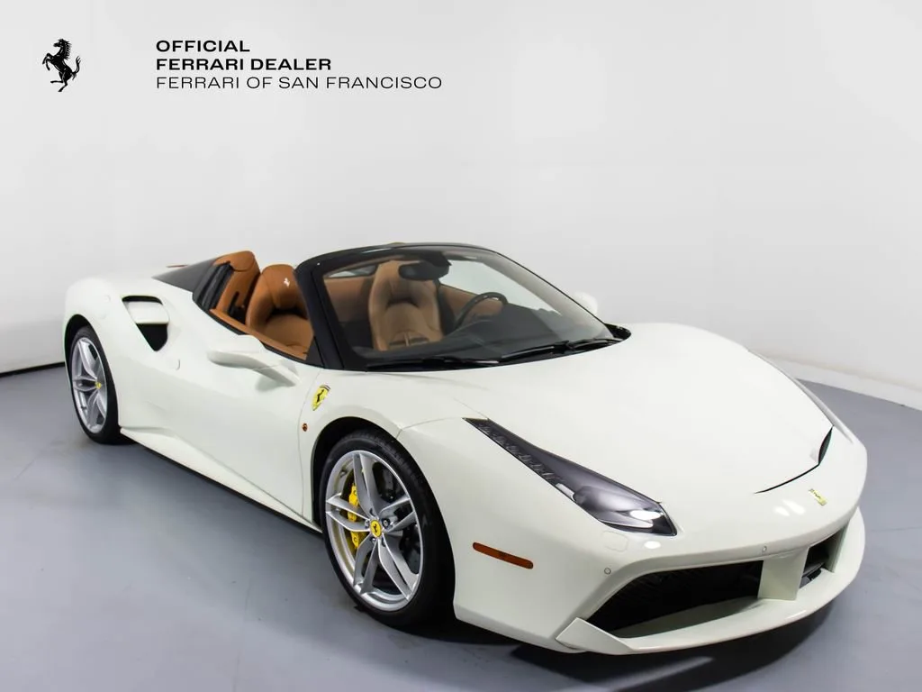 243096 Exterior: Bianco Avus Interior: Cuoio Mats: Nero 2019 Ferrari 488 Spider Options: Adaptive Front Light System Leather Upholst. Seat Backrest Two Tone Body Painting in Nero Yellow Brake Calipers Daytona Style Seats Dual Color Leather Int. Trim in Cuoio Suspension Lifter Cavallino Stitched on Headrest in Bianco Additional Colored Mats with Logo High Emotion Low Emission Carbon. Fib. Steering Wheel + LEDS 'Scuderia Ferrari' Shields Parking Camera Front and Rear Parking Sensors 20" Forged Wheels Yellow Rev. Counter Full Electric Seats Colored Special Stitching O.R. in Bianco Leather Perforated Inserts in Nero Upper Part of Passenger Compartment in Cuoio This 2019 Ferrari 488 Spider is a stunning open-top supercar finished in elegant Bianco Avus with a striking two-tone Nero body accent, perfectly complemented by a rich Cuoio leather interior and Nero mats. The cabin exudes craftsmanship with dual-color Cuoio trim, perforated Nero leather inserts, Daytona-style full electric seats, and Bianco contrast stitching, along with a Bianco-stitched Cavallino on the headrests for a bespoke touch. Performance and presence are amplified by yellow brake calipers, a yellow rev counter, 20-inch forged wheels, and the iconic Scuderia Ferrari shields. The carbon fiber steering wheel with integrated LEDs keeps the driver connected to the cars exhilarating twin-turbo V8 performance, while the suspension lifter, adaptive front lighting system, front and rear parking sensors, and parking camera enhance everyday usability. Blending timeless Ferrari design with thrilling open-air performance, this 488 Spider offers an unforgettable driving experience wrapped in unmistakable Italian style.