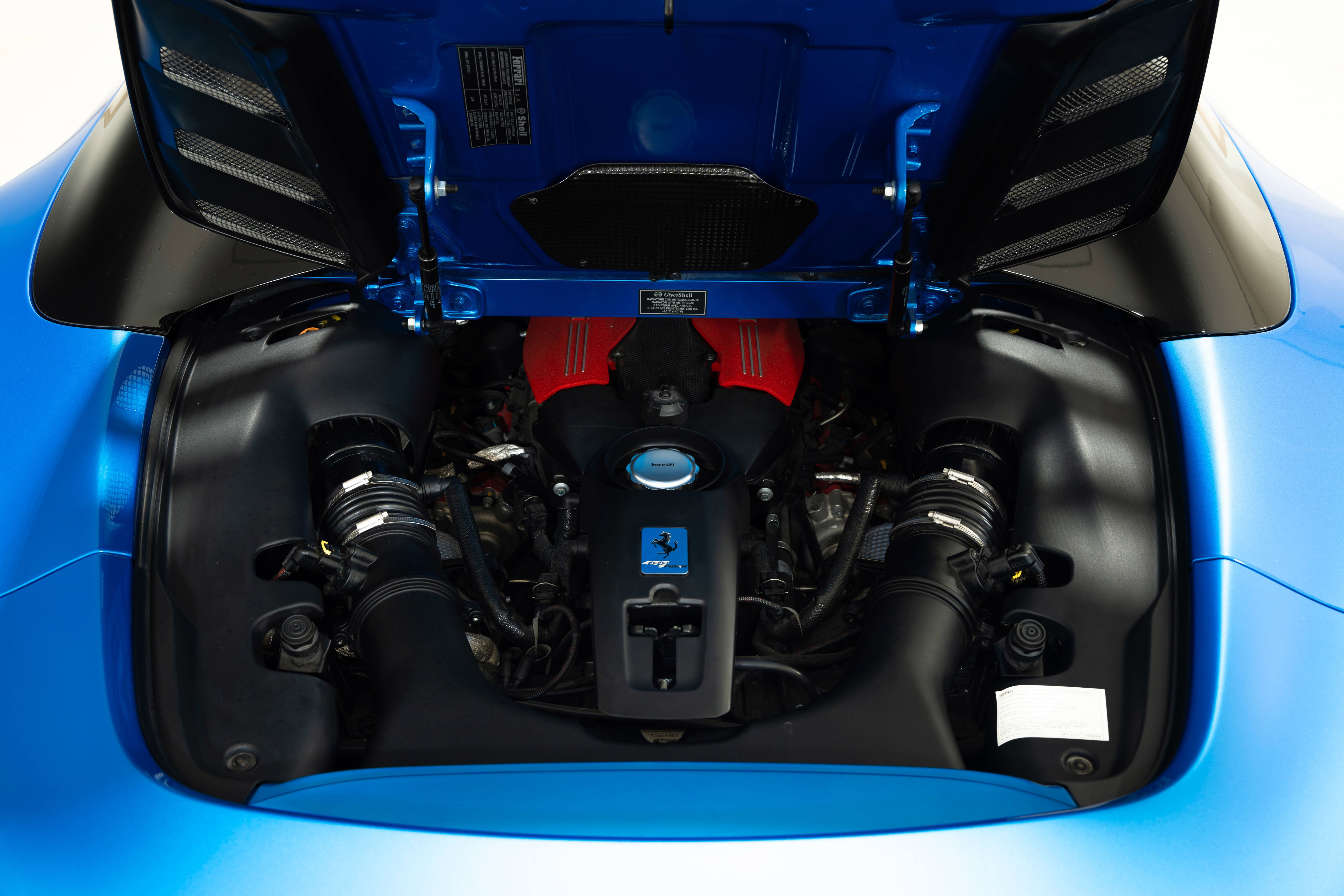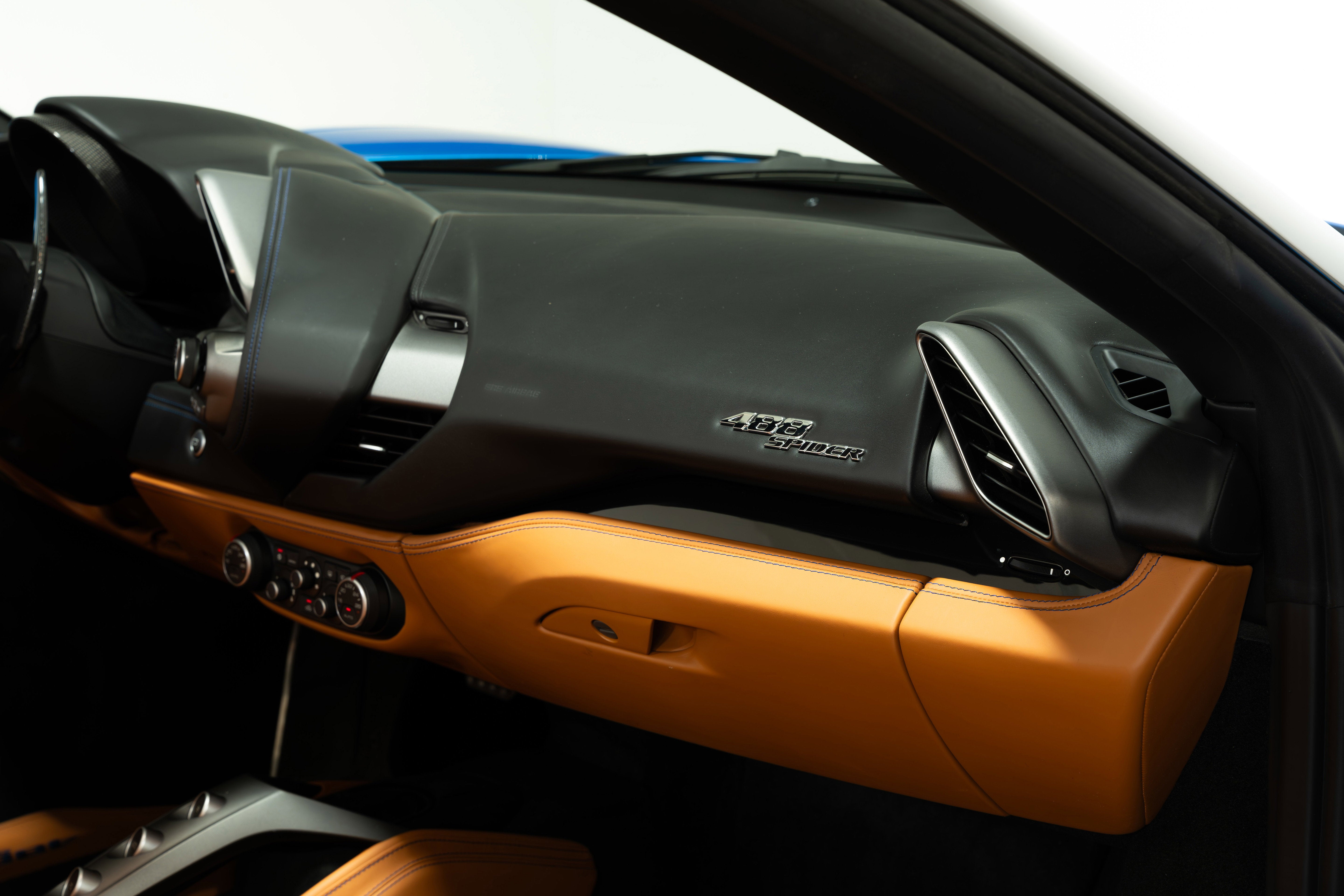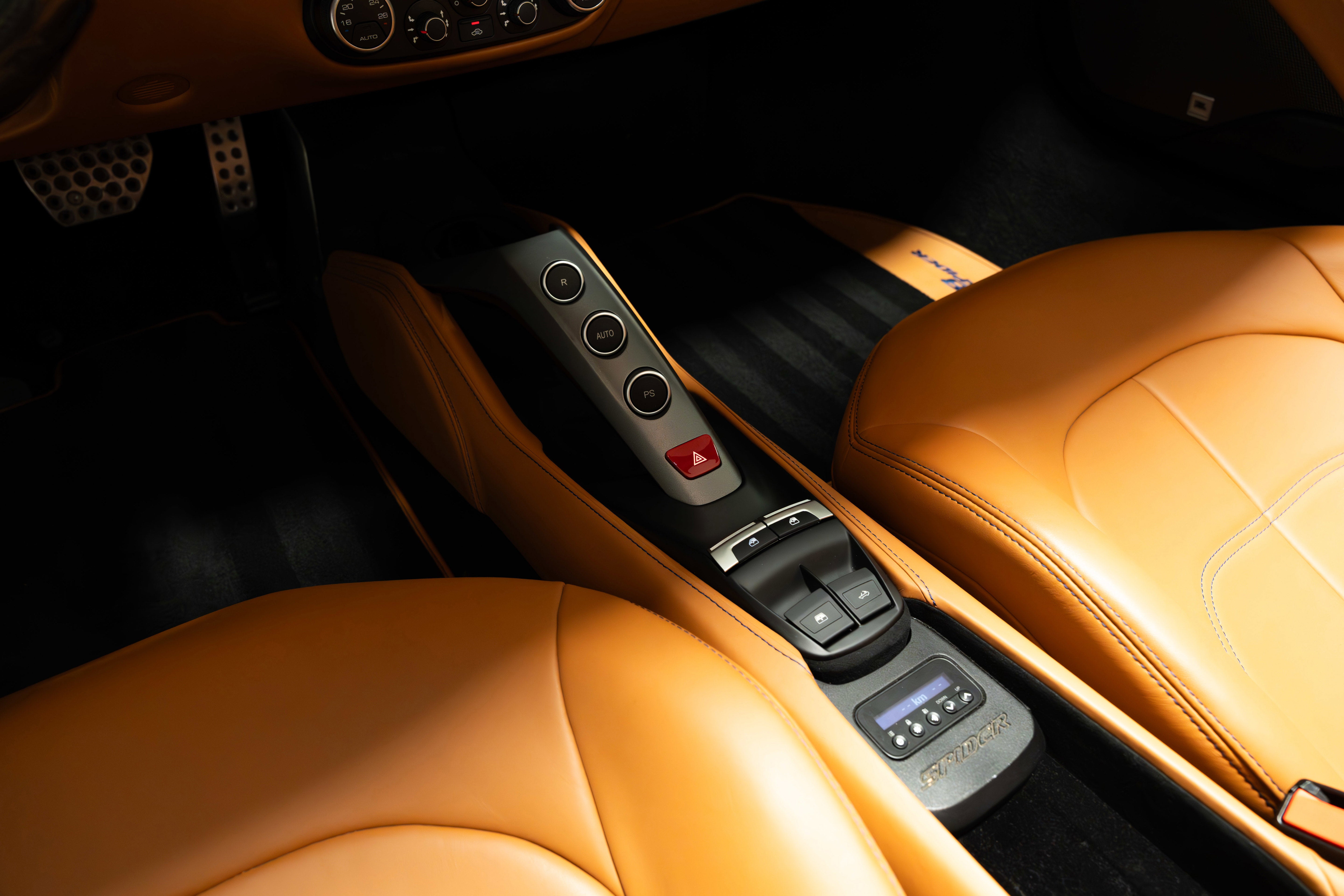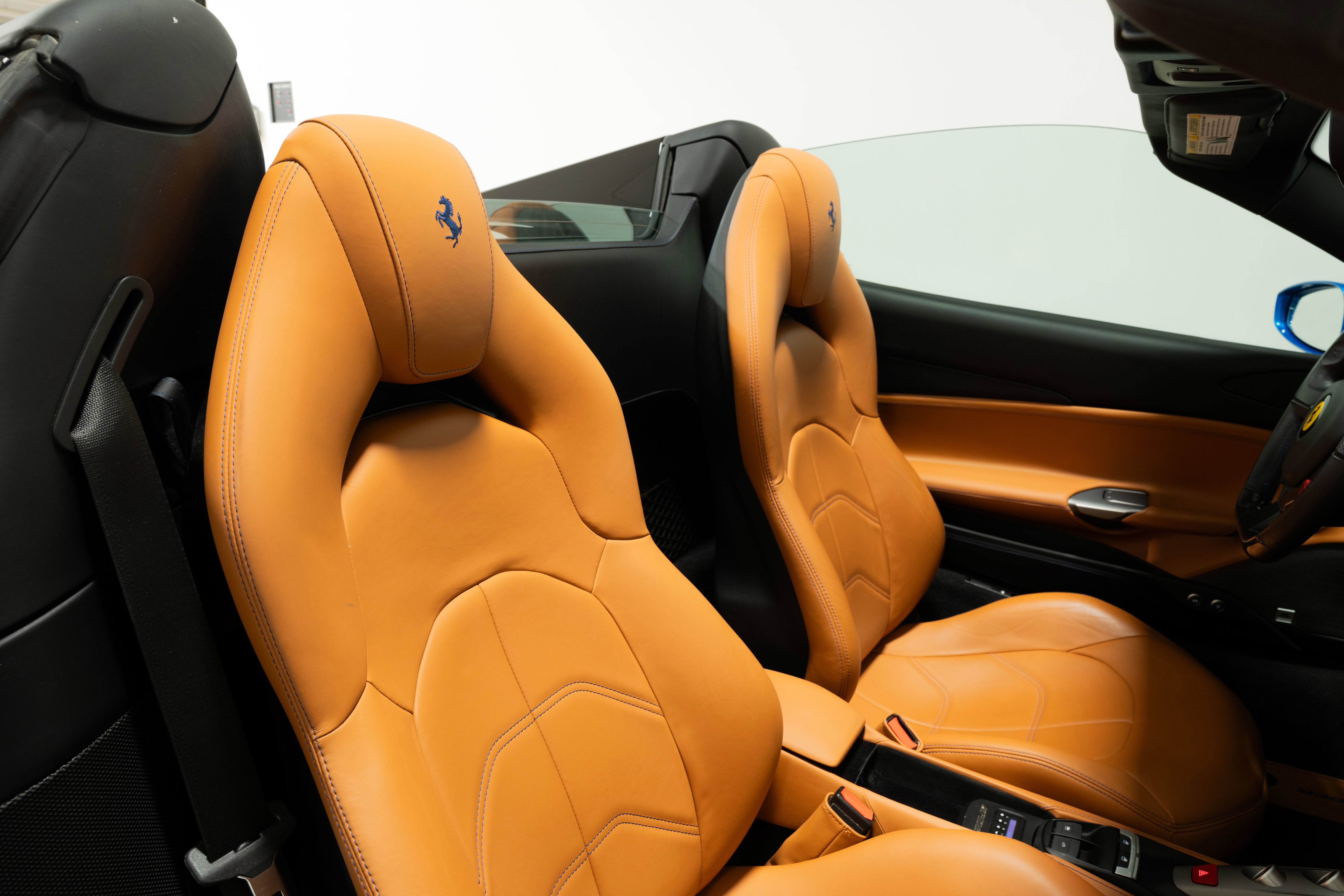 - Finished in stunning Blu Corsa with factory two-tone Nero bodywork, this Spider delivers a rare and commanding presence. The exterior is accented by Giallo Scuderia shields on the fenders, a classic Ferrari detail that adds racing pedigree to its design. Its finish has been carefully preserved with full paint protection film, including brand-new front coverage applied this summer, ensuring long-term protection and a flawless appearance.