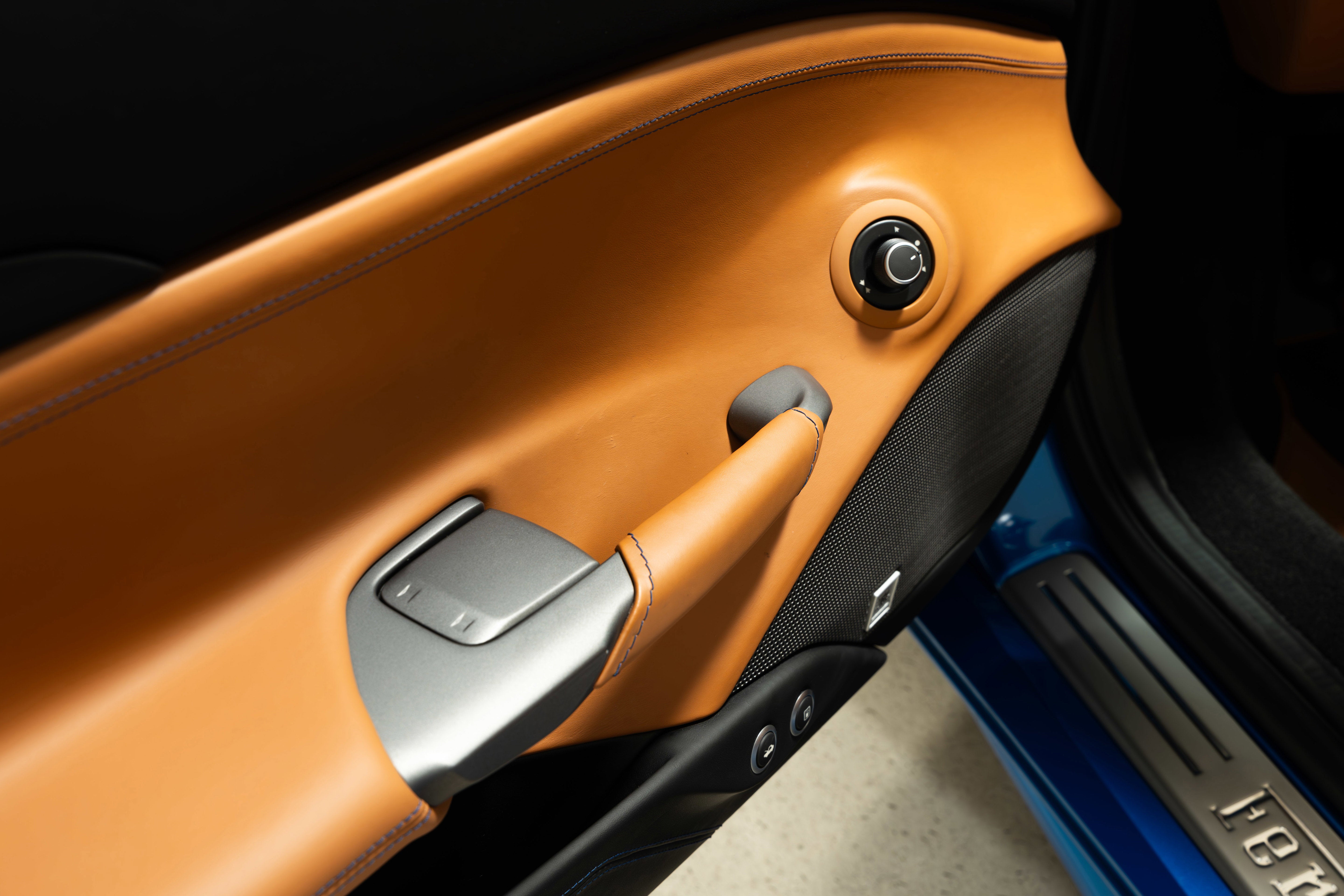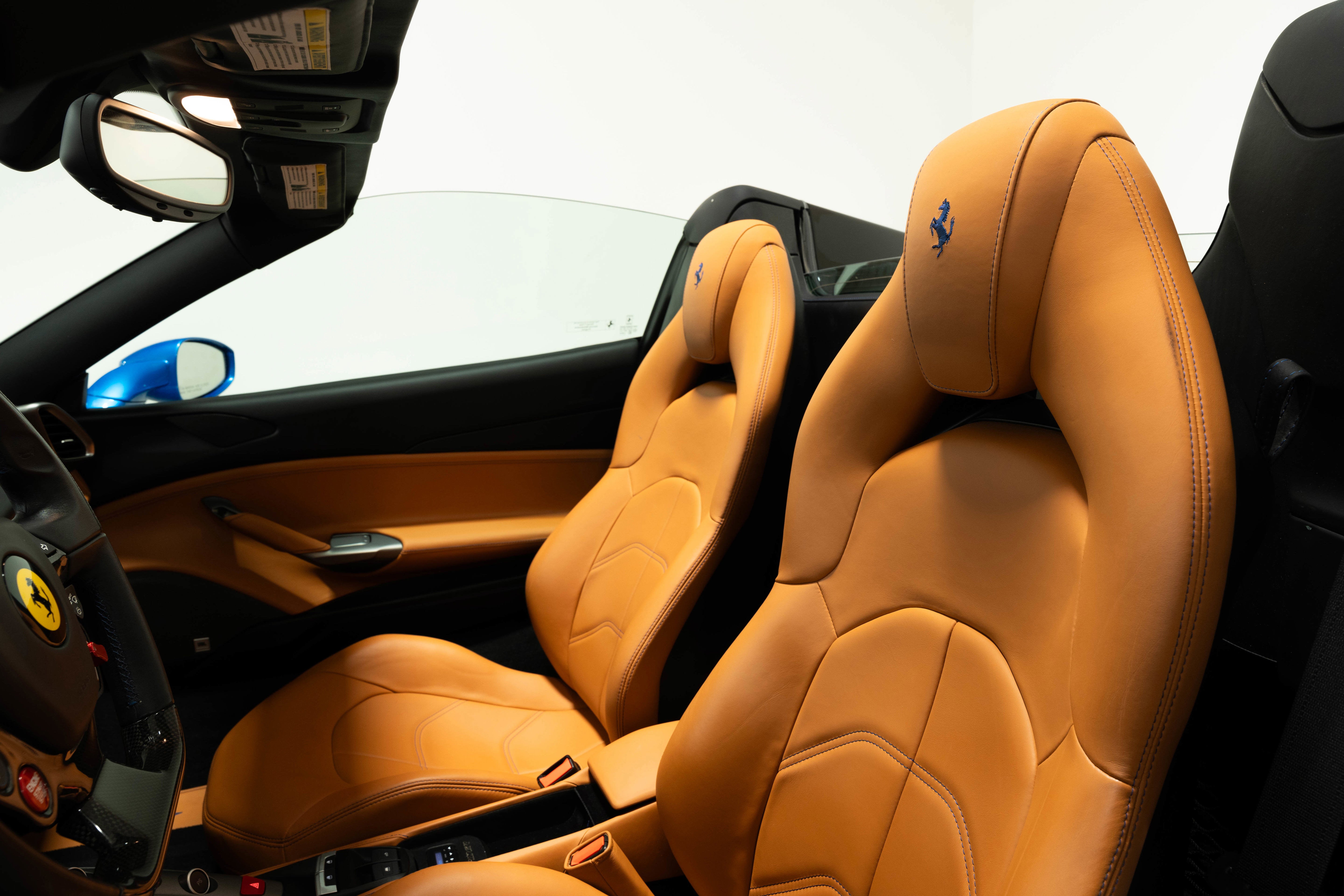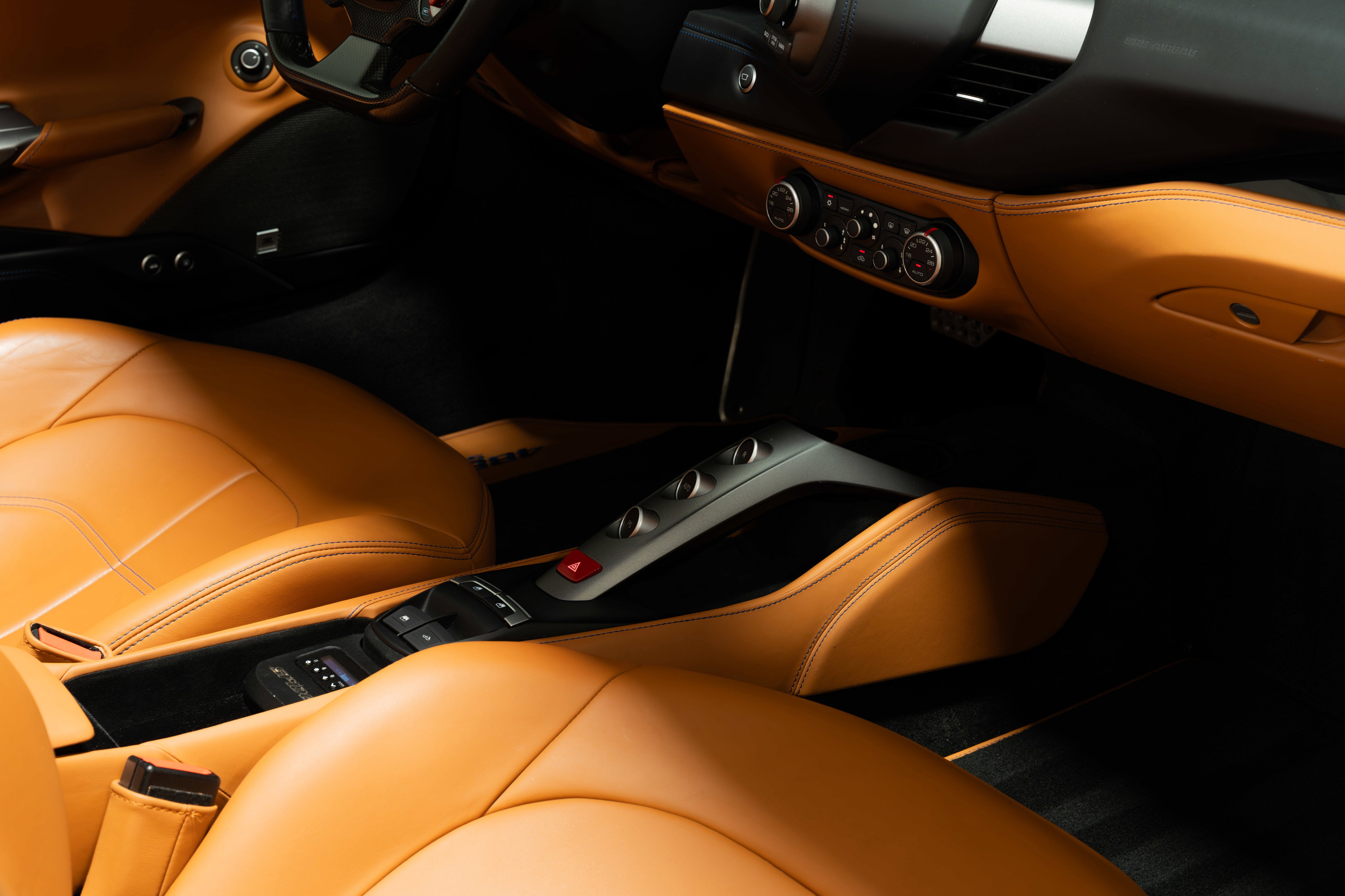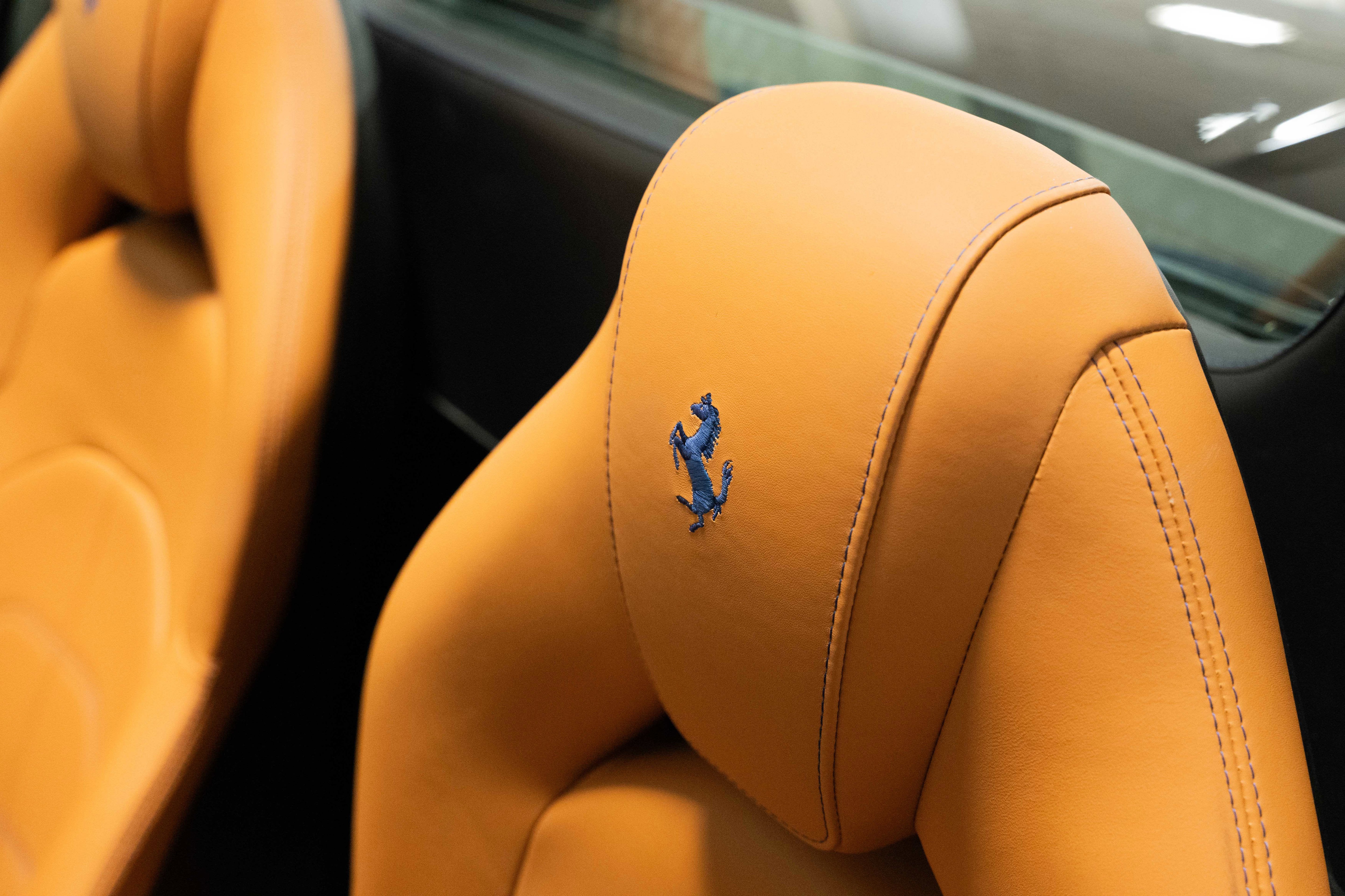 - Inside, the warm Cuoio leather cabin provides a timeless Ferrari atmosphere, with exposed Blu stitching that seamlessly echoes the Blu Corsa exterior. The 16-way adjustable power seats offer tailored comfort, while each headrest is adorned with a hand-stitched Rosso Cavallino emblem---an elegant nod to Ferrari's artisanal craftsmanship. Carbon fibre accents throughout the cockpit, including the steering wheel with integrated LED shift lights and dash inserts, reinforce the car's motorsport character while maintaining a refined balance of performance and luxury.