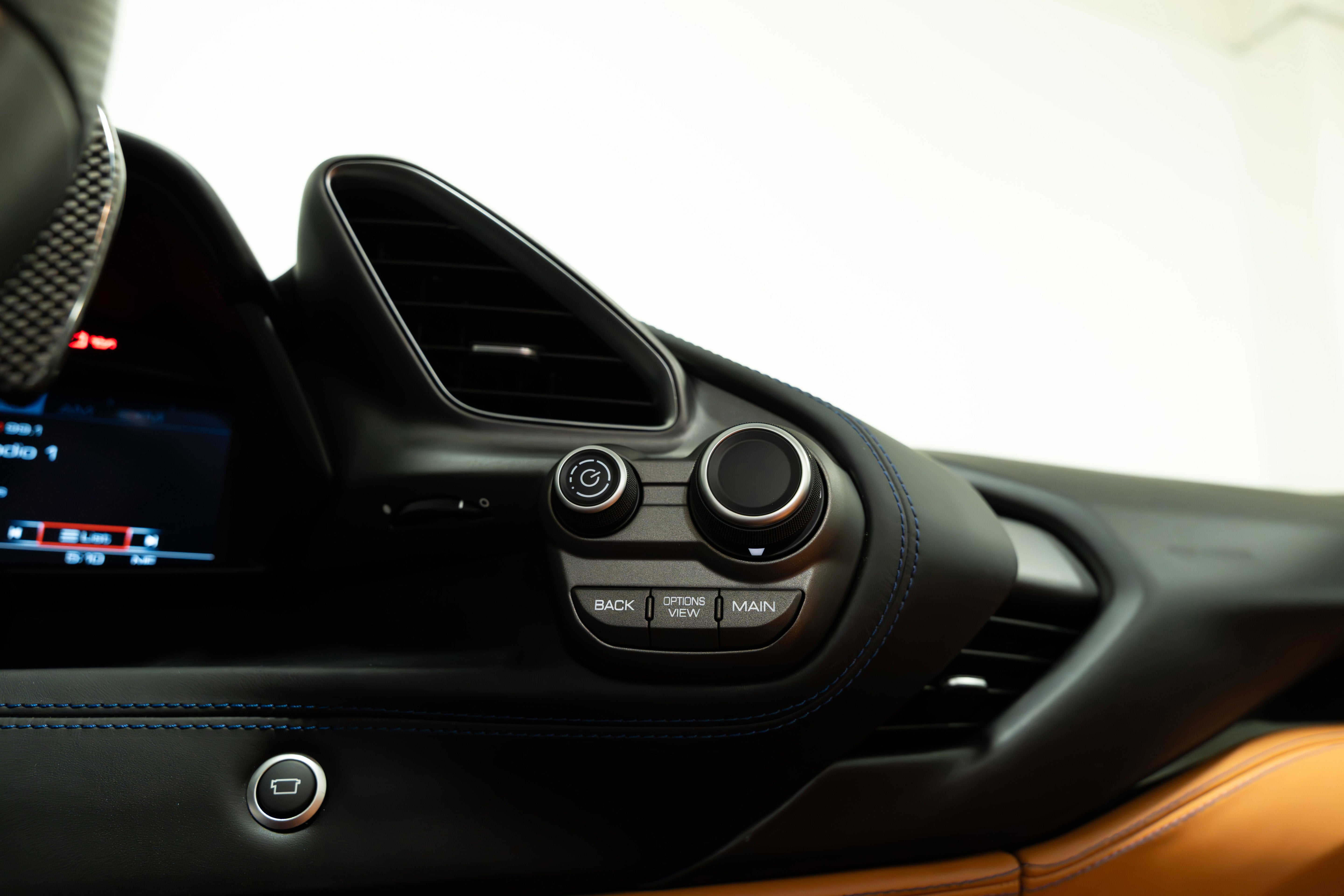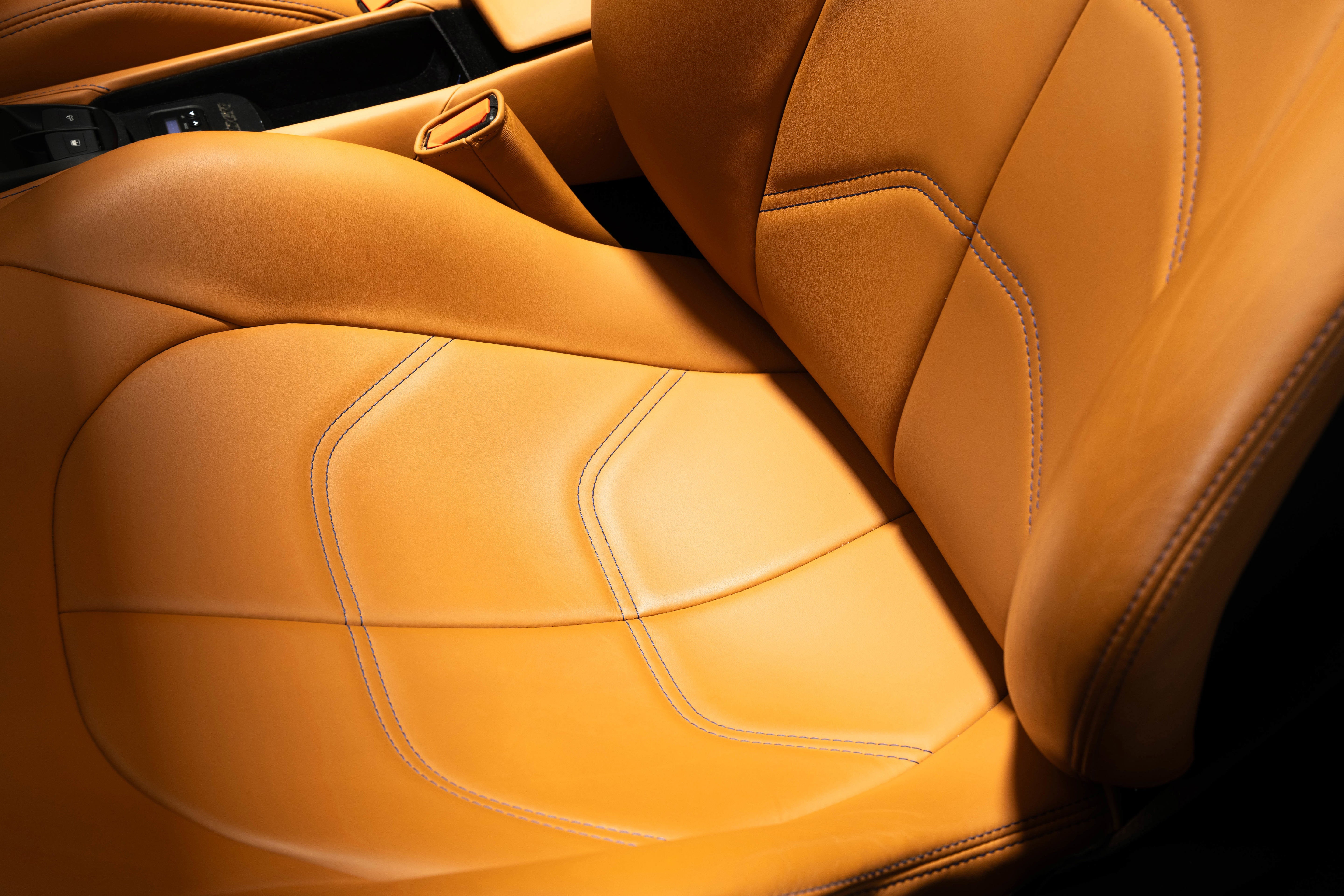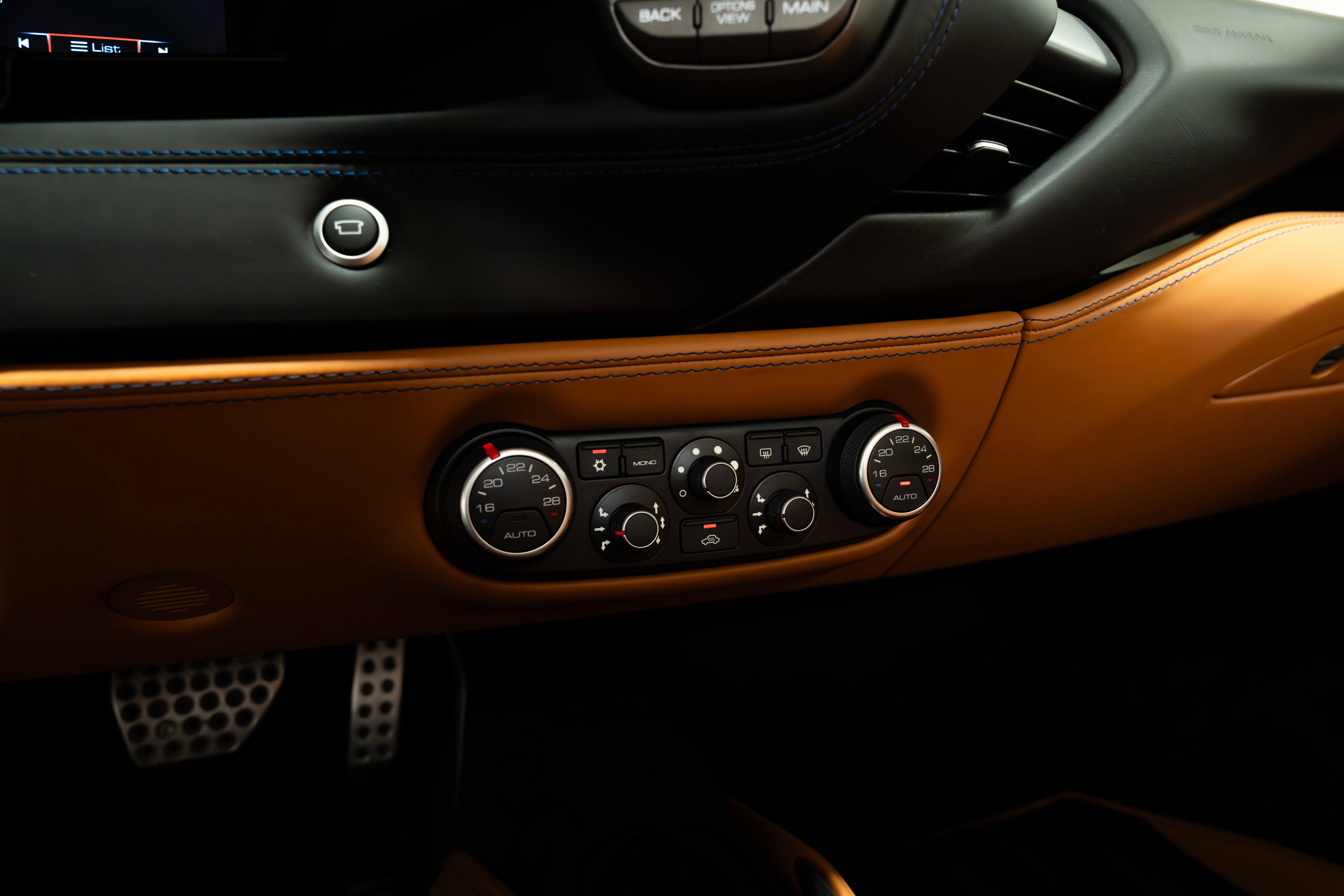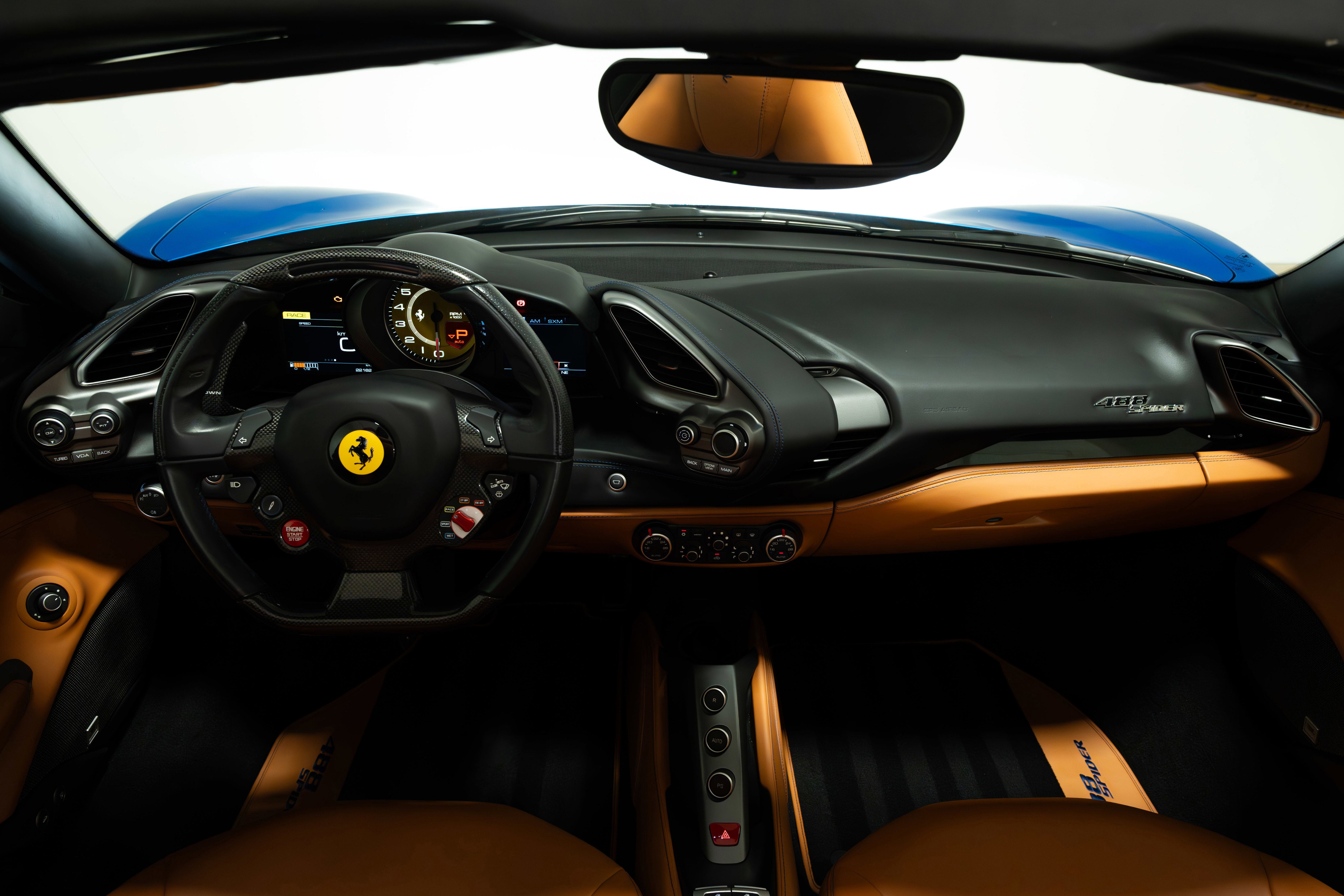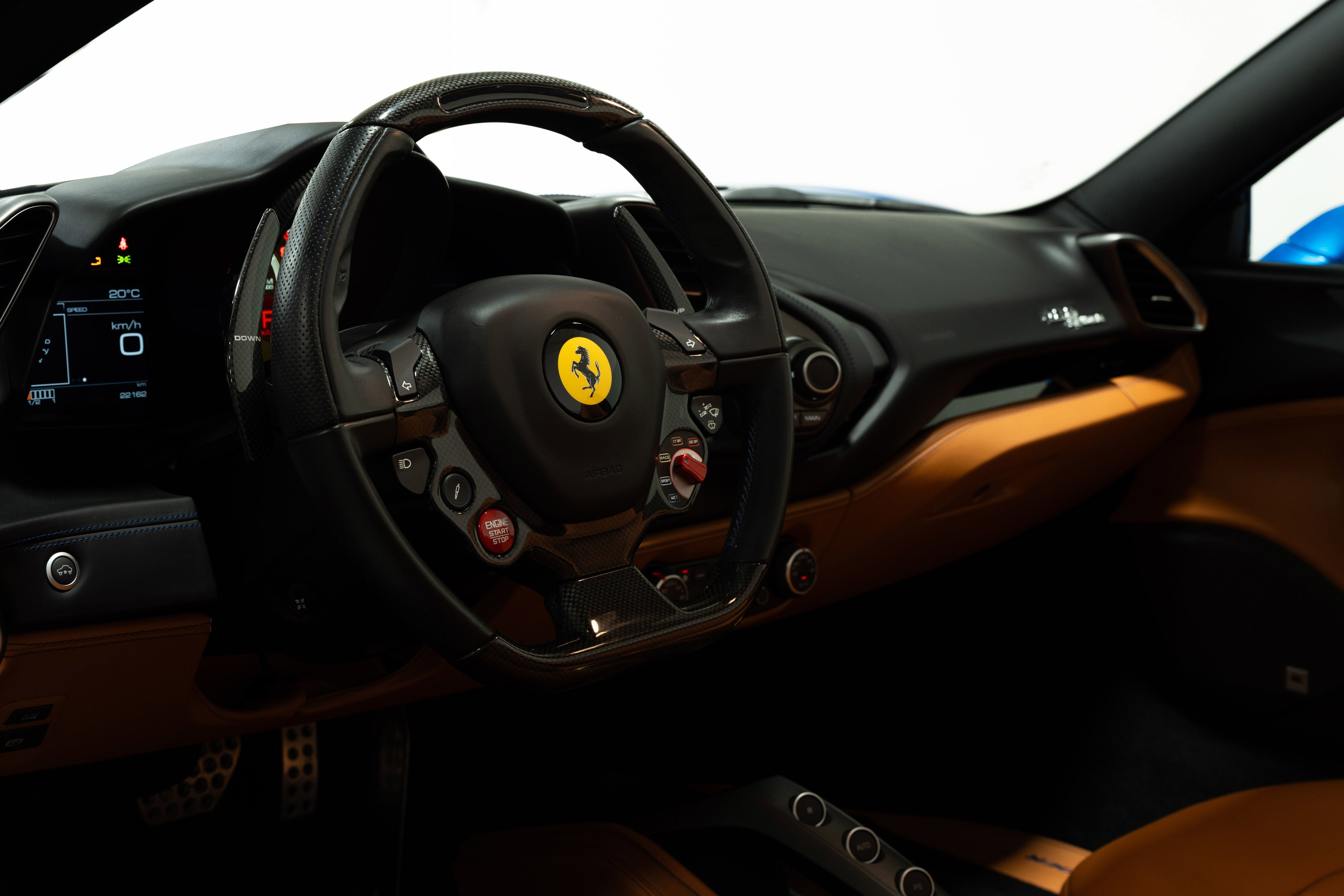 - Inside, the warm Cuoio leather cabin provides a timeless Ferrari atmosphere, with exposed Blu stitching that seamlessly echoes the Blu Corsa exterior. The 16-way adjustable power seats offer tailored comfort, while each headrest is adorned with a hand-stitched Rosso Cavallino emblem---an elegant nod to Ferrari's artisanal craftsmanship. Carbon fibre accents throughout the cockpit, including the steering wheel with integrated LED shift lights and dash inserts, reinforce the car's motorsport character while maintaining a refined balance of performance and luxury.