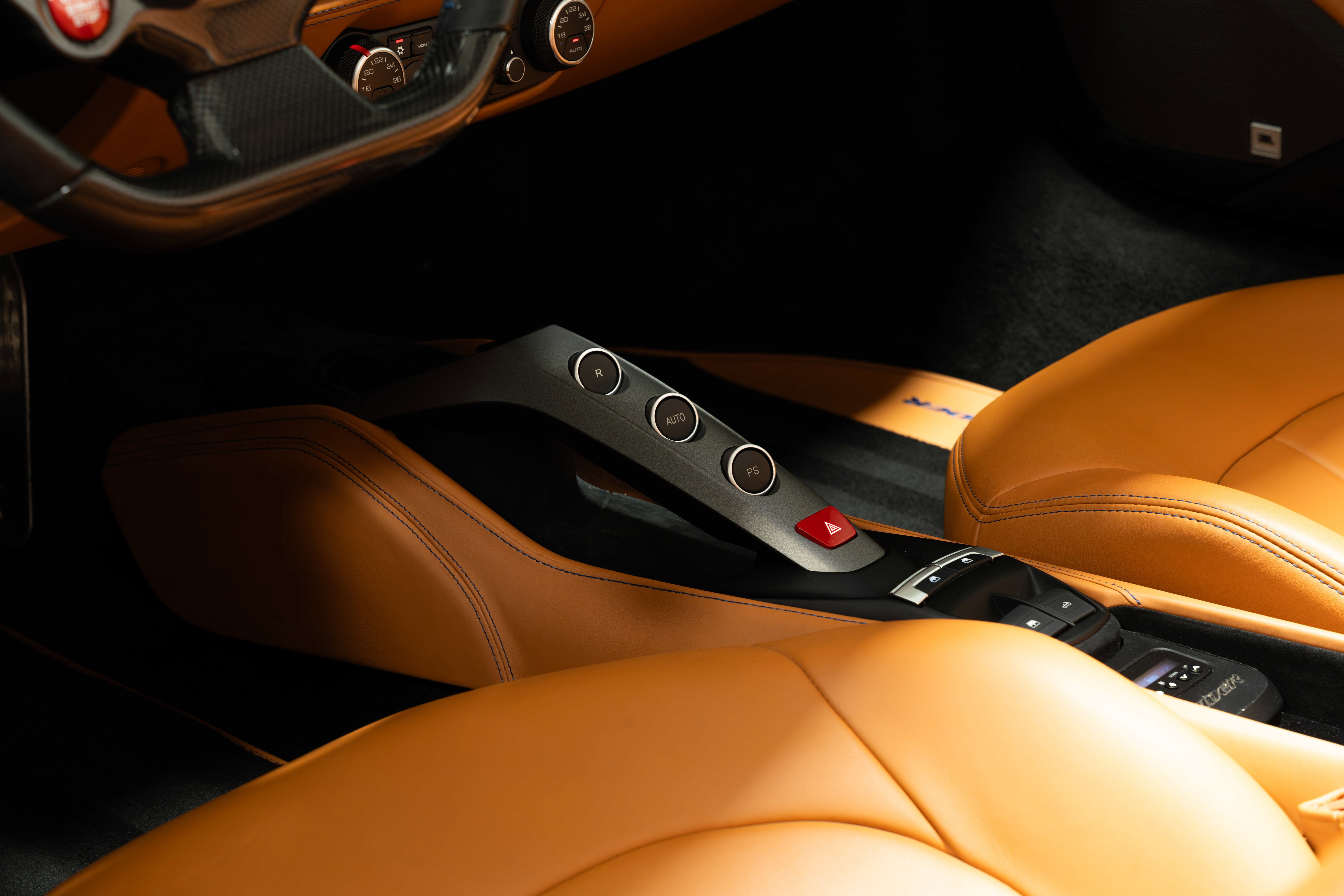 - Interior: Carbon fibre trim driver zone and LED shift indicators on steering wheel, Carpet Color, Embroidered Cavallino emblem on headrest, Overmats with embroidered vehicle logo, yellow tachometer dial face, Full-electric seats, Standard stitching in colour of customer's choice
