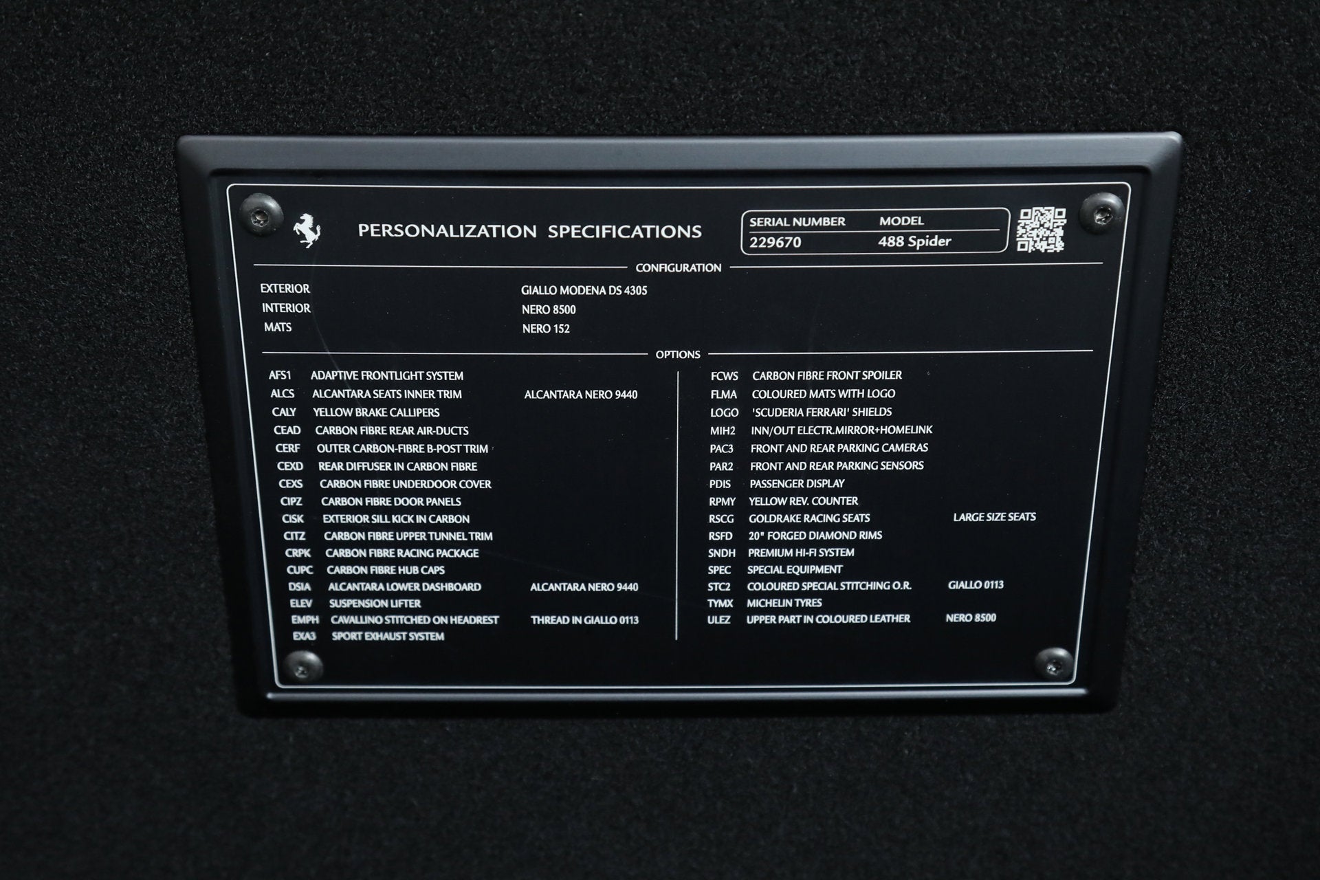 Ferrari 488 Spider - $405,725 MSRP - OVER $121,000 IN OPTIONAL EQUIPMENT - - FERRARI CERTIFIED PRE-OWNED - AVAILABLE EXTENDED FERRARI WARRANTY - - Giallo Modena over Nero - Two Owners - Low Miles - Excellent Condition - Many Fine Options - Expertly Maintained by Our Factory Trained Technicians - Available Extended Ferrari Warranty and Maintenance Plans - Factory Options: - Carbon Fiber Front Spoiler - Carbon Fiber Rear Air Ducts - Carbon Fiber Outer B-Post Trim - Carbon Fiber Rear Diffuser - Carbon Fiber Underdoor Covers - Carbon Fiber Racing Package - Carbon Fiber Racing Seats - Carbon Fiber Driver Zone with LED Steering Wheel - Carbon Fiber Paddles - Carbon Fiber Tach Surround - Carbon Fiber Center Console - Carbon Fiber Dashboard Inserts - Carbon Fiber Door Panels - Carbon Fiber Exterior Sill Kicks - Carbon Fiber Upper Tunnel Trim - Carbon Fiber Wheel Caps - 20-inch Forged Diamond Wheels - Yellow Brake Calipers - Suspension Lifter - Goldrake Racing Seats - Cavallino Stitched to Headrests in Giallo - Special Stitching in Giallo - Alcantara Seat Inner Trims in Nero - Alcantara Lower Dashboard in Nero - Leather Upper Part in Nero - Advanced Frontlight System (AFS) - Sport Exhaust Pipes - Scuderia Ferrari Shields - Inner and Outer Electrochromic Mirrors with HomeLink - Front and Rear Parking Cameras - Front and Rear Parking Sensors - Passenger Display - Yellow Rev Counter - Premium HiFi Sound System - Embroidered Mats with Logo - Vehicle Personalization Plate If you are in the market for a Ferrari 488 Spider, please call or email us today. This Ferrari has passed a multi-point inspection performed by our factory trained technicians, and has been enrolled in the Ferrari Approved Certified Pre-Owned Program. The Certified program makes available up to two years of additional Ferrari Power Approved Warranty coverage. Please see dealer for more details.