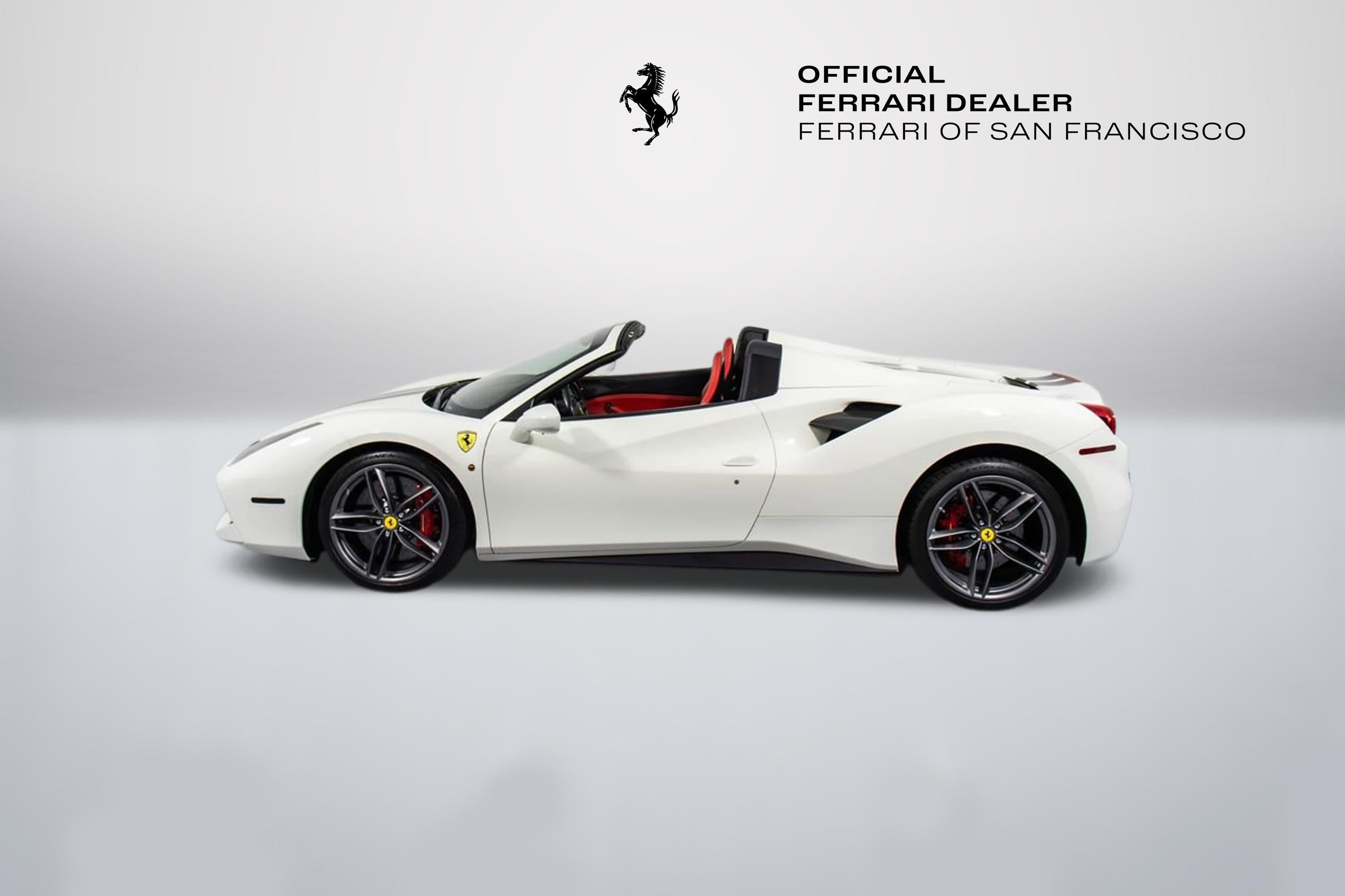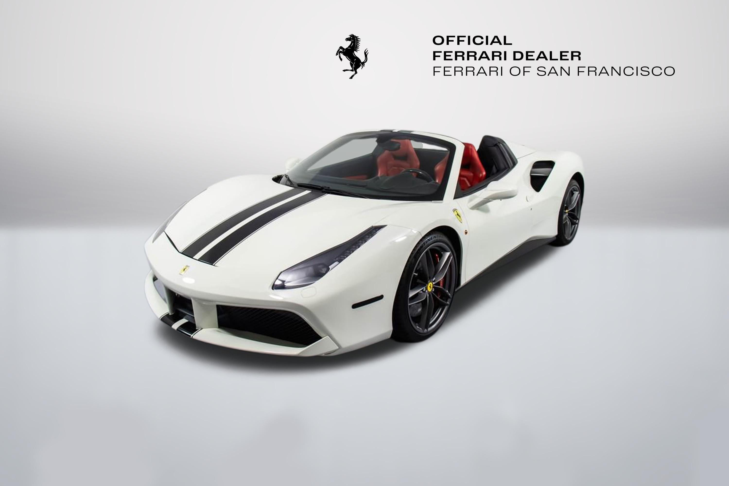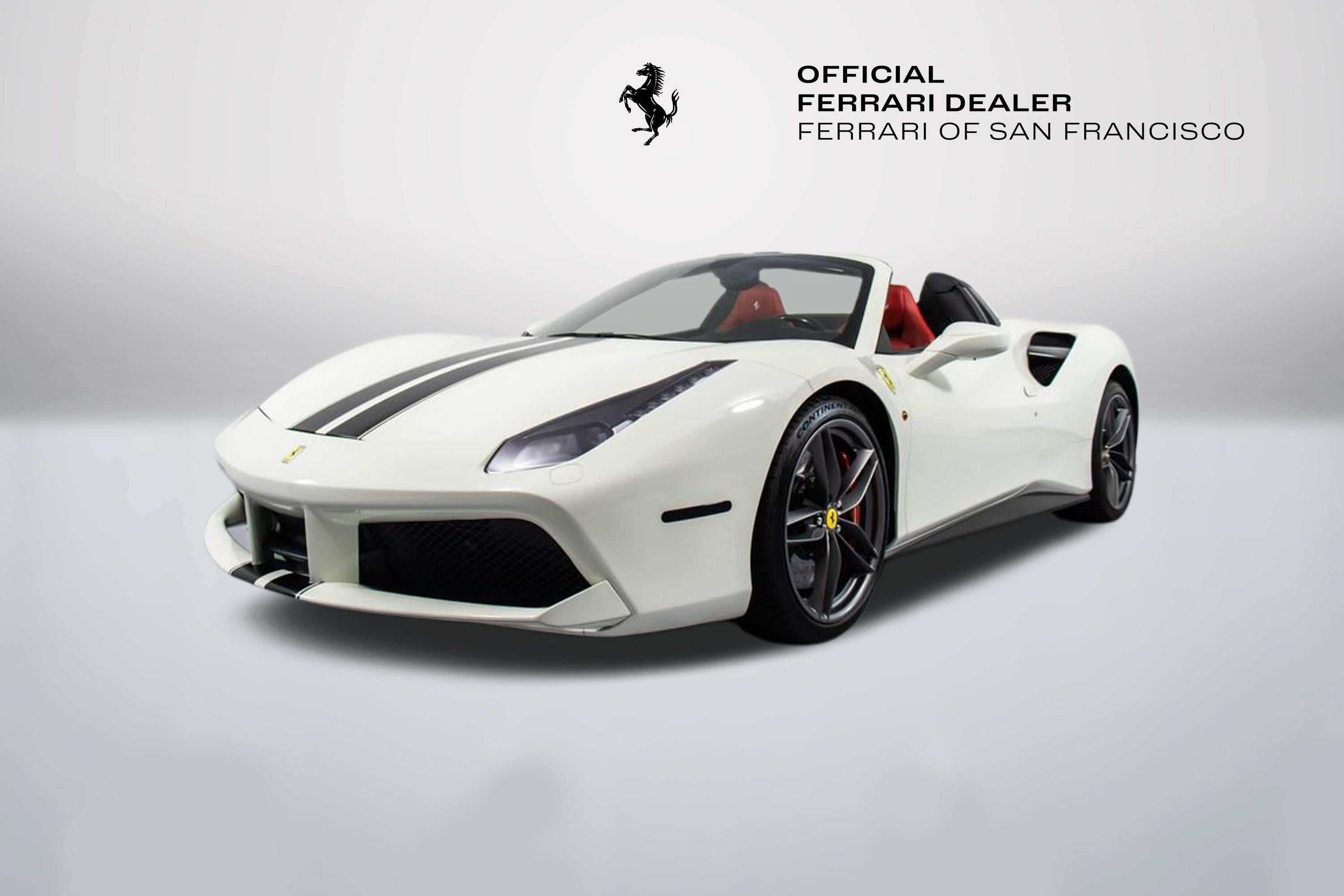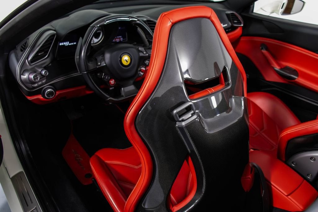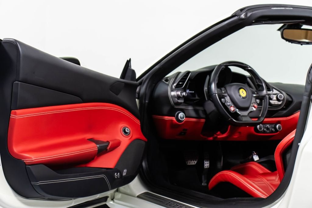 228613 Exterior: Bianco Avus Interior: Rosso Ferrari Mats: Nero 2017 Ferrari 488 Spider Options: Red Brake Calipers Cavallino Stitched on Headrest in Bianco Colored Mats with Logo Carb. Fib. Steering Wheel + LEDS 'Scuderia Ferrari' Shields Inn/Out Electr. Mirror + Home Link 20" Forged Dark Painted Rims White Rev Counter Gold rake Racing Seats Premium Hi-Fi System Colored Special Stitching O.R. in Bianco Finished in stunning Bianco Avus over a striking Rosso Ferrari interior, this 2017 Ferrari 488 Spider delivers an eye-catching combination of elegance and performance. The crisp white exterior is perfectly complemented by red brake calipers, Scuderia Ferrari shields, and 20-inch forged dark painted rims, giving it a bold and sporty presence. Inside, the cabin is a true drivers cockpit, featuring rare Goldrake racing seats, a white rev counter, and a carbon fiber steering wheel with integrated LEDs, all accented by Bianco contrast stitching and a matching Cavallino stitched on the headrests. Equipped with premium touches such as a high-end Hi-Fi system, HomeLink, and electrochromic mirrors, this 488 Spider offers both luxury and everyday usability. Blending open-top exhilaration with iconic Ferrari styling, this beautifully specd example is the perfect balance of performance, craftsmanship, and unmistakable Italian flair.